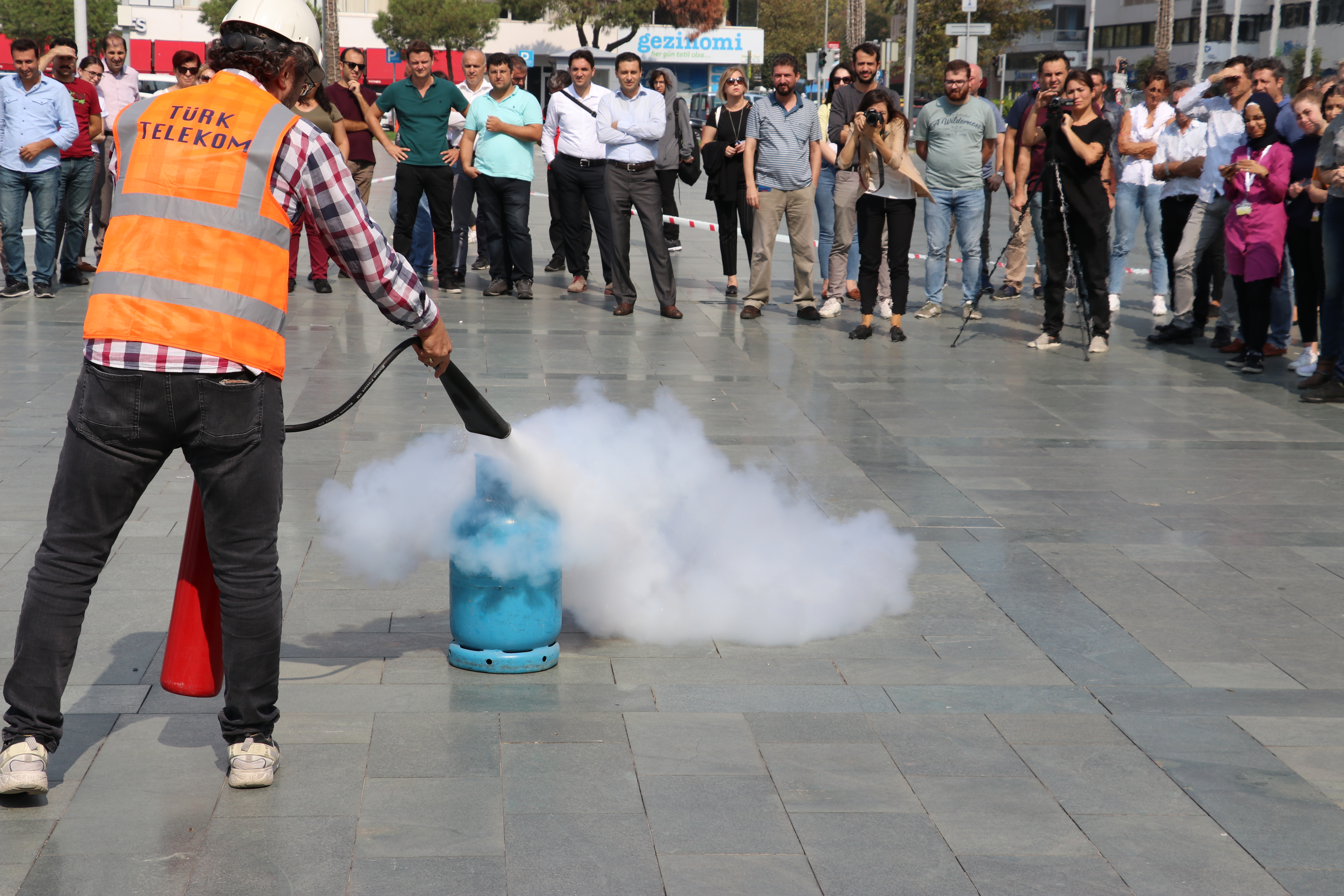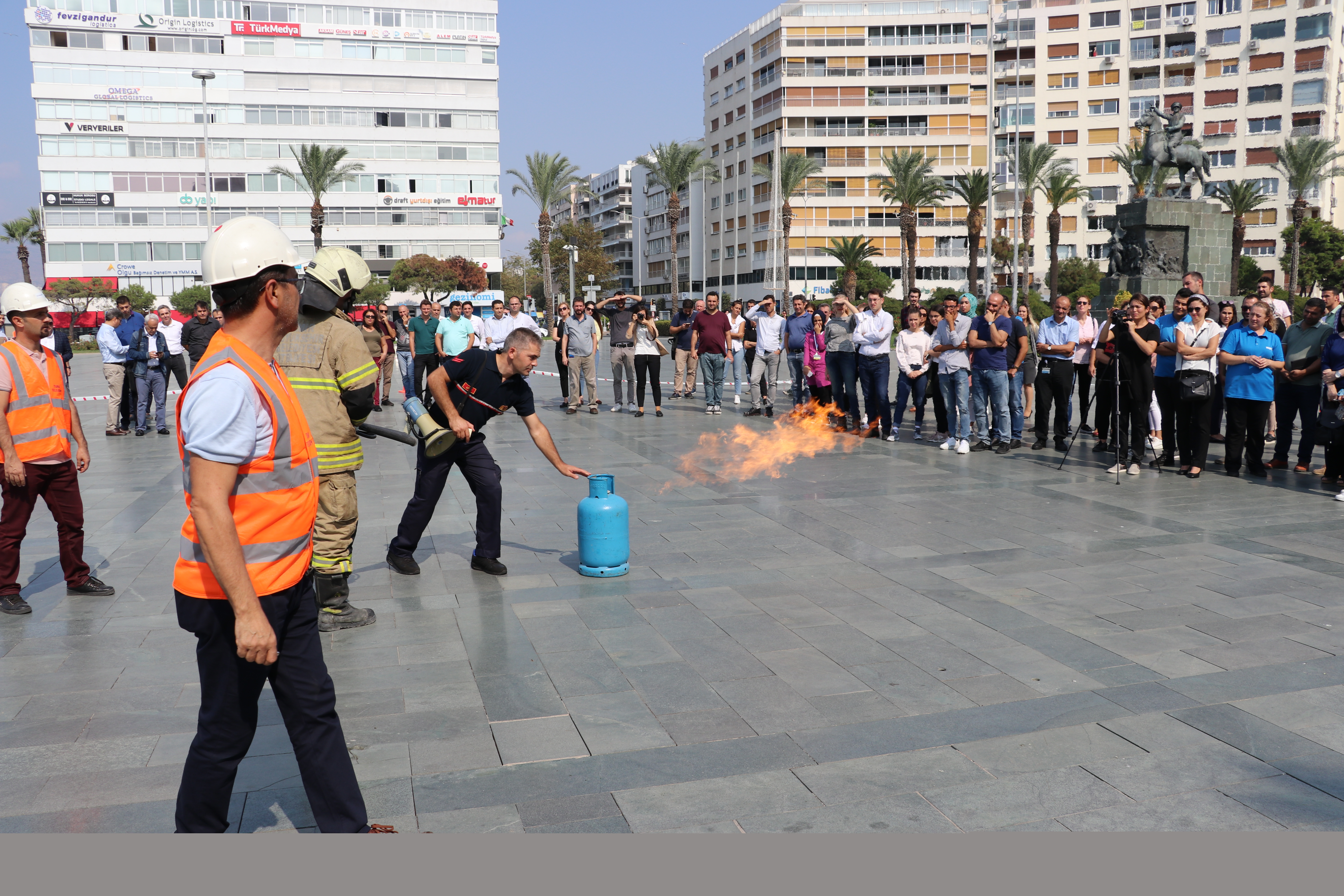 Sonrasında Cumhuriyet Meydanında toplanan çalışanlara itfaiye çavuşu Muharrem Aktop bilgi verdi.