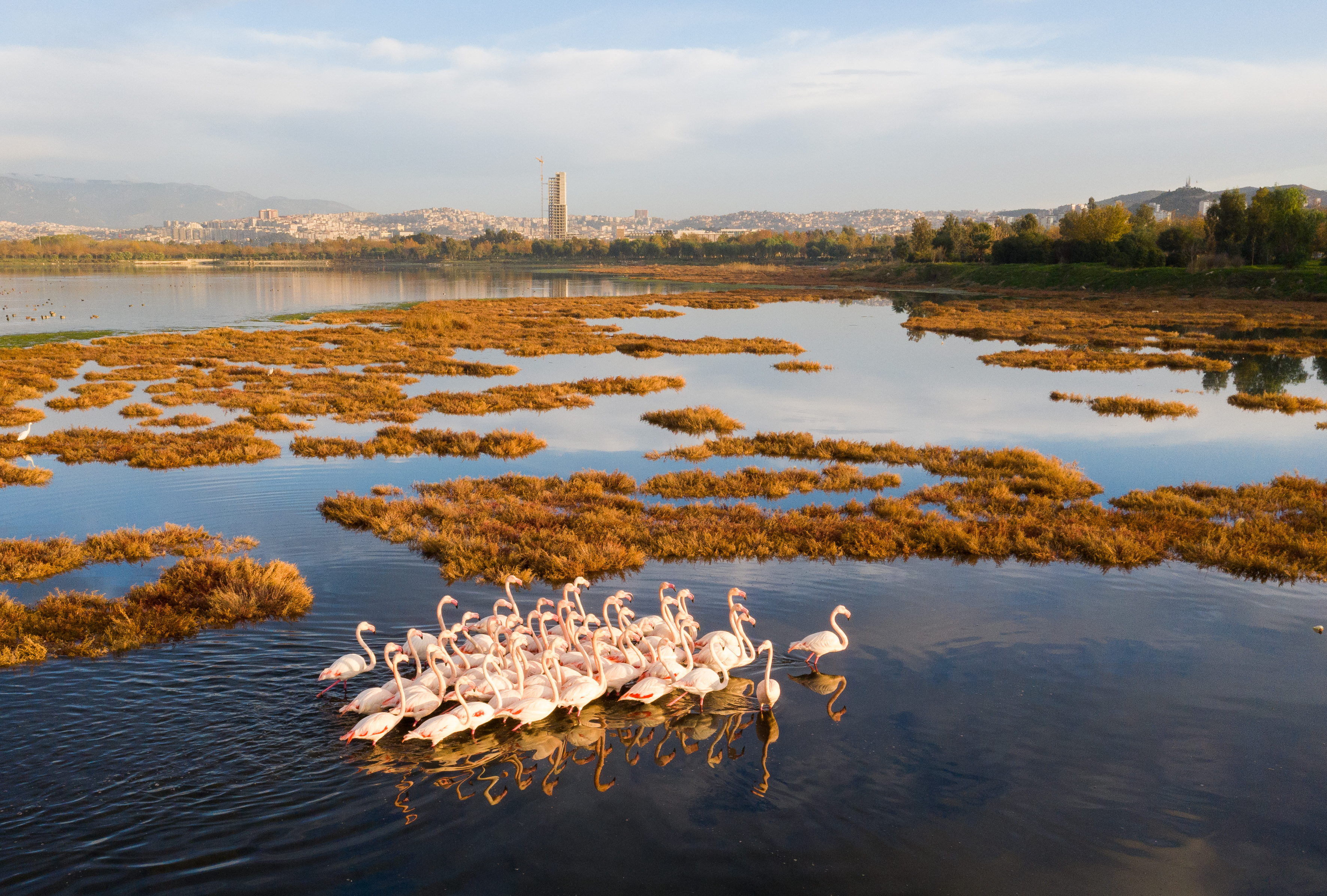İzmir'de İnciraltı sahilinde bulunan Çakalburnu Lagünü, pembe beyaz görüntüsüyle ilgi çeken flamingoların evi haline geldi.