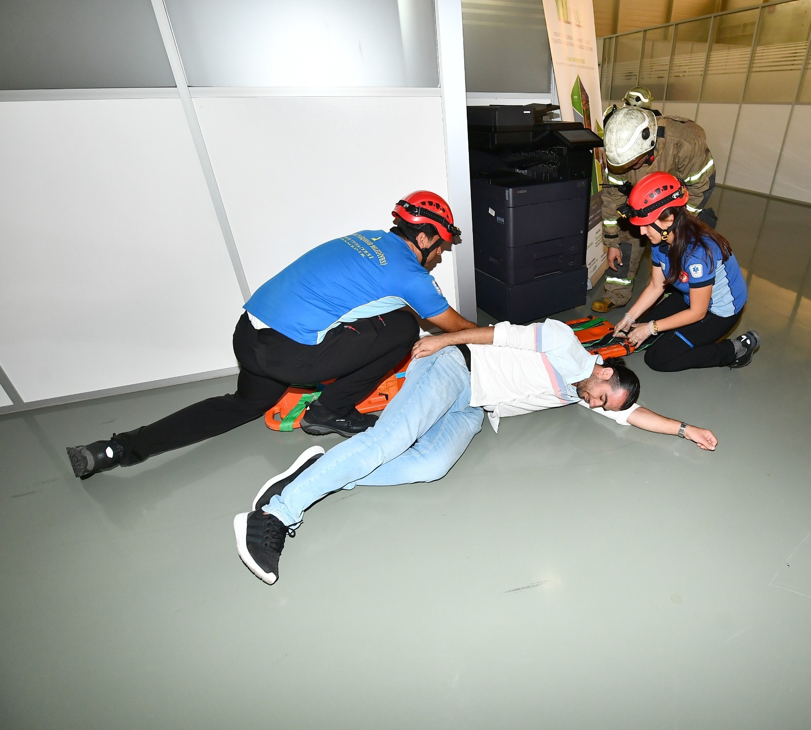 Senaryo gereği dumandan etkilenen bazı çalışanlar, İtfaiye Dairesi Başkanlığı’na bağlı paramedikler tarafından dışarıya sedyeyle çıkarıldı.