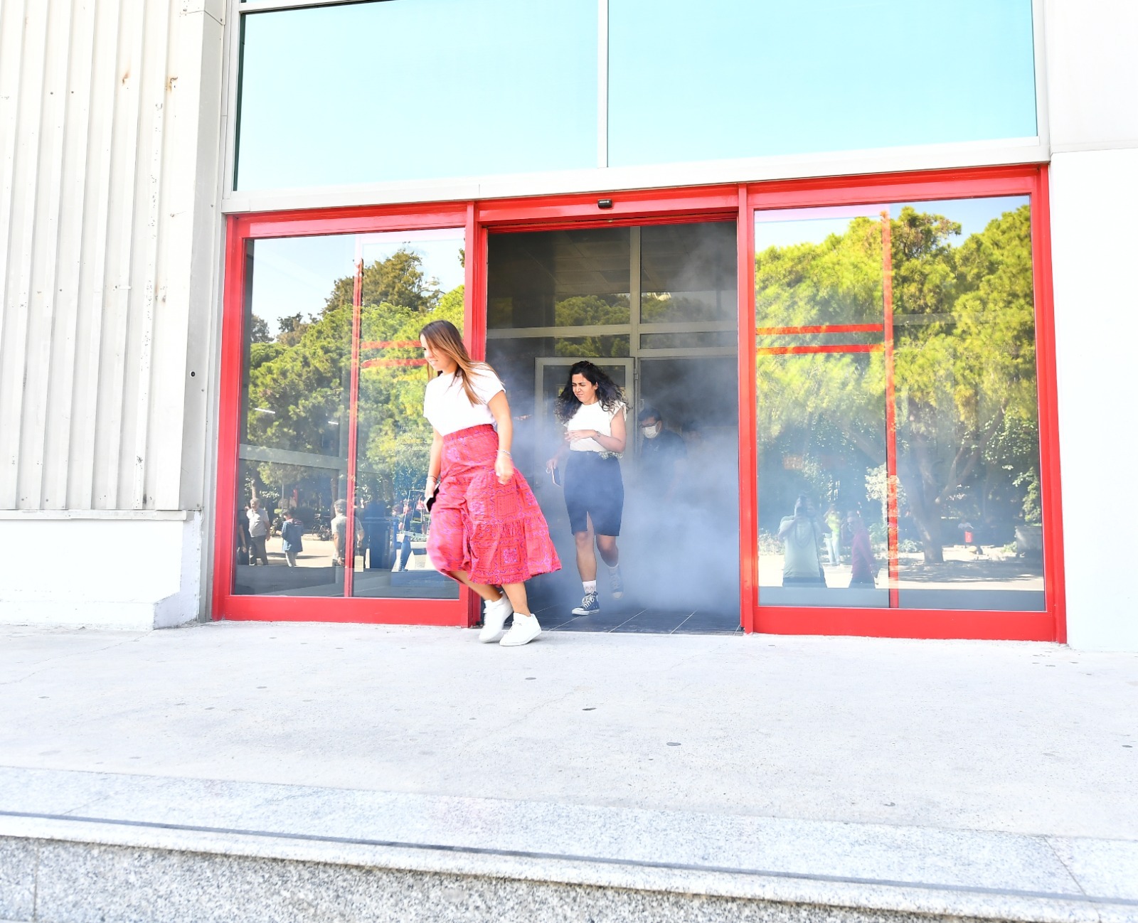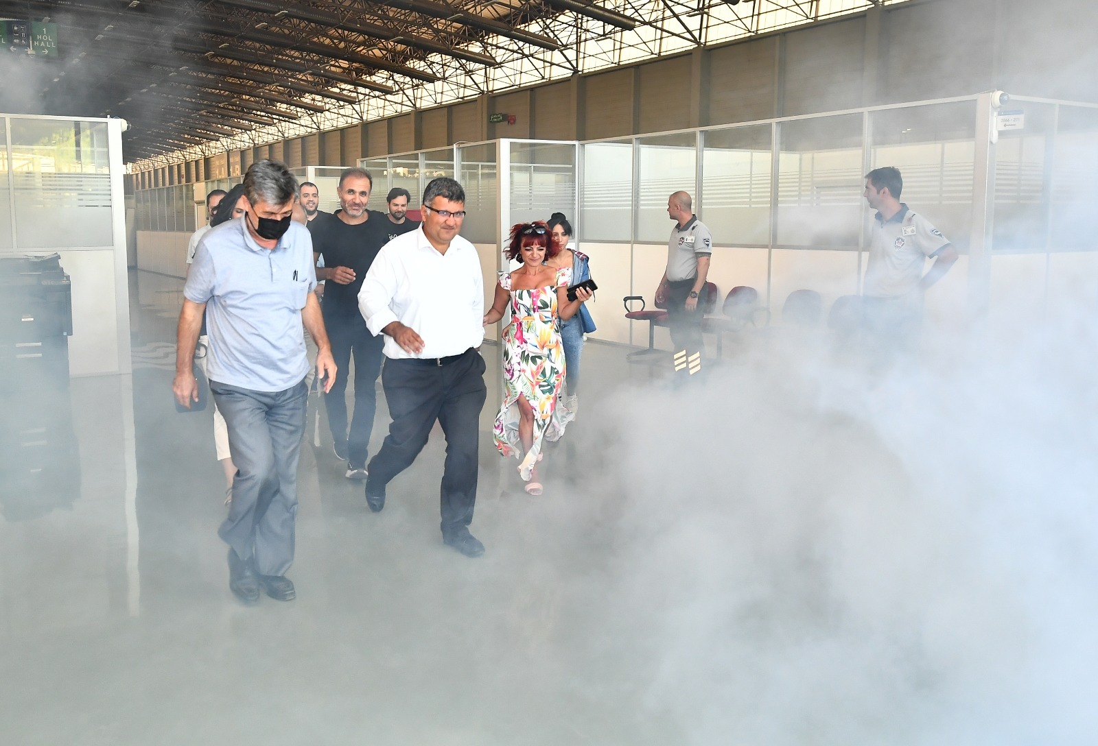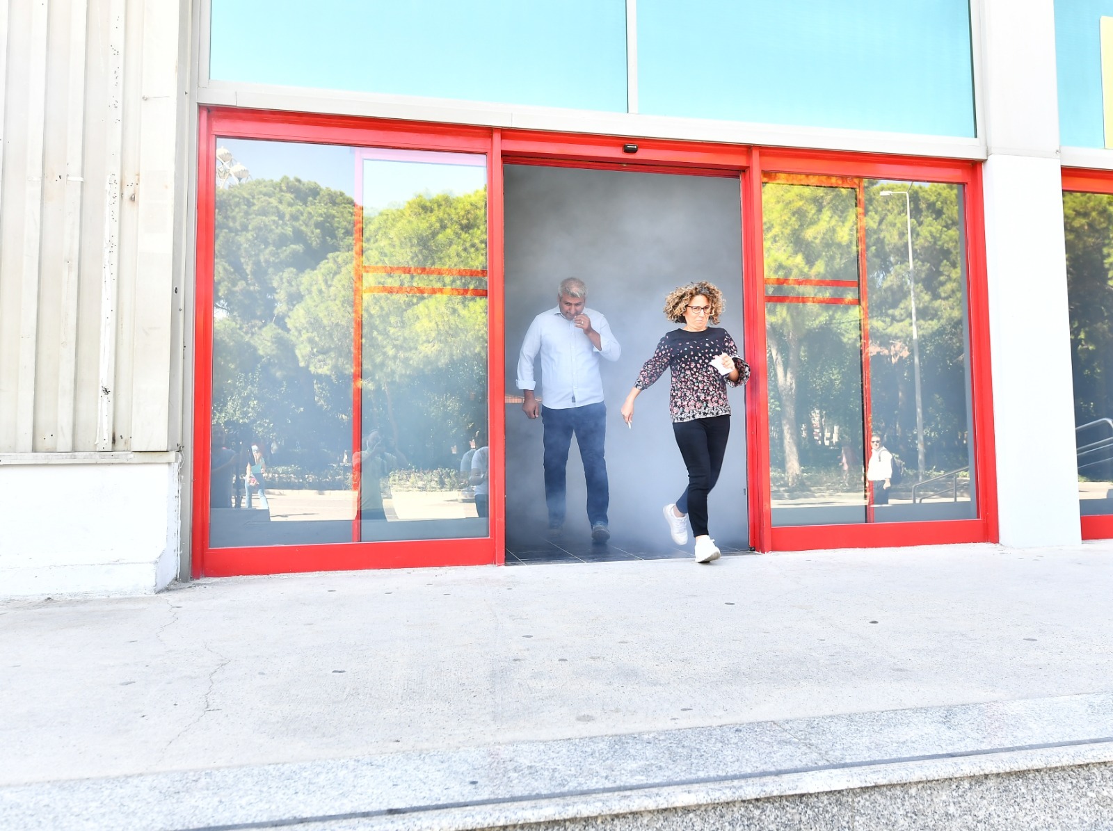 İzmir Büyükşehir Belediyesi İnsan Kaynakları Dairesi Başkanlığı İş Sağlığı ve Güvenliği Şube Müdürlüğü, Kültürpark’taki hizmet birimlerinde yangın tatbikatı düzenledi. Sis makineleriyle yapay duman üretilen binada, sirenlerin çalmasıyla tatbikat başladı.