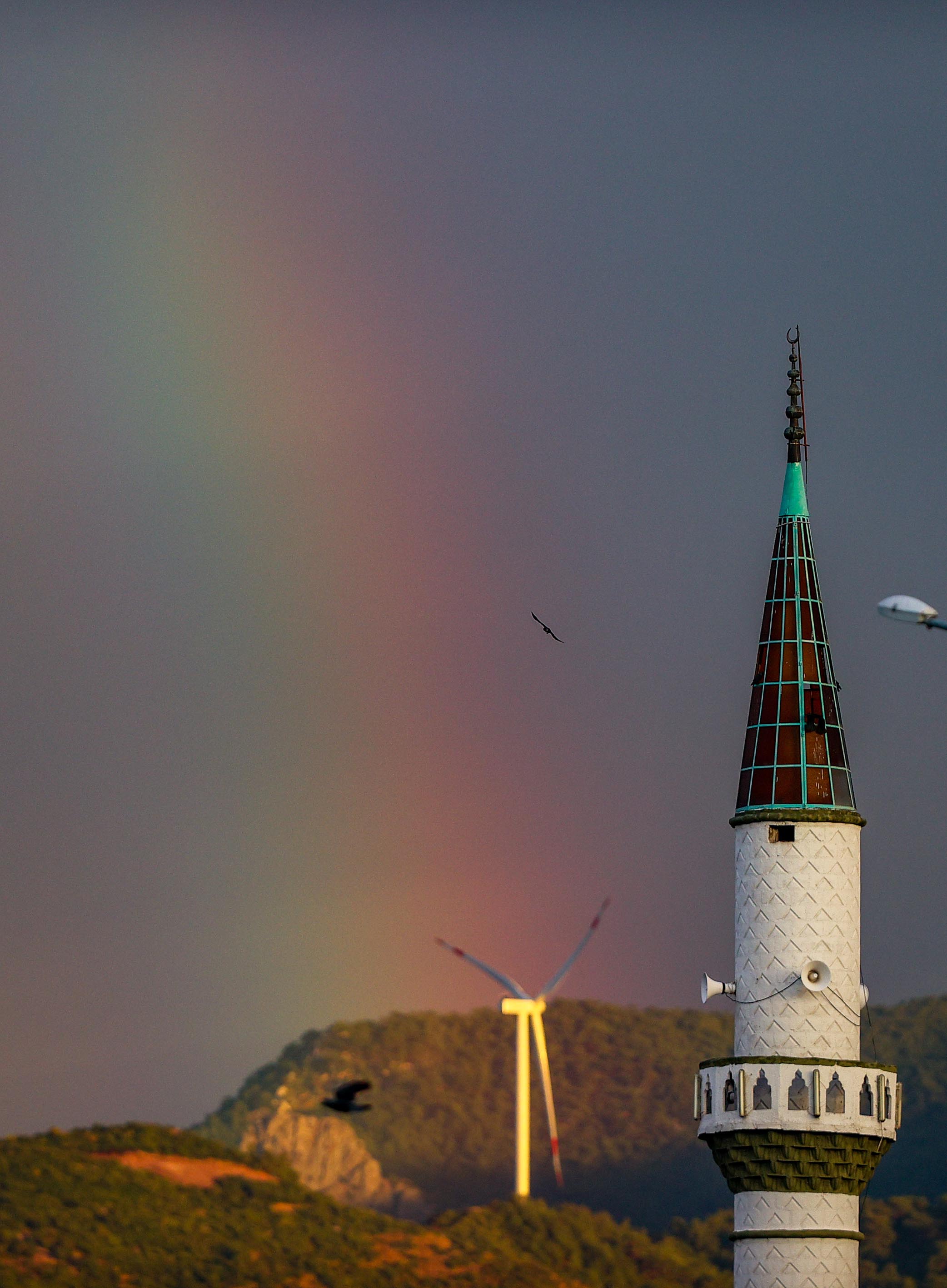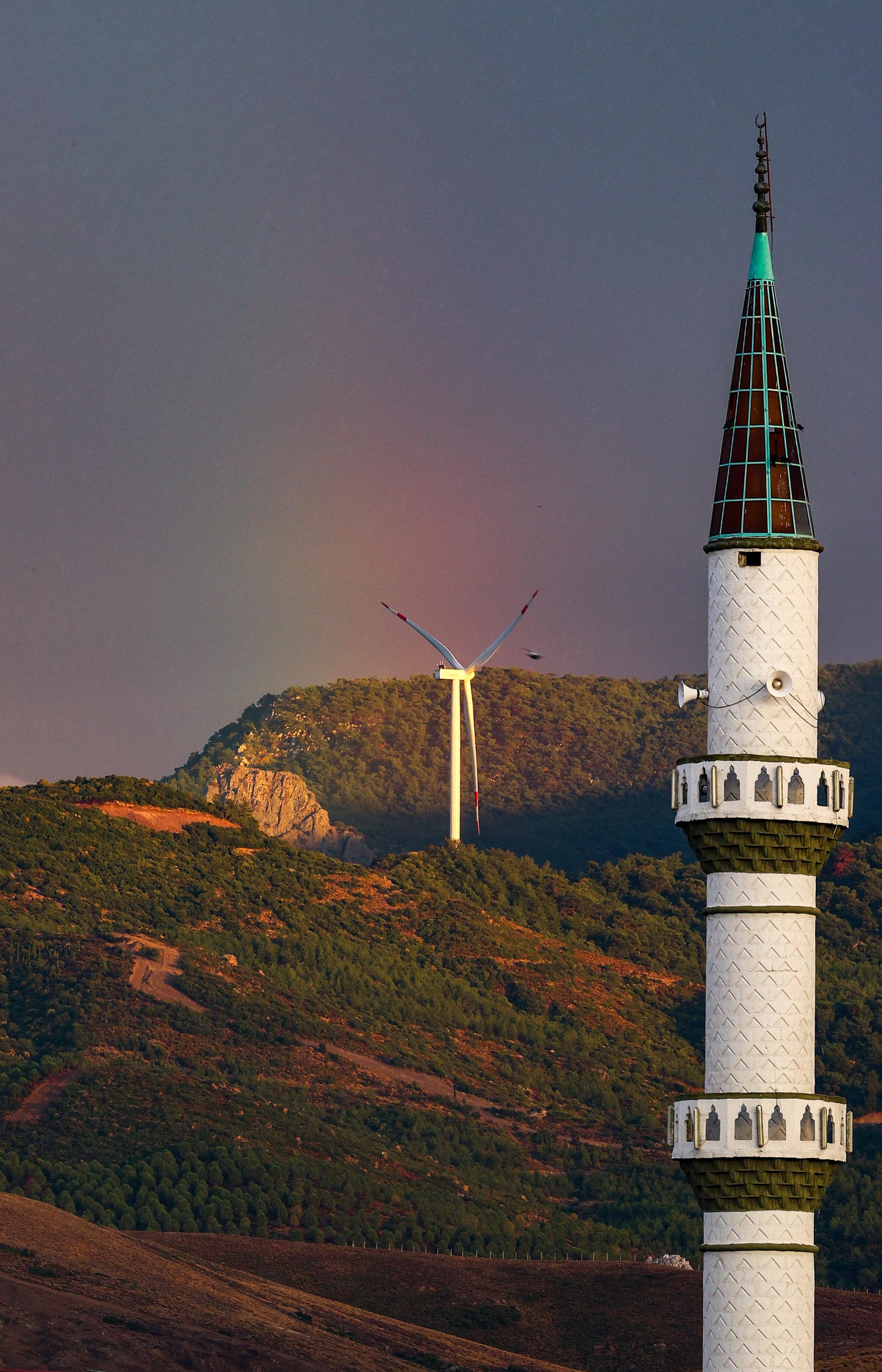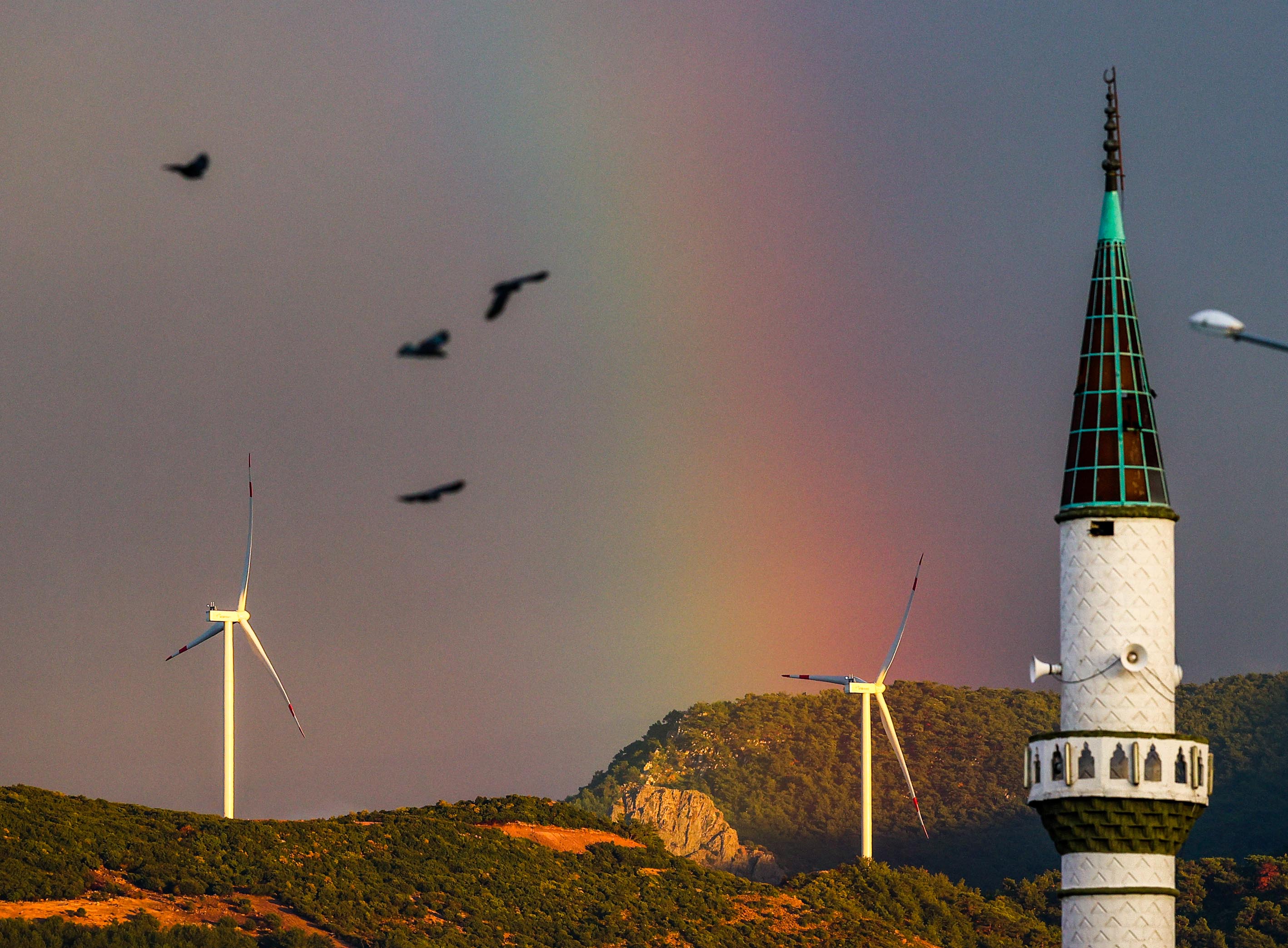 İzmir'in Menemen ilçesinde yağmurun ardından beliren gökkuşağı güzel görüntü oluşturdu.