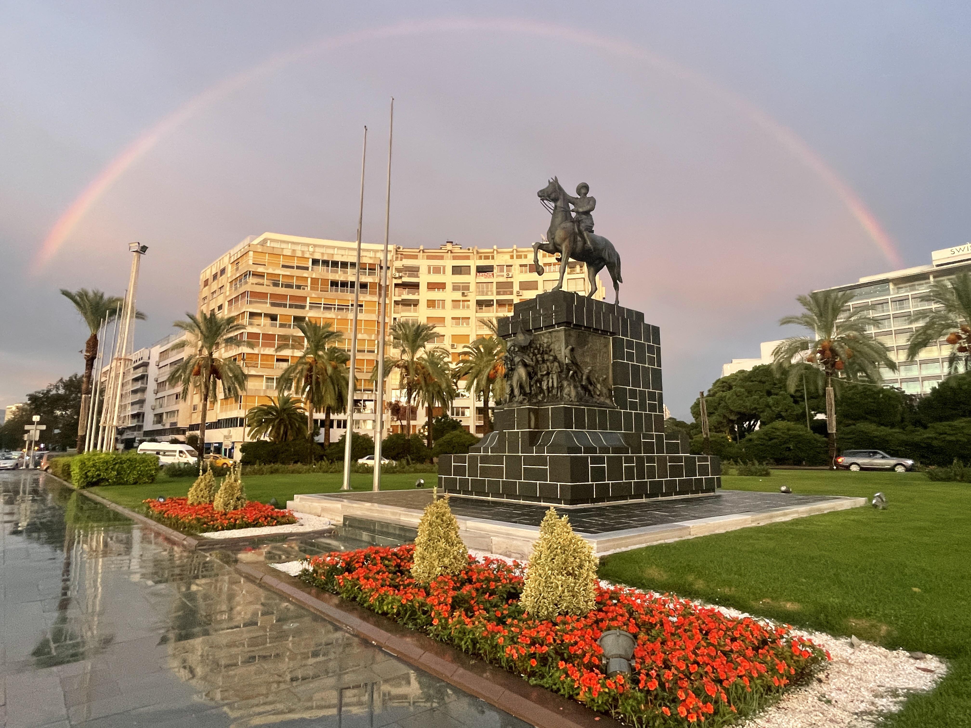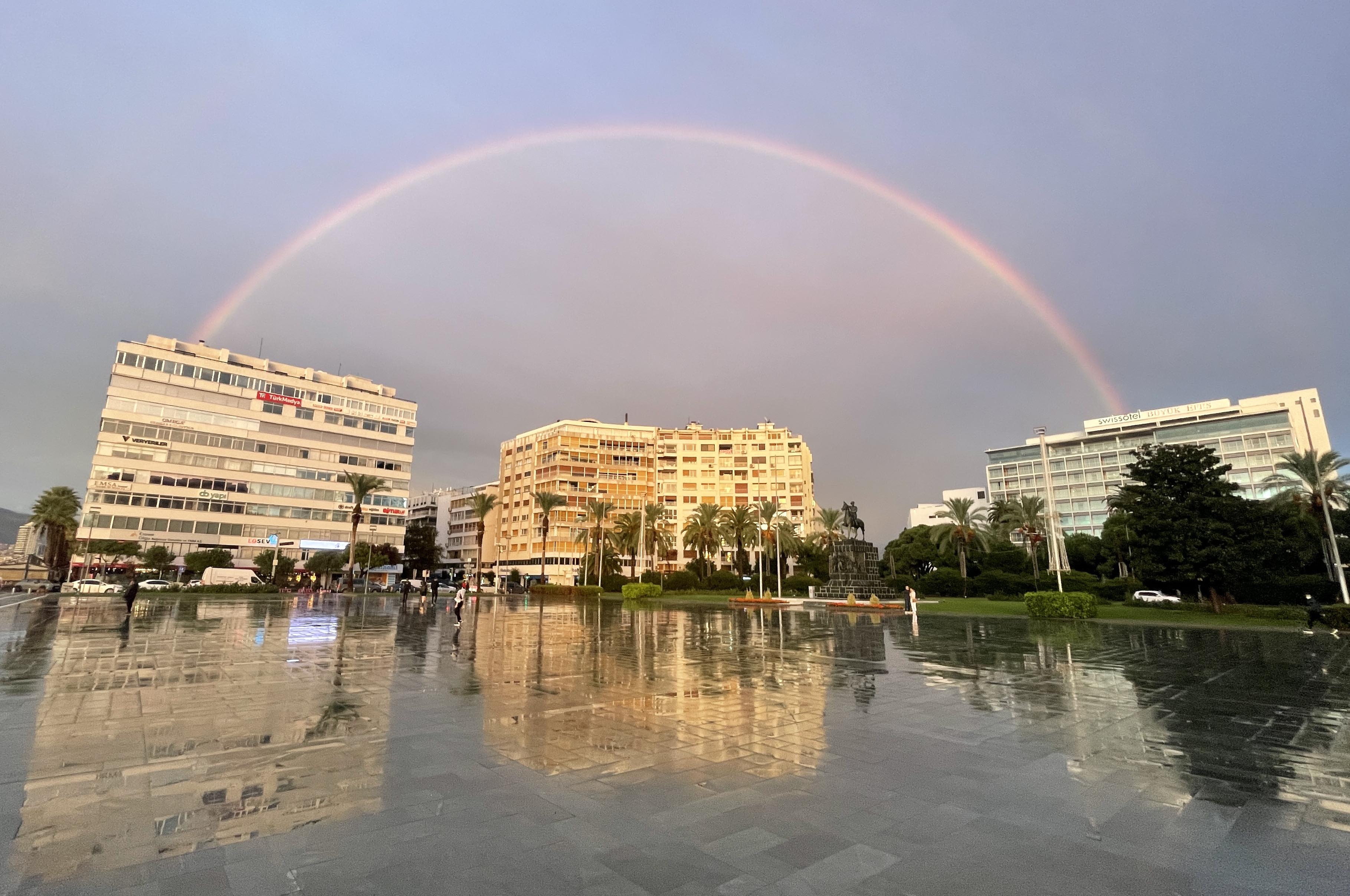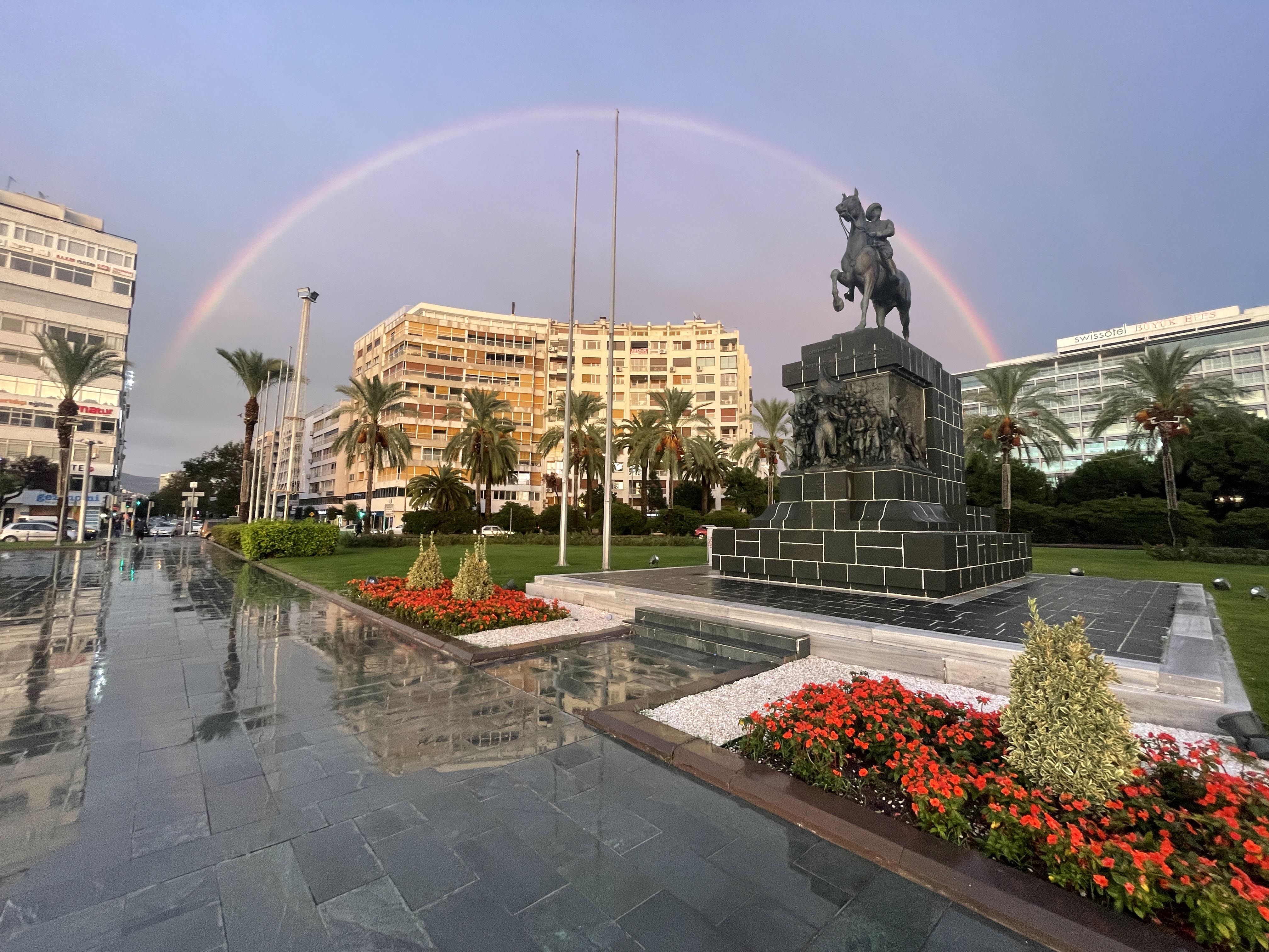 İzmir'de yağmurun ardından beliren gökkuşağı Cumhuriyet Meydanı'nda güzel görüntü oluşturdu.
