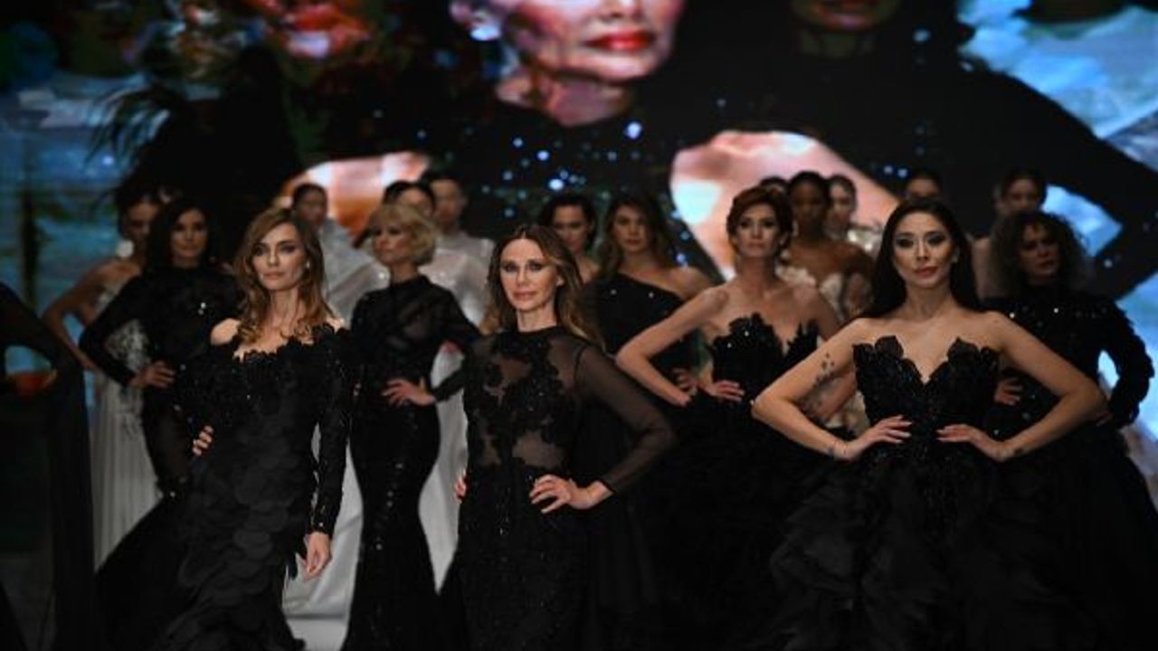 Fuarizmir'de dün başlayan fuarın galasında bir firmanın tasarladığı 2024 abiye kreasyonu, 1990'lı yılların ünlü mankenlerinin de görev aldığı defileyle tanıtıldı.