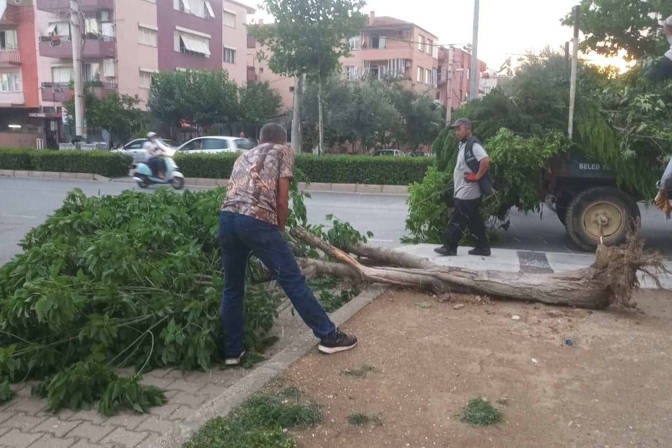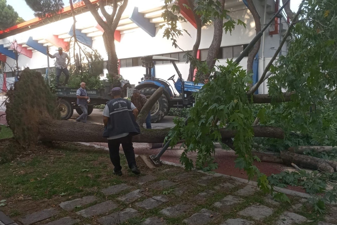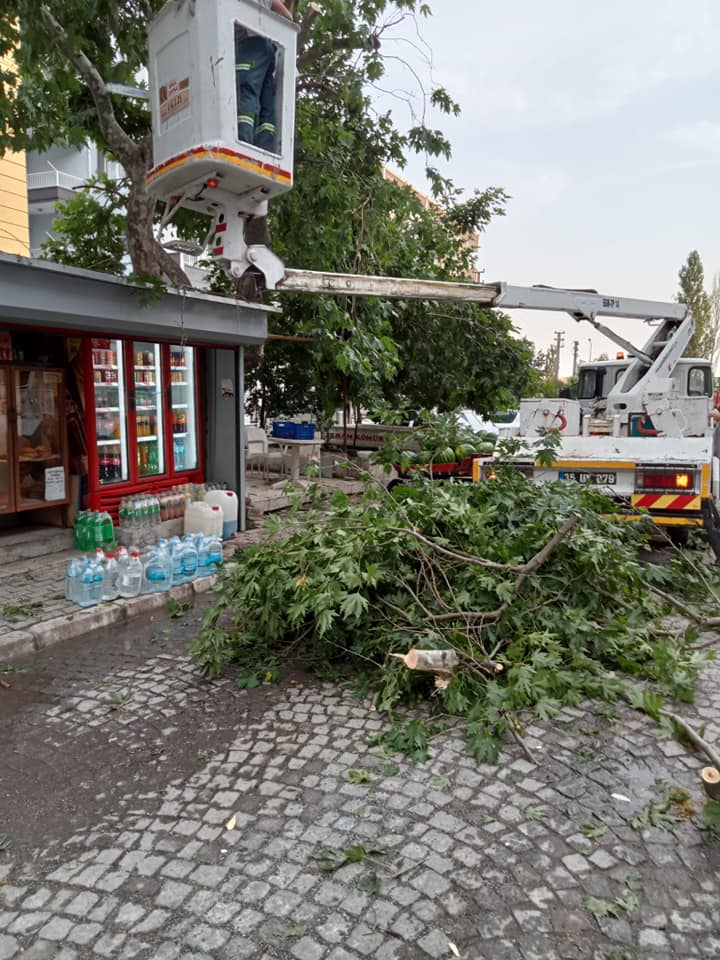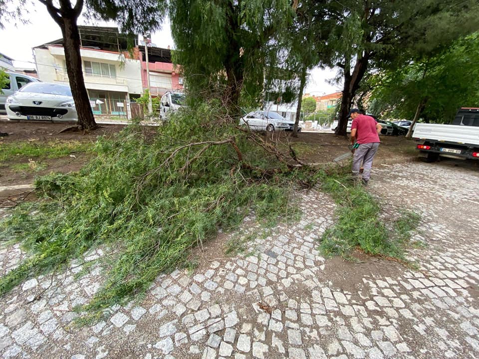 Devrilen ağaçlar belediye ekipleri tarafından toplanarak devrilme riski olan ağaçlar budandı.