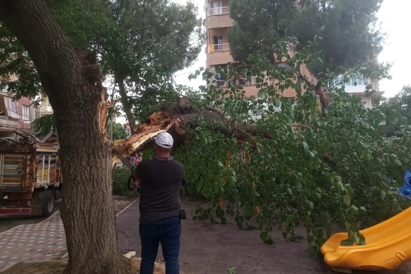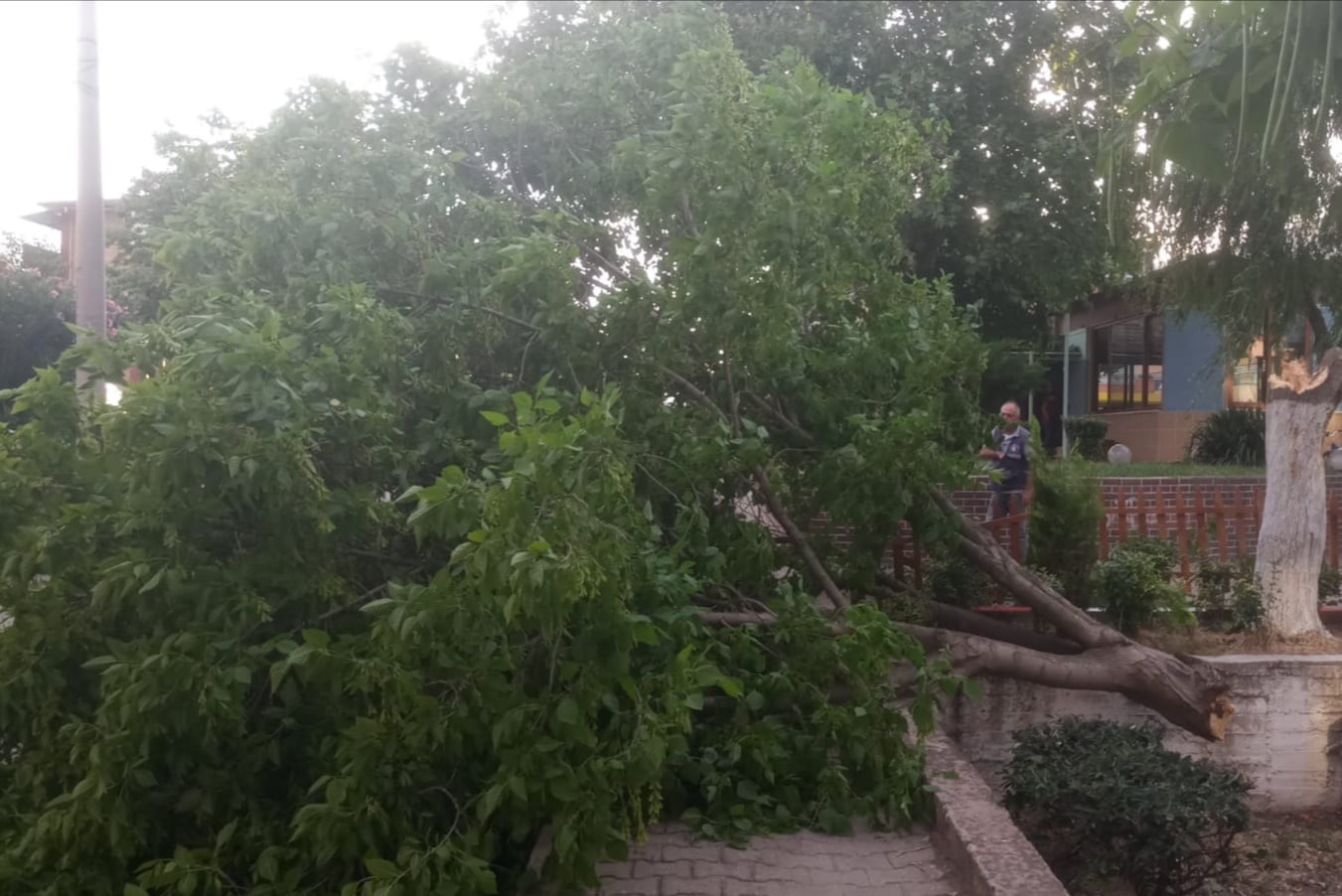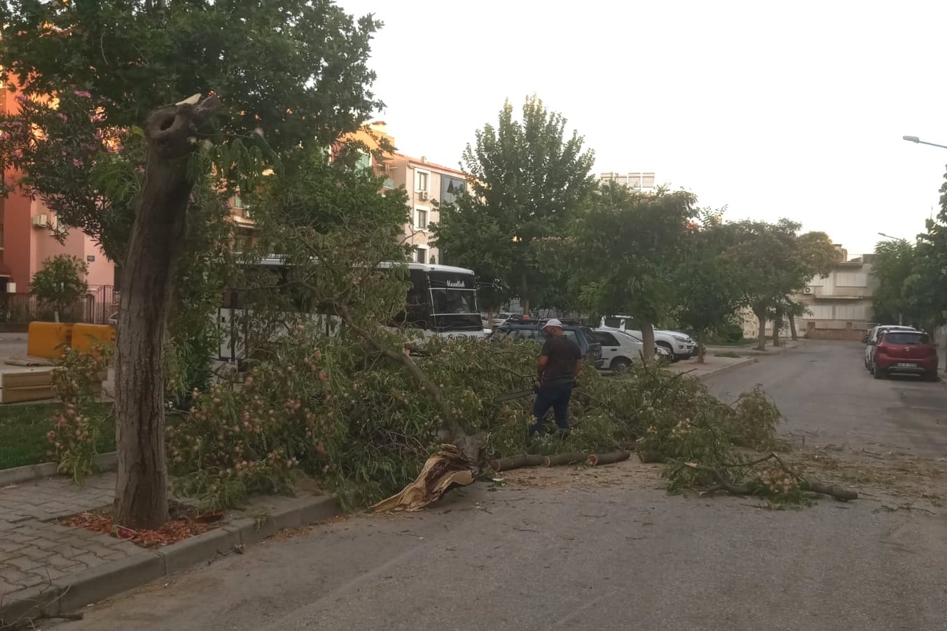 Devrilen ağaçlar belediye ekipleri tarafından toplanarak devrilme riski olan ağaçlar budandı.