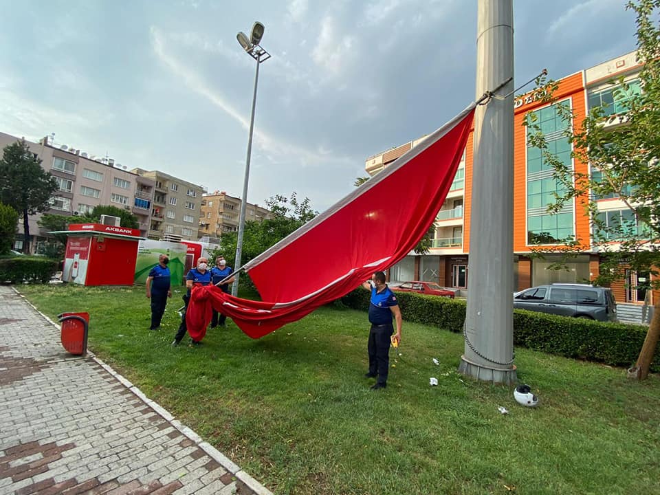 Öte yandan Bergama'da fırtına nedeniyle zarar gören Türk Bayrağı belediye ekipleri tarafından yenisiyle değiştirildi.