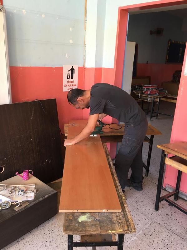 “Çocuklar bir şeyleri kesmeyi, yapıştırmayı, boyamayı, yeni şeyler üretmeyi çok seviyorlar. Bu becerilerinin sonuna kadar desteklenmesinden yanayım. Sınıf içerisinde sabit bir atölye masası olması uzun zamandır beni heyecanlandıran bir fikirdi. O yüzden üretim masası oluşturduk. Kitaplar öğrenmede çok önemli. Bu yüzden her an ulaşılabilir olmalı ve çocukların beklentilerine cevap verebilmeli. İş değişikliği yapan bir arkadaşım ofisinden çıkan bazı mobilyaları sınıfımda kullanmak üzere verebileceğini söyledi. Bu parçalarla sınıftan ayrılmış, rahatça oturup kitap okunabilen, sınıf içinde küçük bir butik kütüphane yaptık. Öğrencilerimizin kendilerine ait dolapları yoktu. Yine edindiğimiz malzemelerden öğrenci dolabı ve sergi panoları yaptık. Öğrenciler buralara eşyalarını koyabilecekler ya da ürettikleri ürünleri burada sergileyebilecekler."
