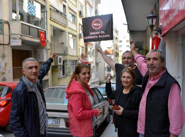 İzmir'in Konak ilçesi Göztepe semtinde, trafik akışının yoğun olduğu sokakta, sürücülerin korna çalarak oluşturduğu gürültü kirliliğinden rahatsız olan mahalleli, çareyi afiş asmakta buldu.