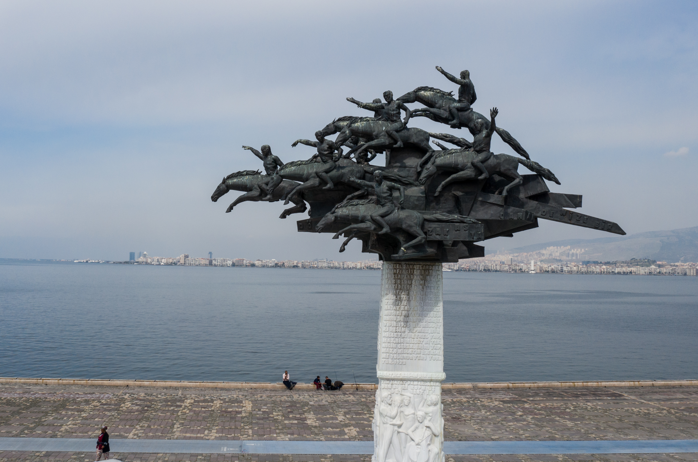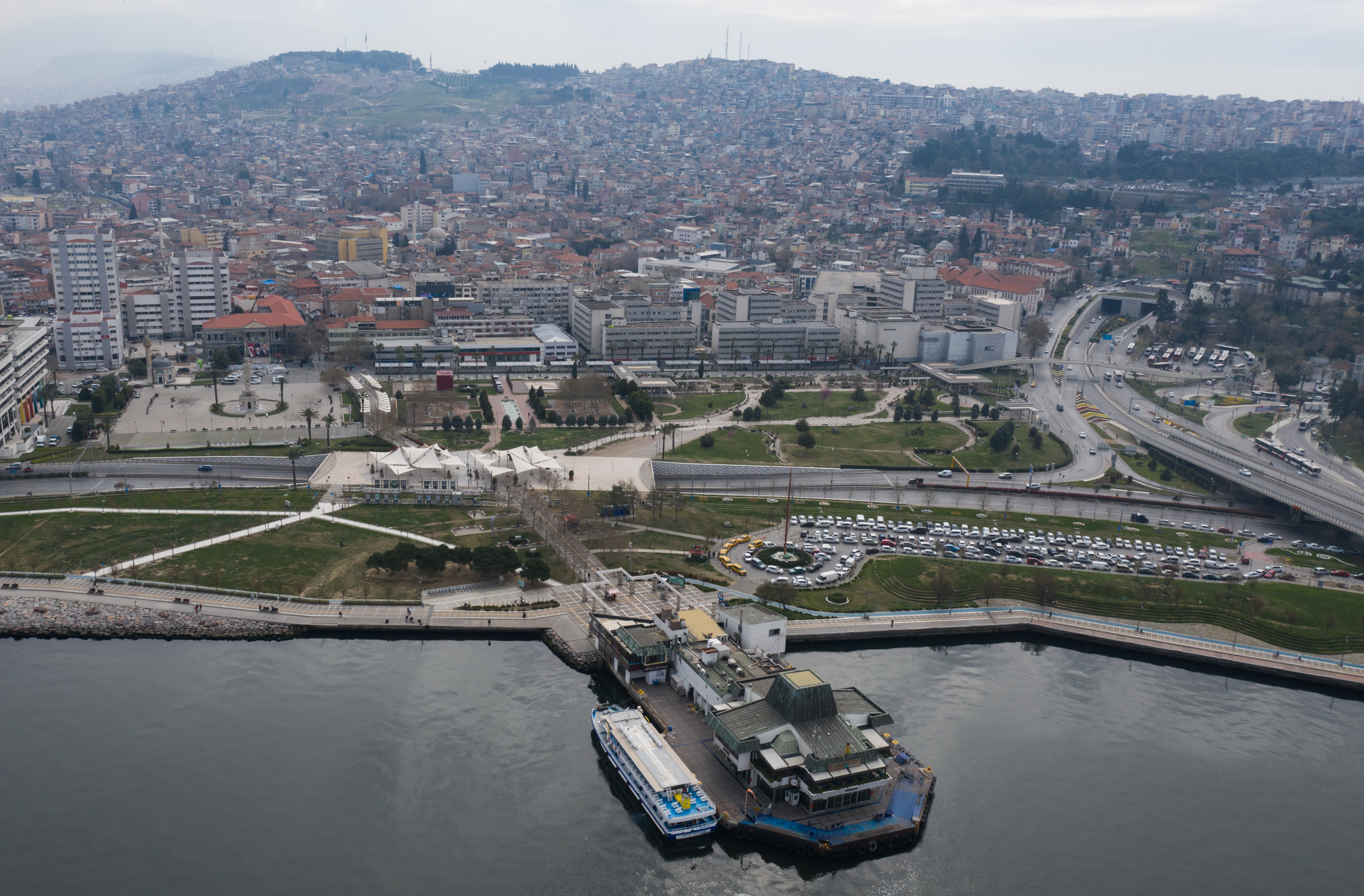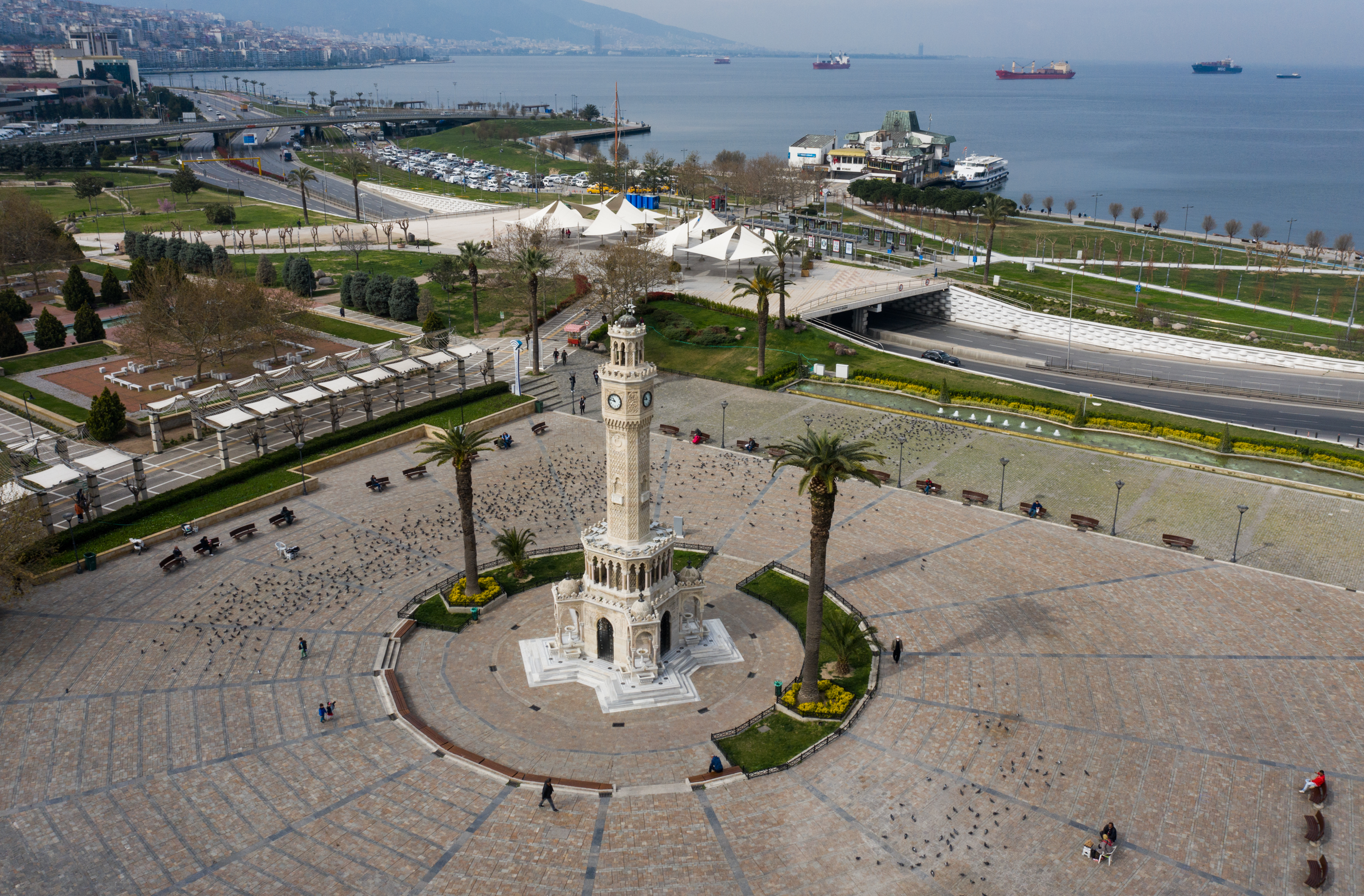 İzmir'de yeni tip koronavirüs (Kovid-19) tedbirleri kapsamında "Evde kal" çağrısına uyulması ve 65 yaş ile üstündekilere getirilen sokağa çıkma kısıtlaması sonucu normalde yoğunluğun yaşandığı tarihi Saat Kulesi, Kordon Boyu ve Karşıyaka Anıt çevresi boş kaldı.