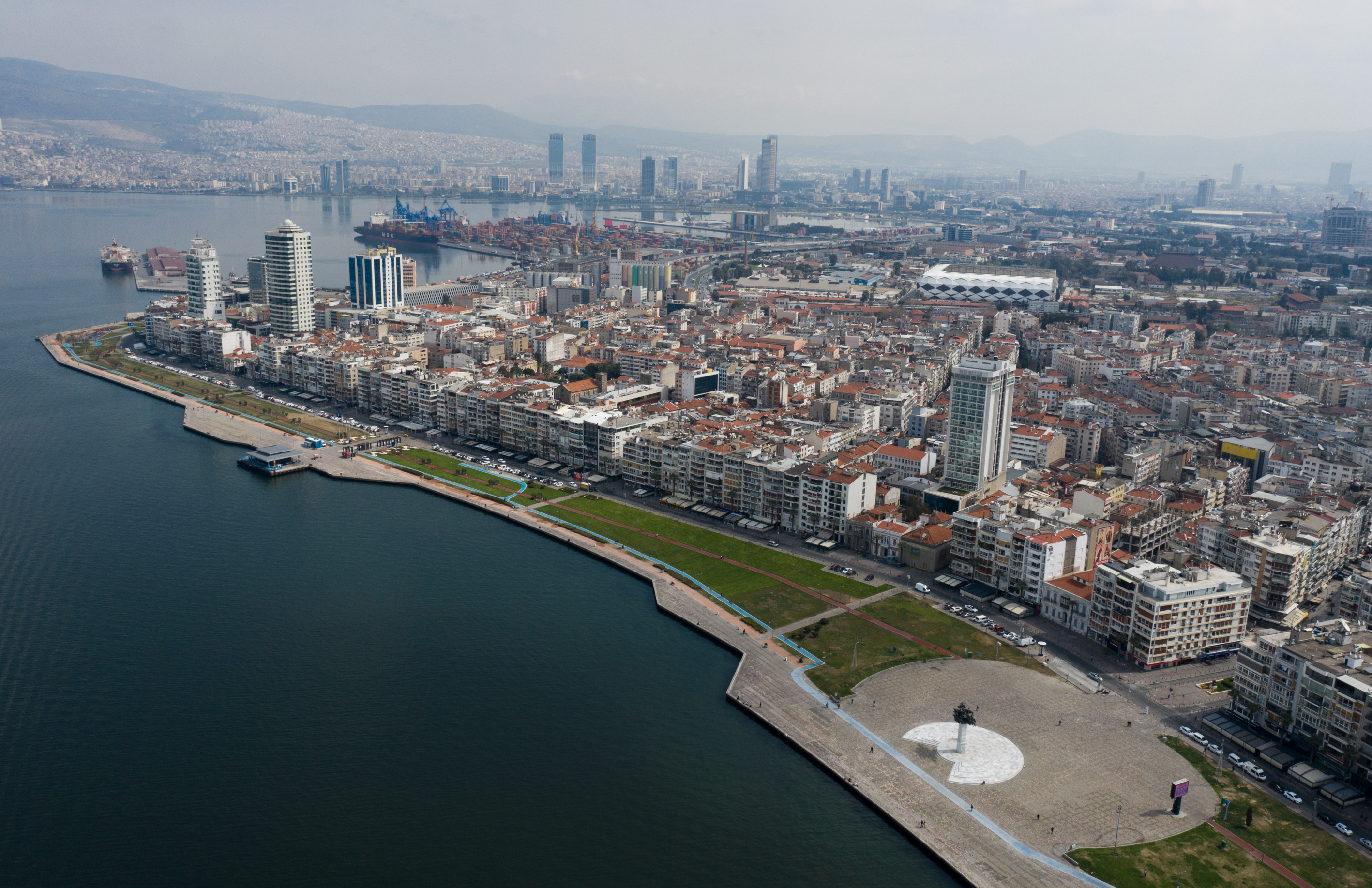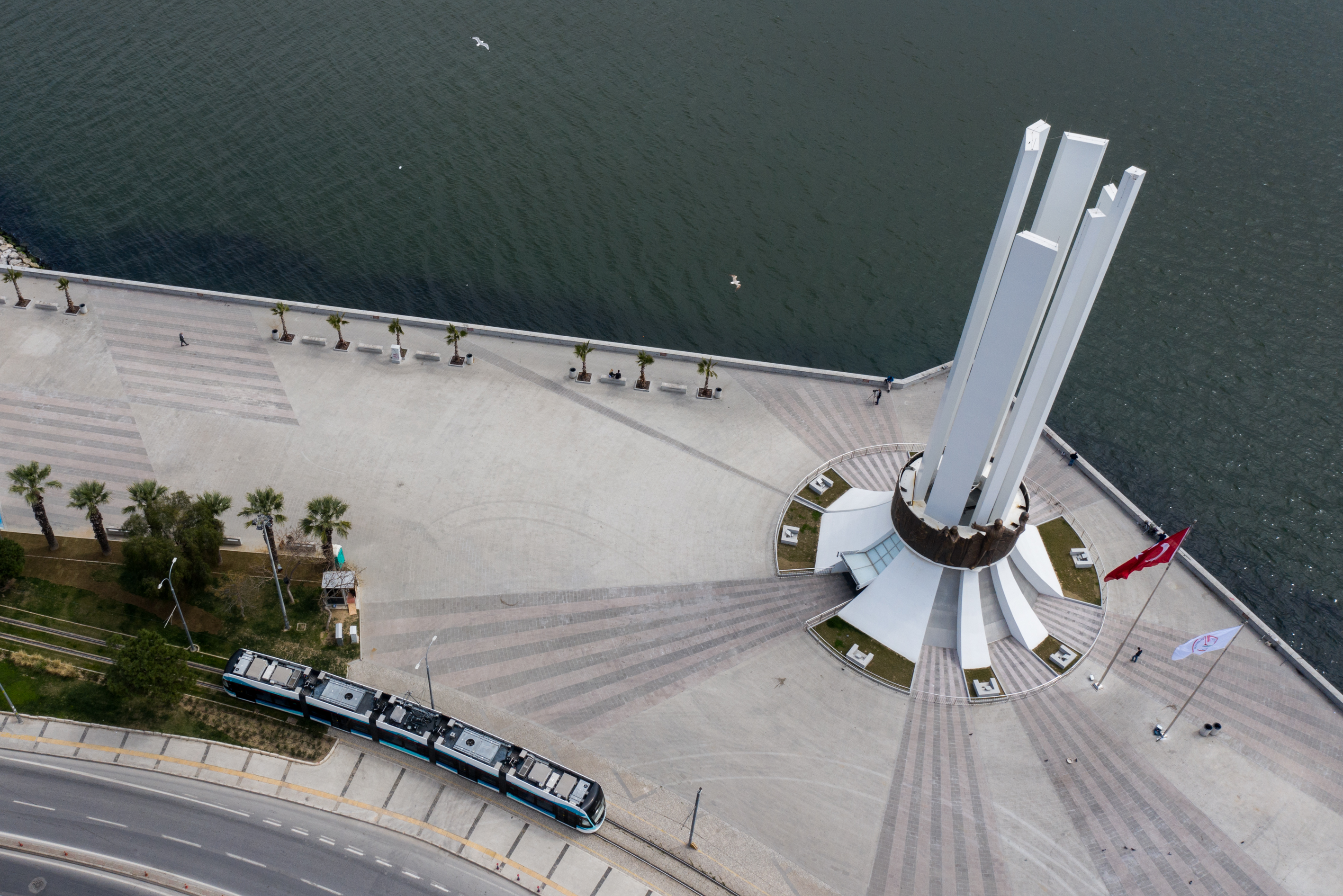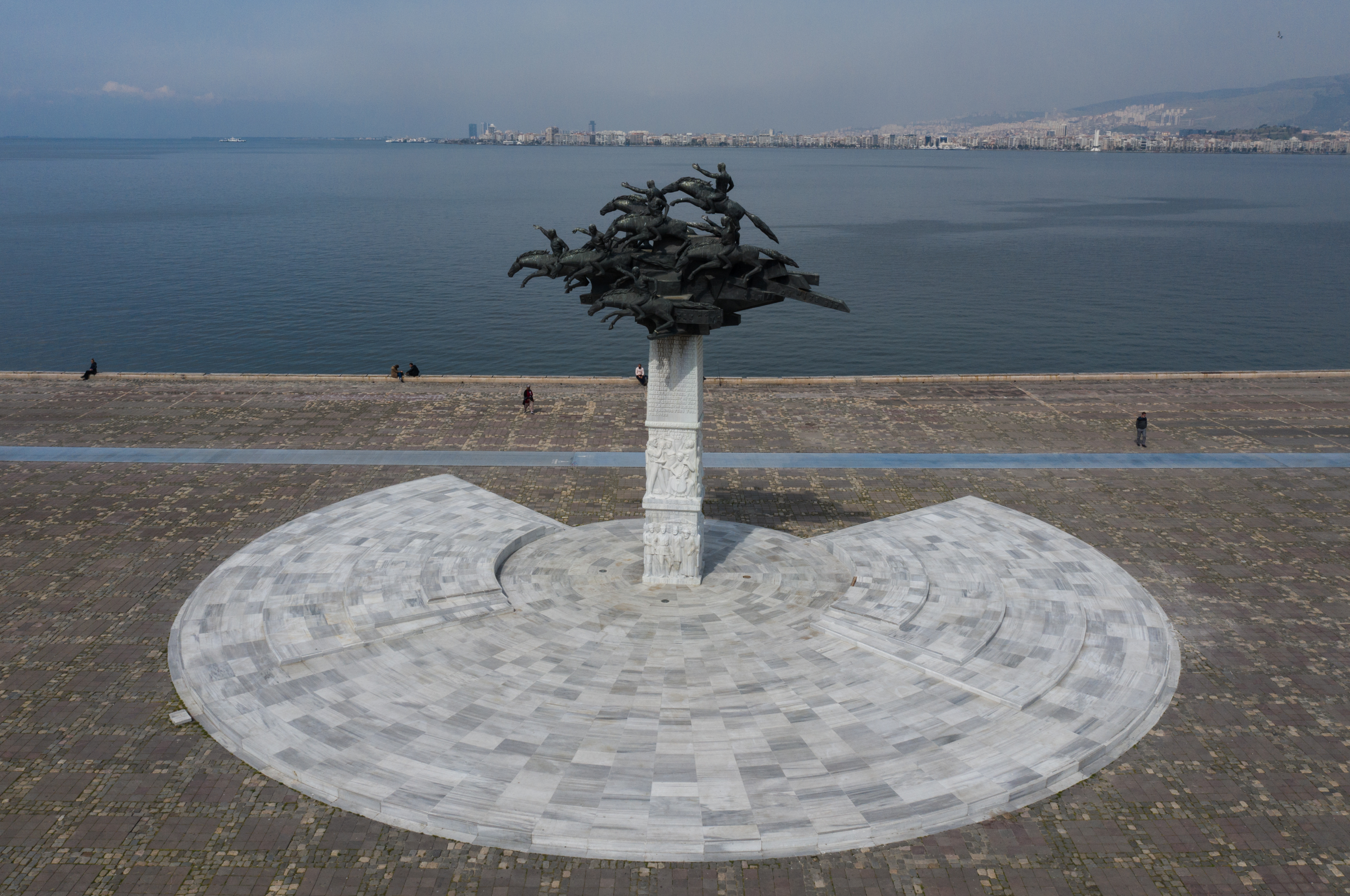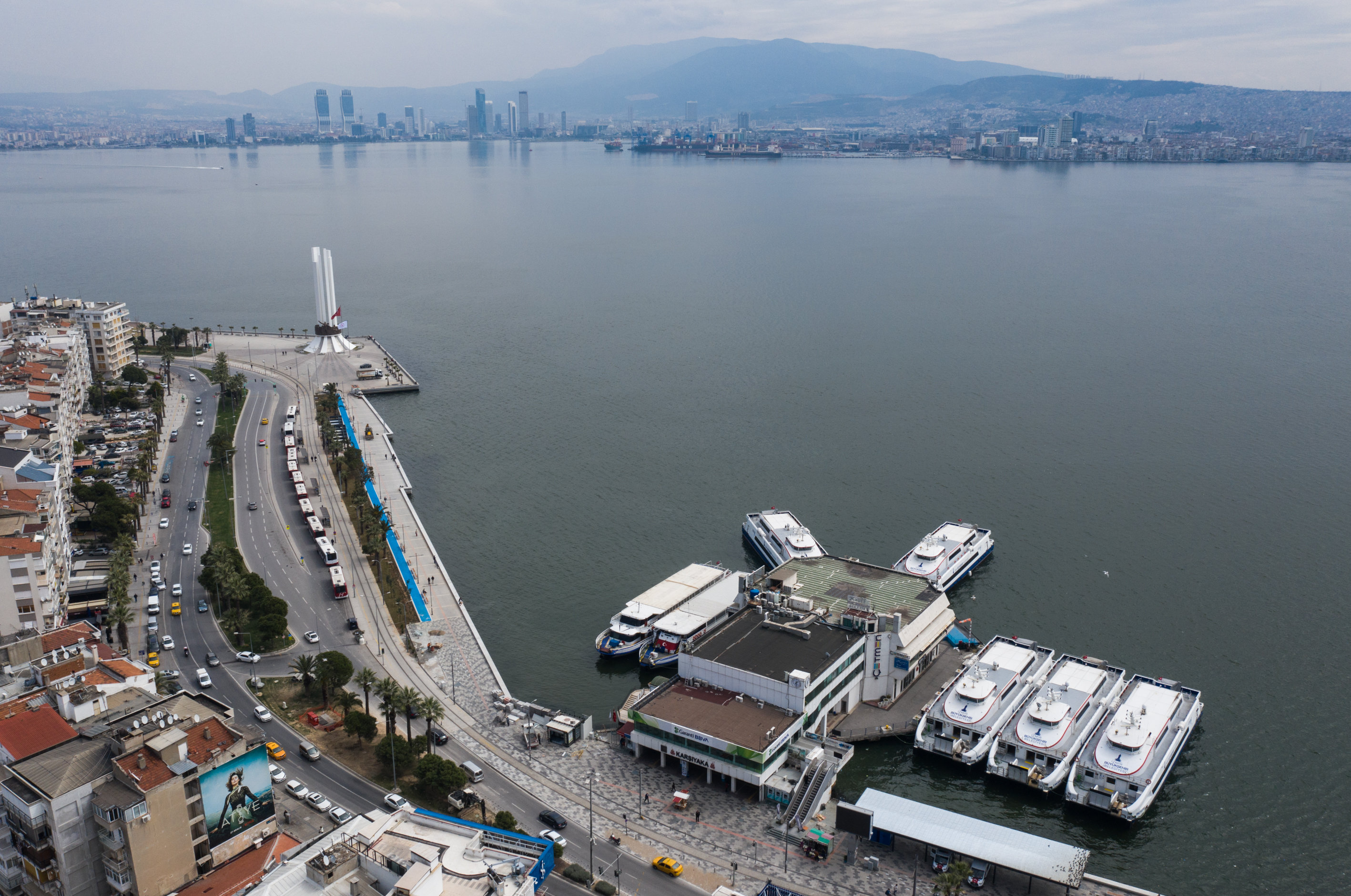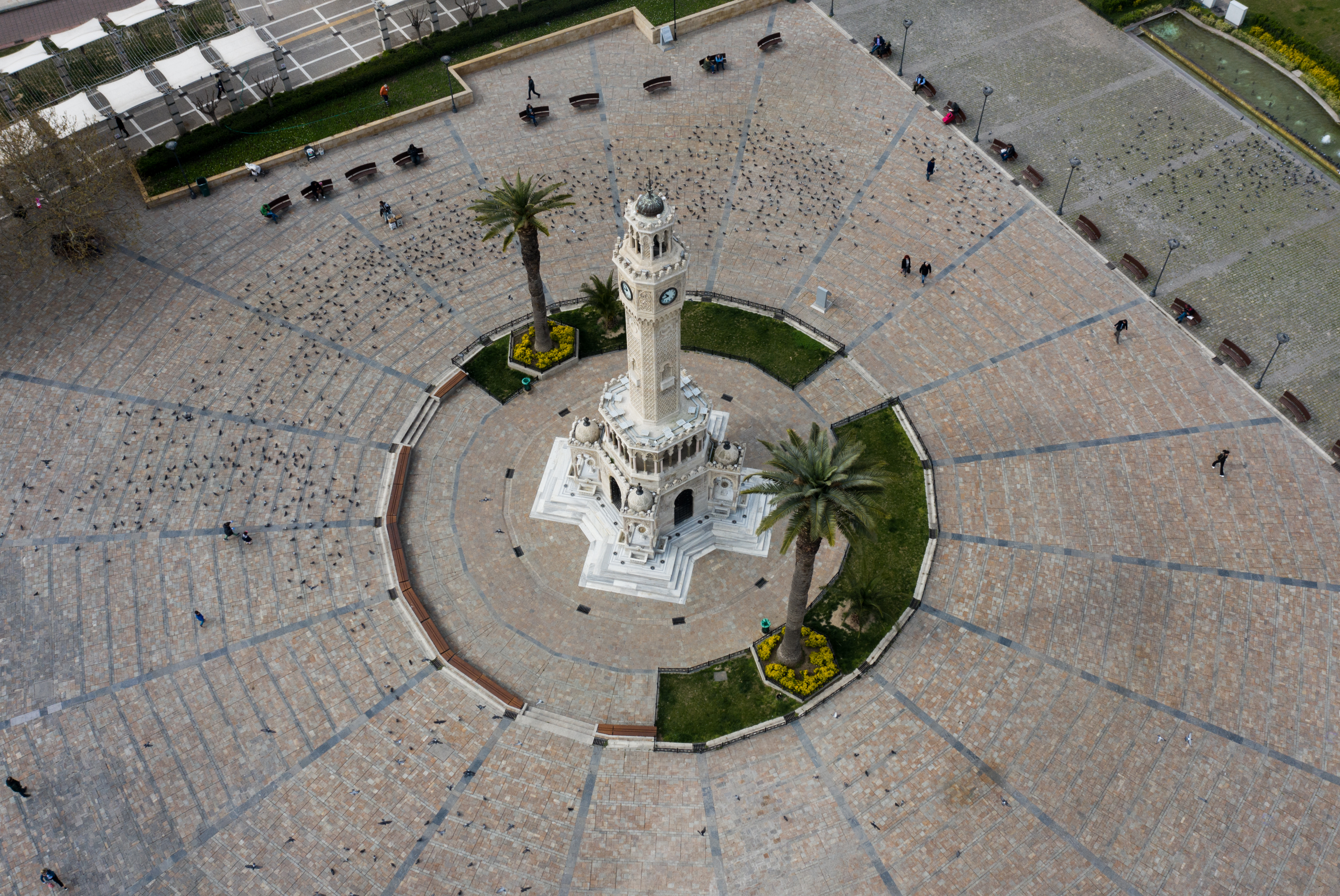 Dronla görüntülenen tarihi Saat Kulesi, Kordon Boyu, Gündoğdu Meydanı ve Karşıyaka Anıt çevresinde insan yoğunluğunun olmadığı görüldü.