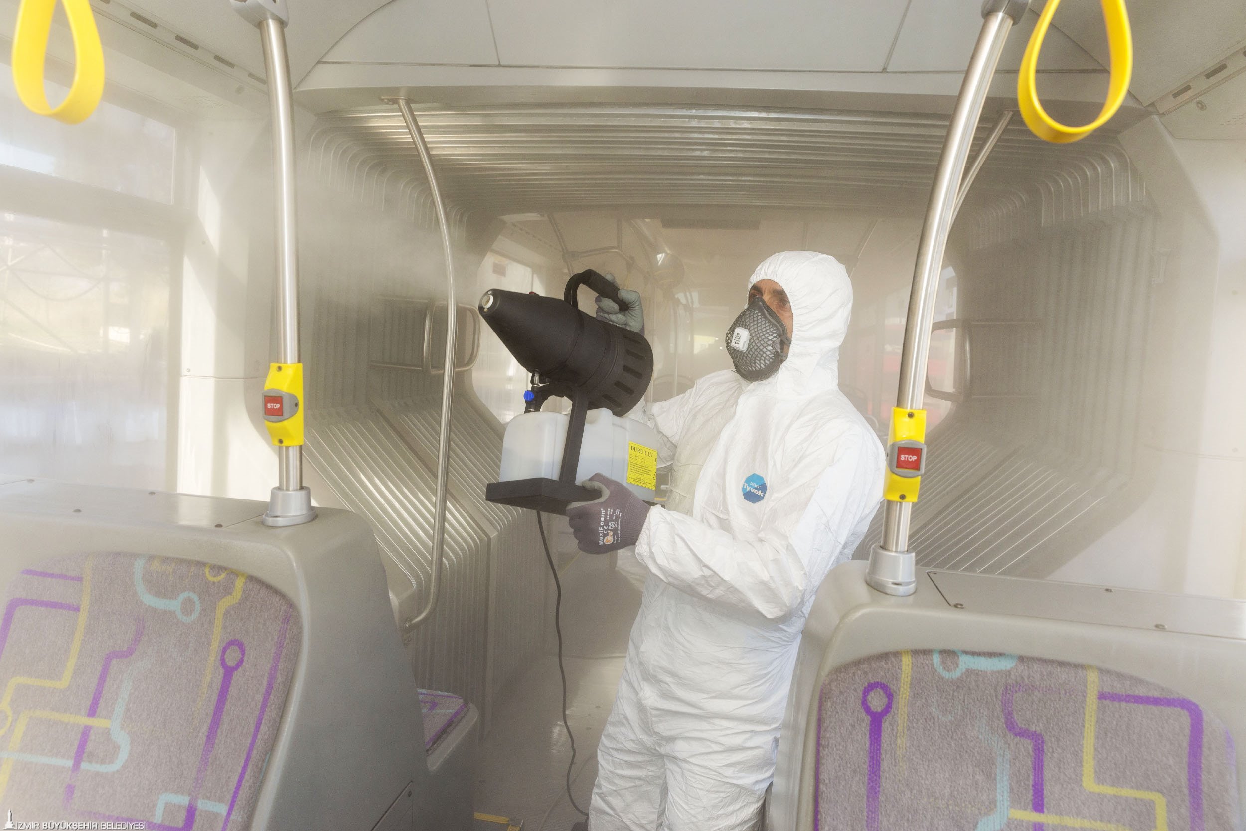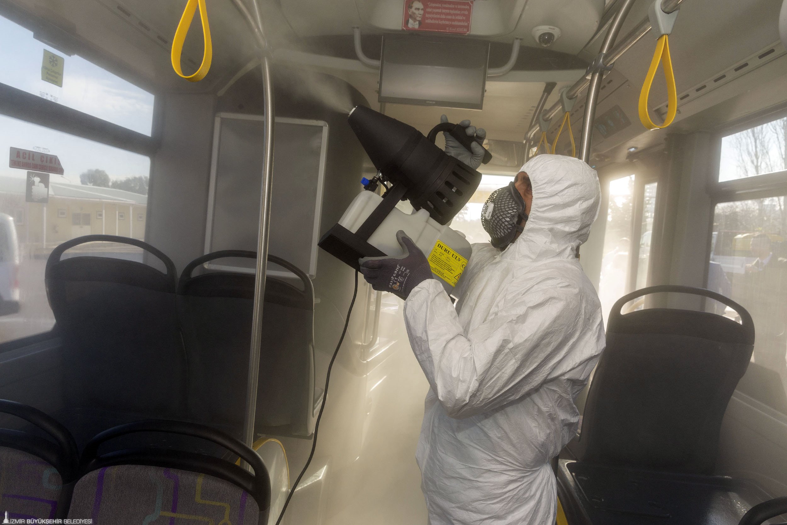 Toplu taşıma hizmeti veren 1450 otobüste de dezenfeksiyon çalışmalarına başlanırken virüs ve bakteri temizliğinde su bazlı kimyasallar kullanıldı. İnsan ve çevre sağlığına zararlı olmayan kimyasallarla İZBAN, Metro, Tramvay, ESHOT ve İZDENİZ'e ait işletmelerde sabaha kadar temizlik çalışmaları yapılırken, tüm toplu ulaşım araçlarında koltuklar temizlenip, zeminleri paspaslanıyor.