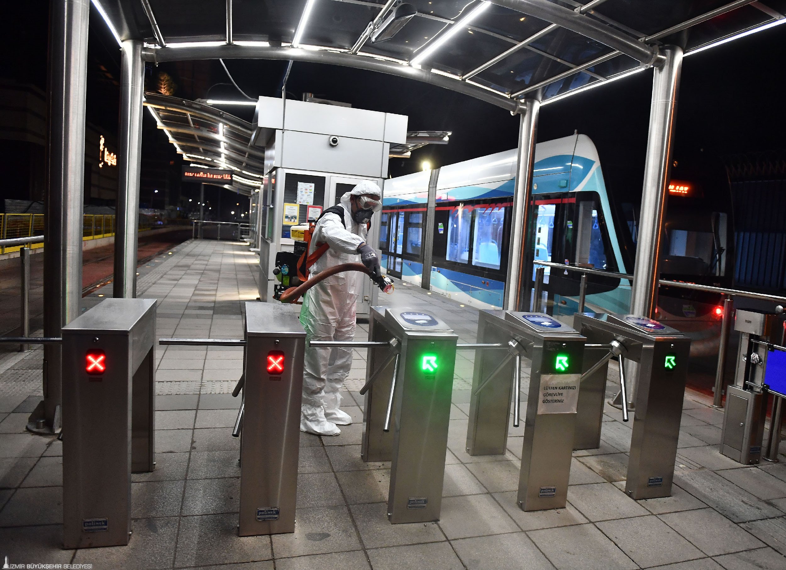 İzmir Büyükşehir Belediyesi Çevre Koruma ve Kontrol Şube Müdürlüğü ekiplerince ilk etapta 182 metro aracı ve 38 tramvay aracından oluşan 220 araçlık filoda, temizlik çalışmaları sonrası ilaçlama yapıldı. Aynı çalışma, metro istasyonlarında ve tramvay duraklarında da yapıldı.
