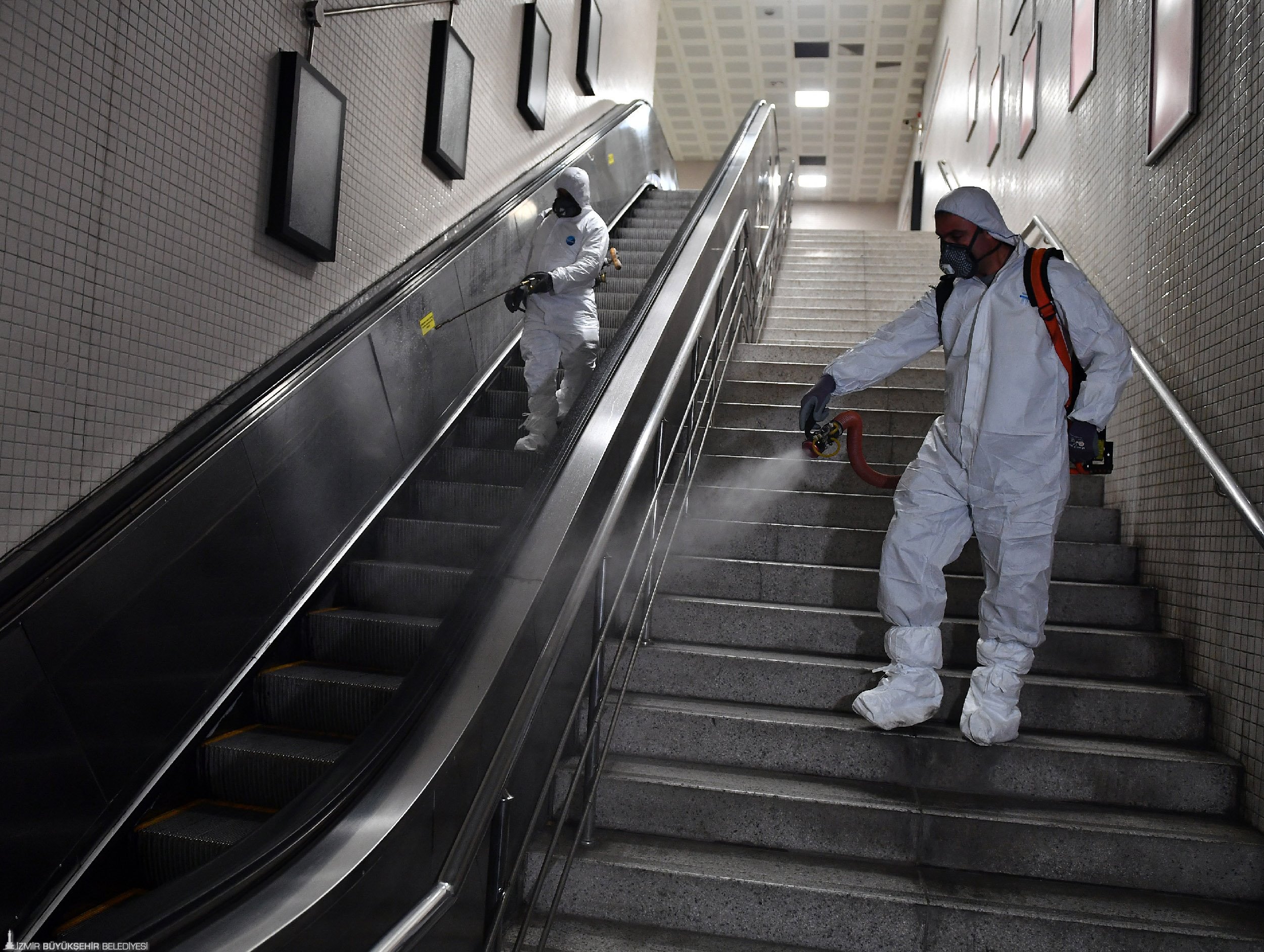 İzmir'de, yeni tip koronavirüse (Kovid-19) karşı toplu ulaşım araçları ile okullar başta olmak üzere kamusal alanlarda dezenfekte işlemine hız verildi.