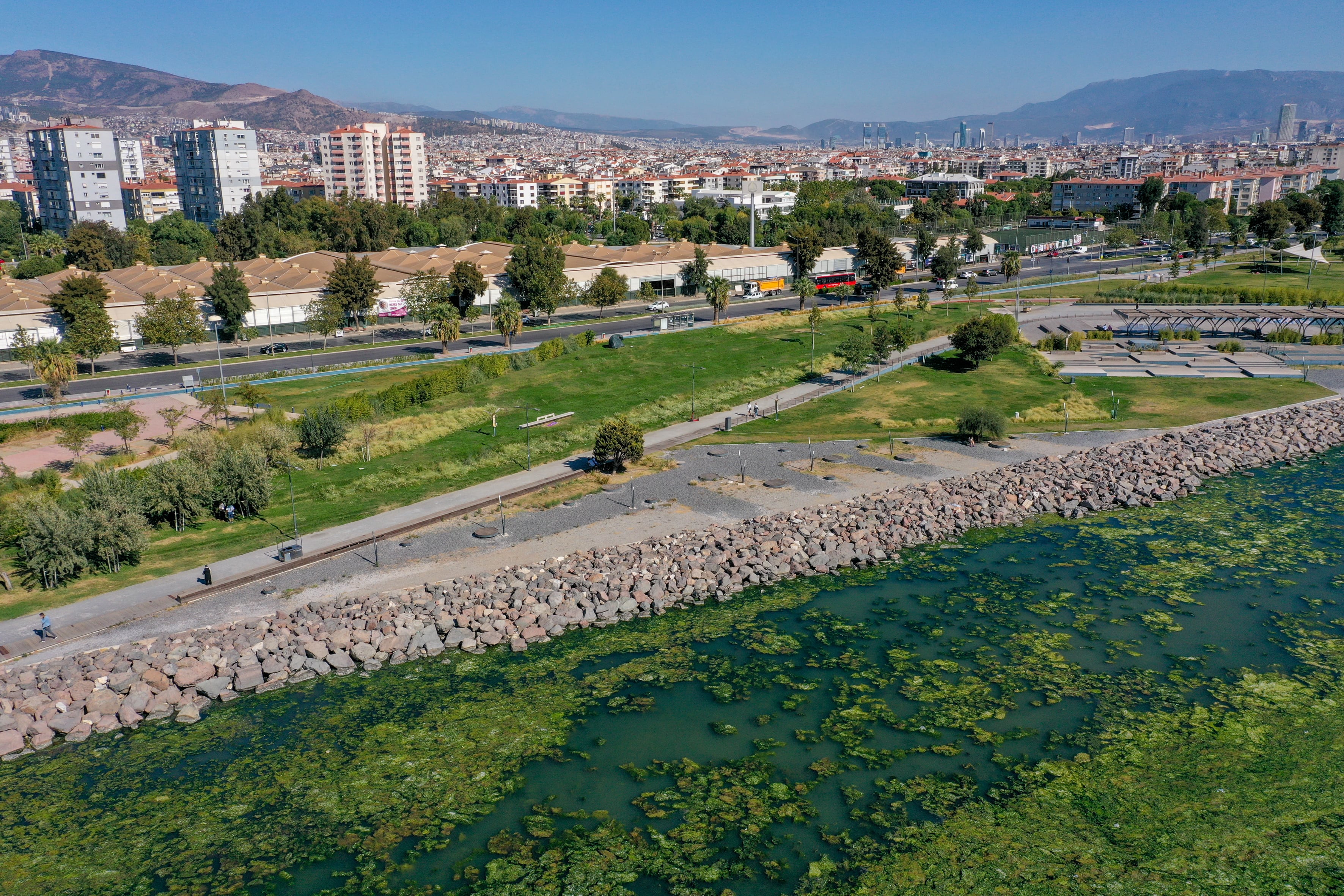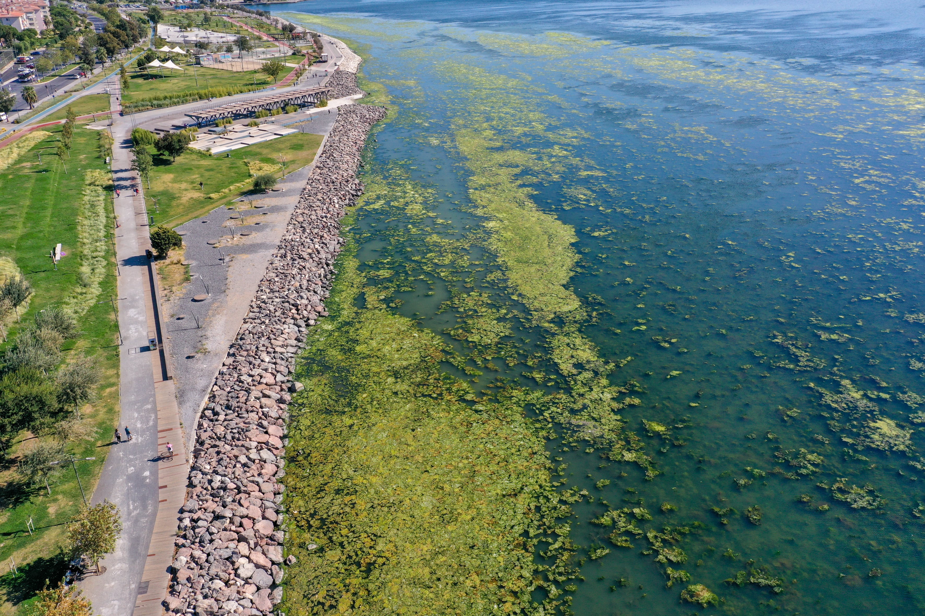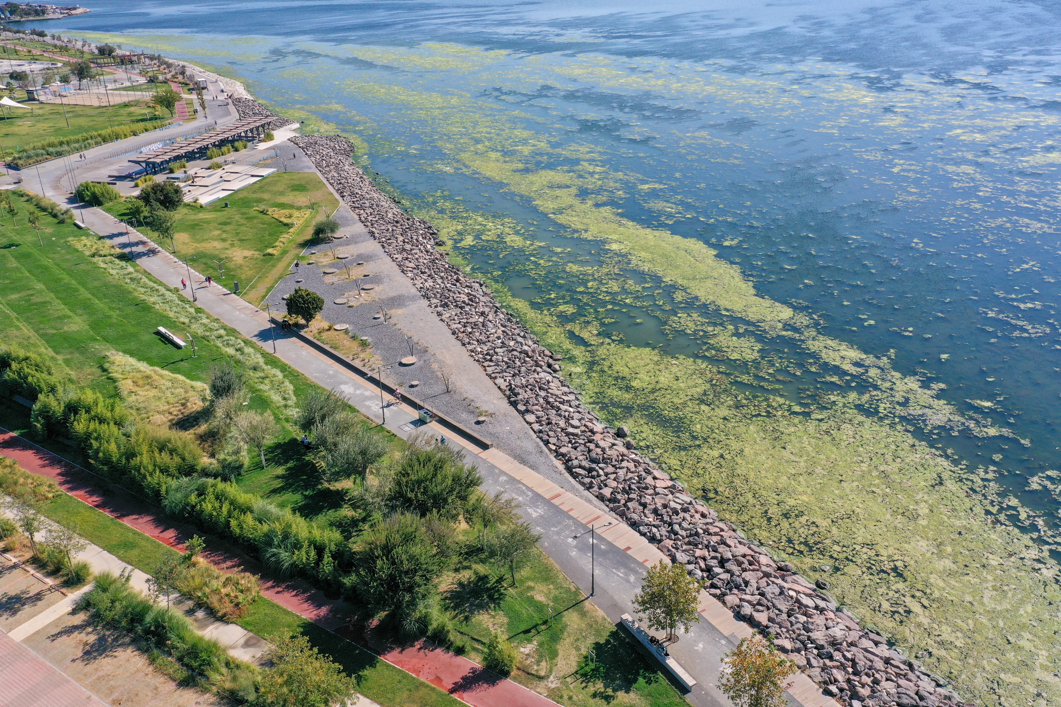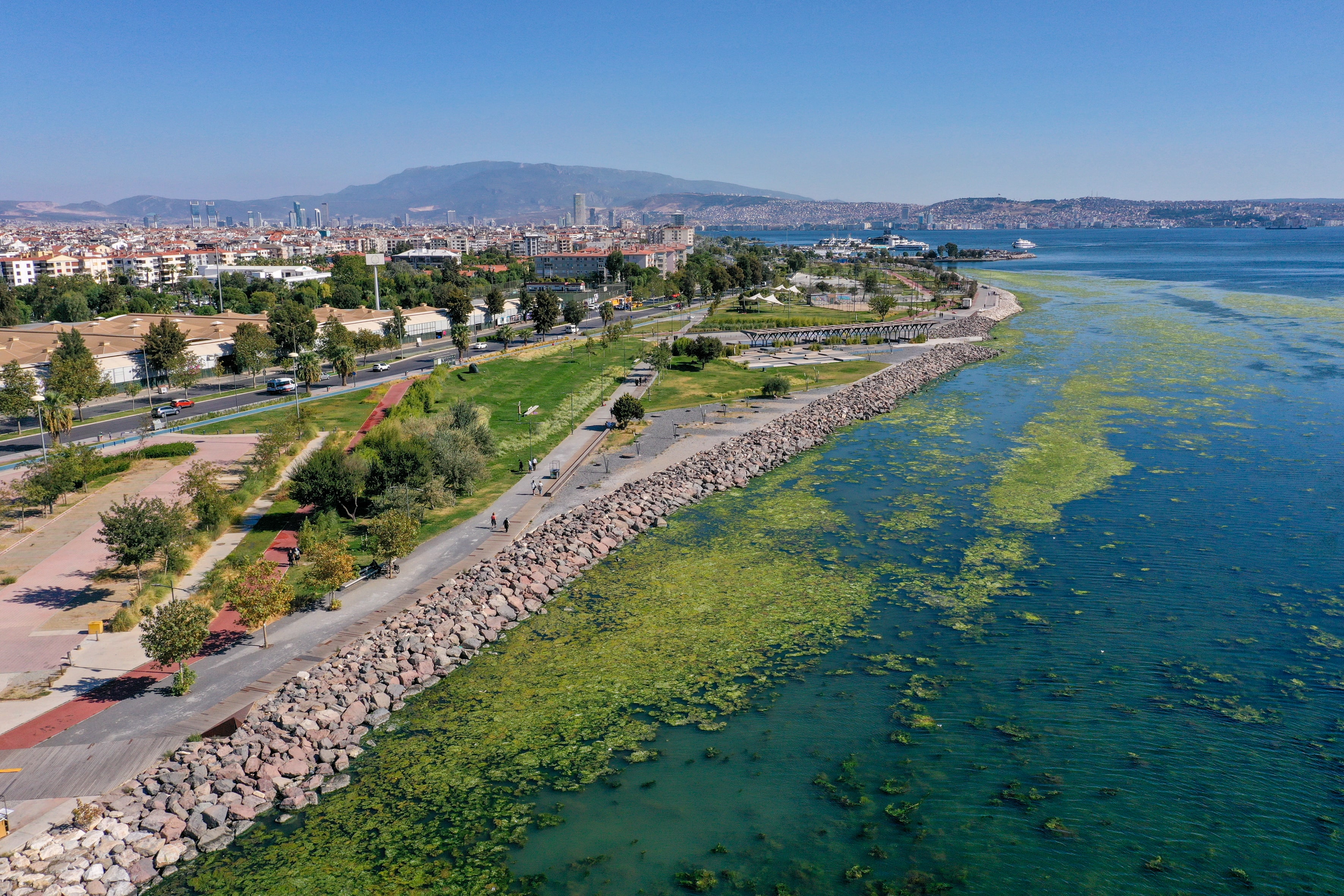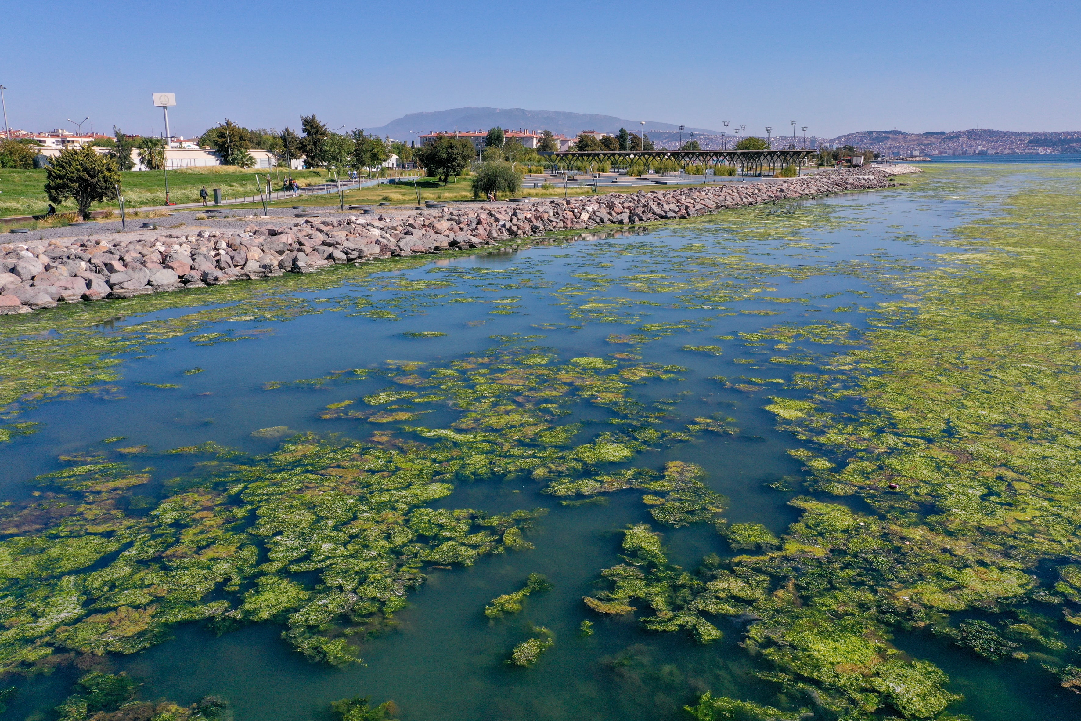 İzmir'in Karşıyaka ilçesinde sahili, 'deniz marulu' olarak bilinen 'ulva lactuca' adlı yeşil renkli yosunlarla kaplandı.