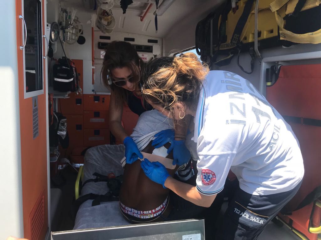 Düzensiz göçmenler arasındaki hamile kadın Çeşme Devlet Hastanesine kaldırıldı, 4 kişi de kontrol amacıyla hastaneye gönderildi.