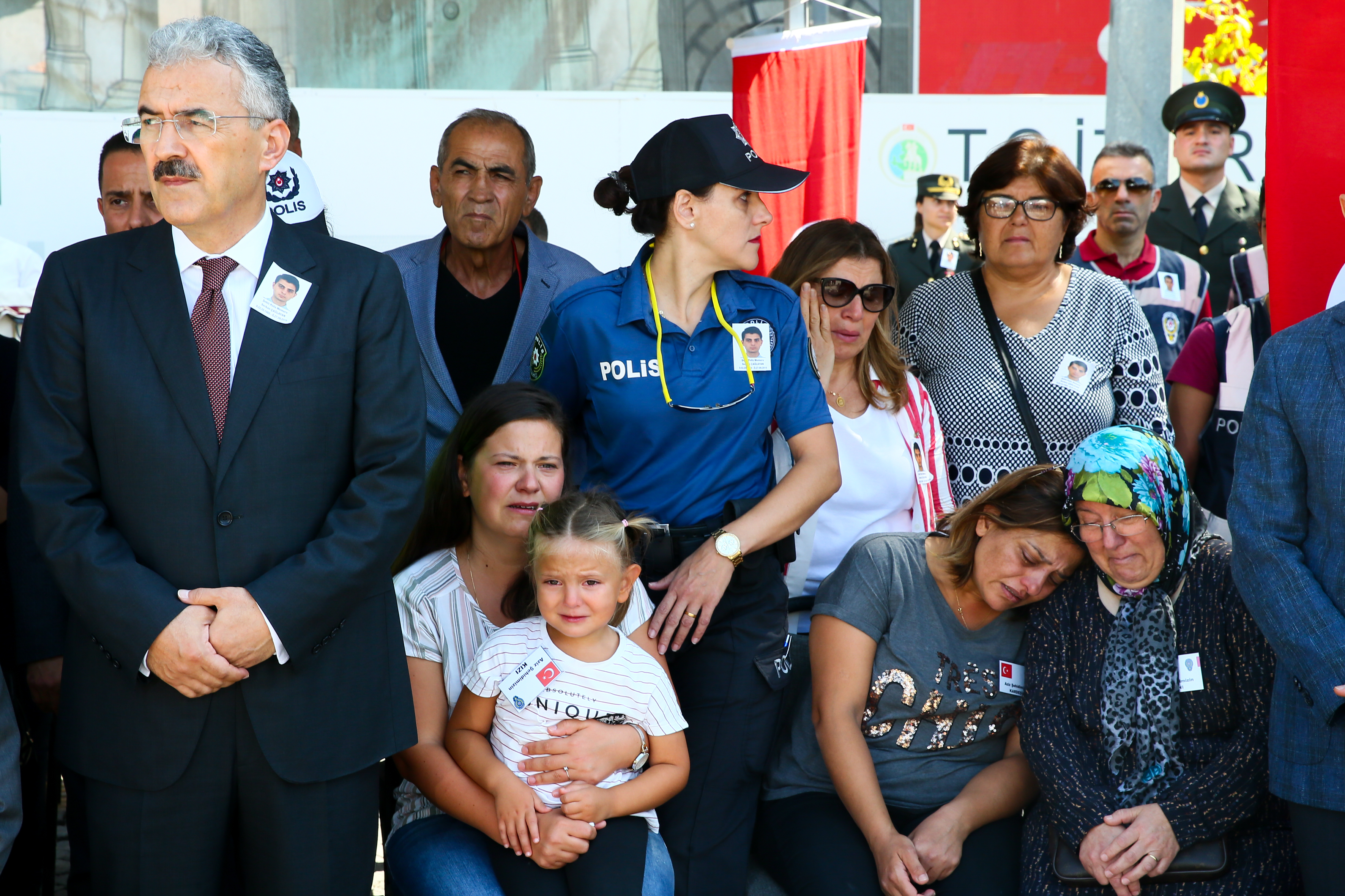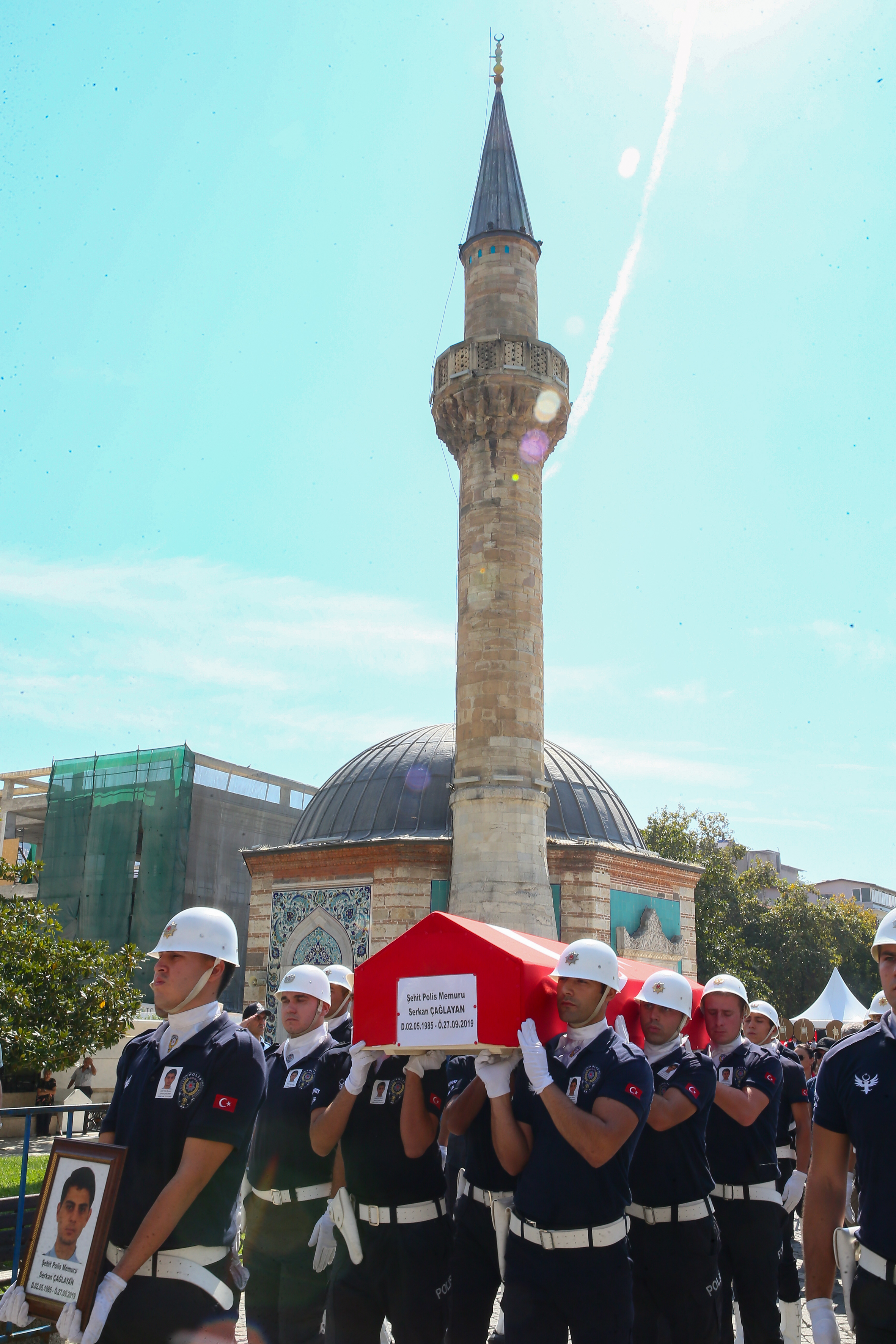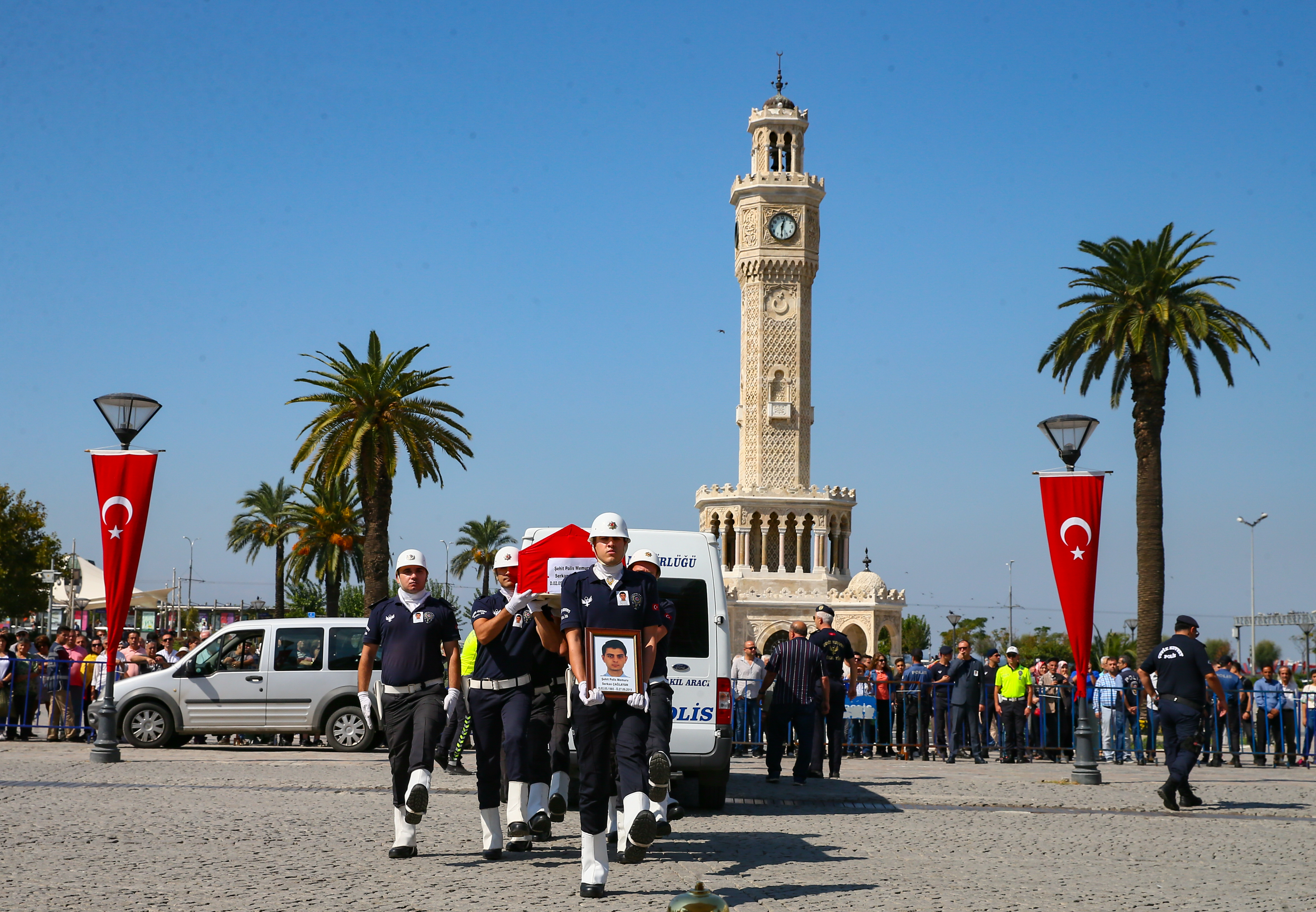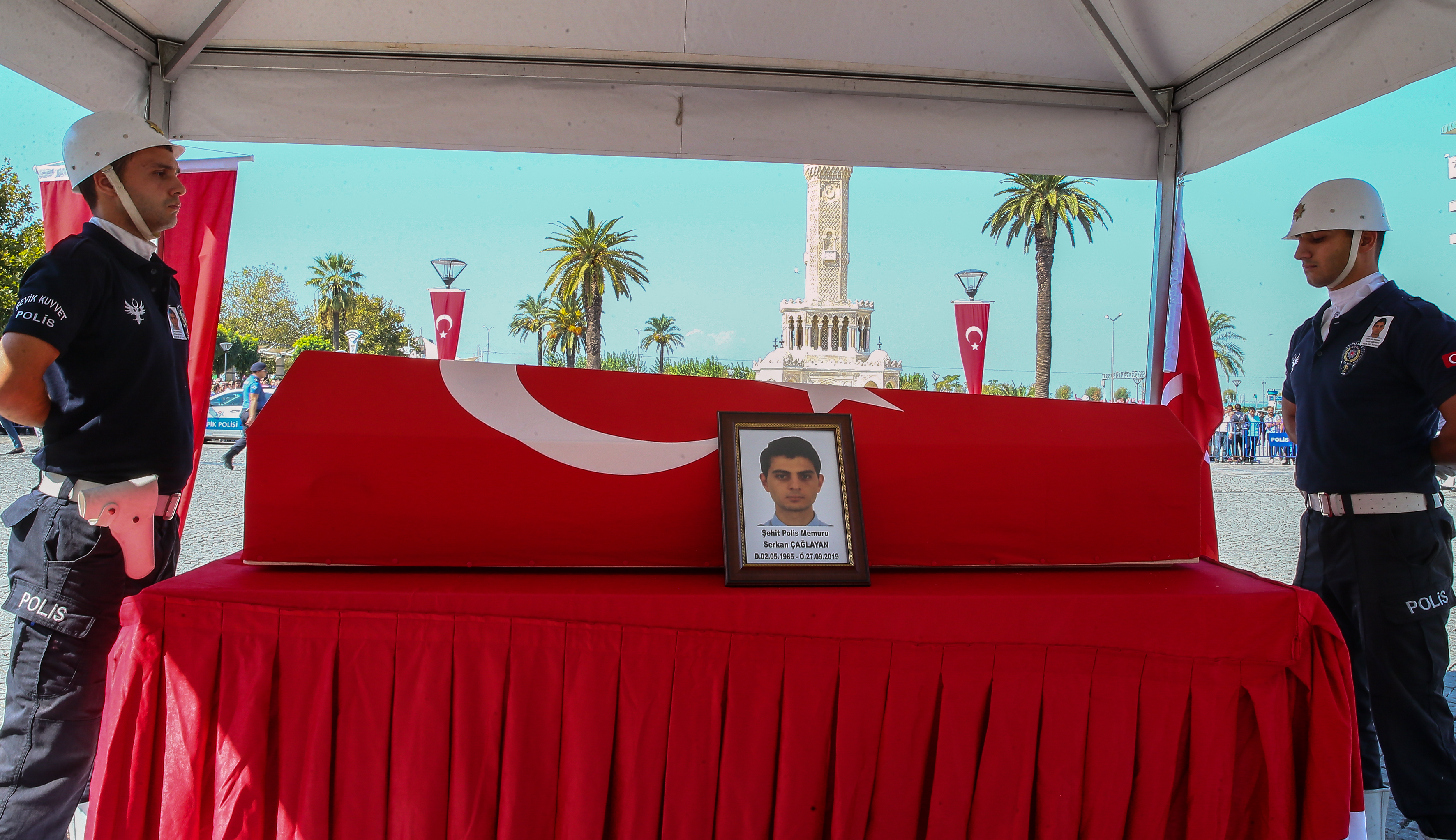 Urla ilçesinde dün hafif ticari aracın çarpması sonucu kaldırıldığı Dokuz Eylül Üniversitesi Tıp Fakültesi Hastanesinde müdahaleye rağmen şehit olan Serkan Çağlayan için Konak Meydanında tören düzenlendi.