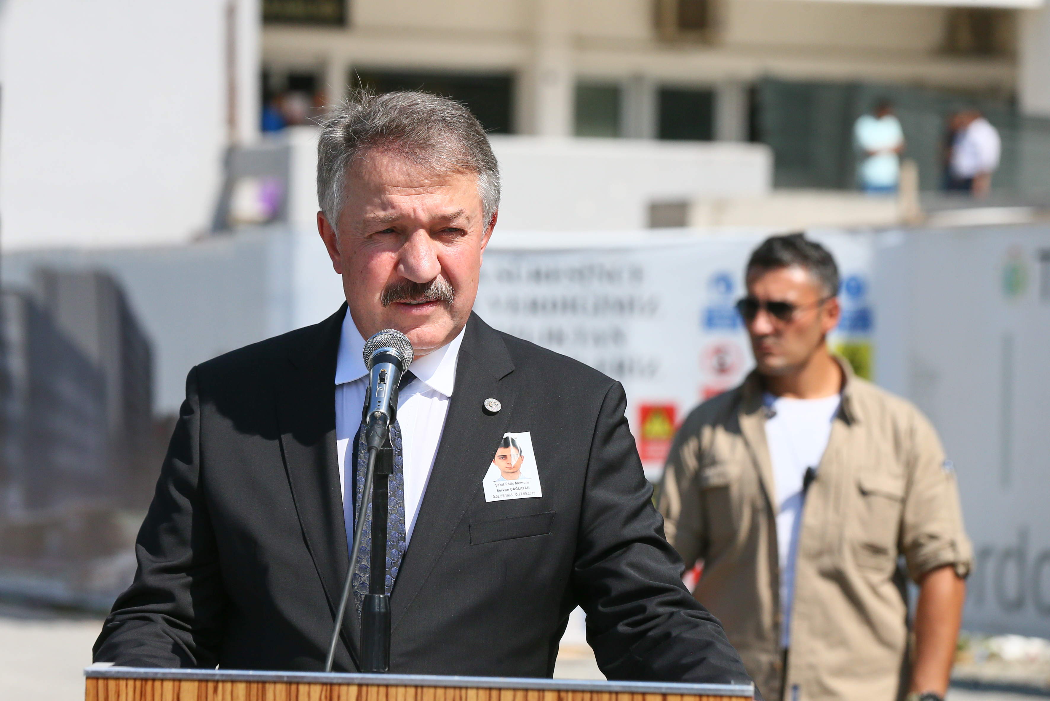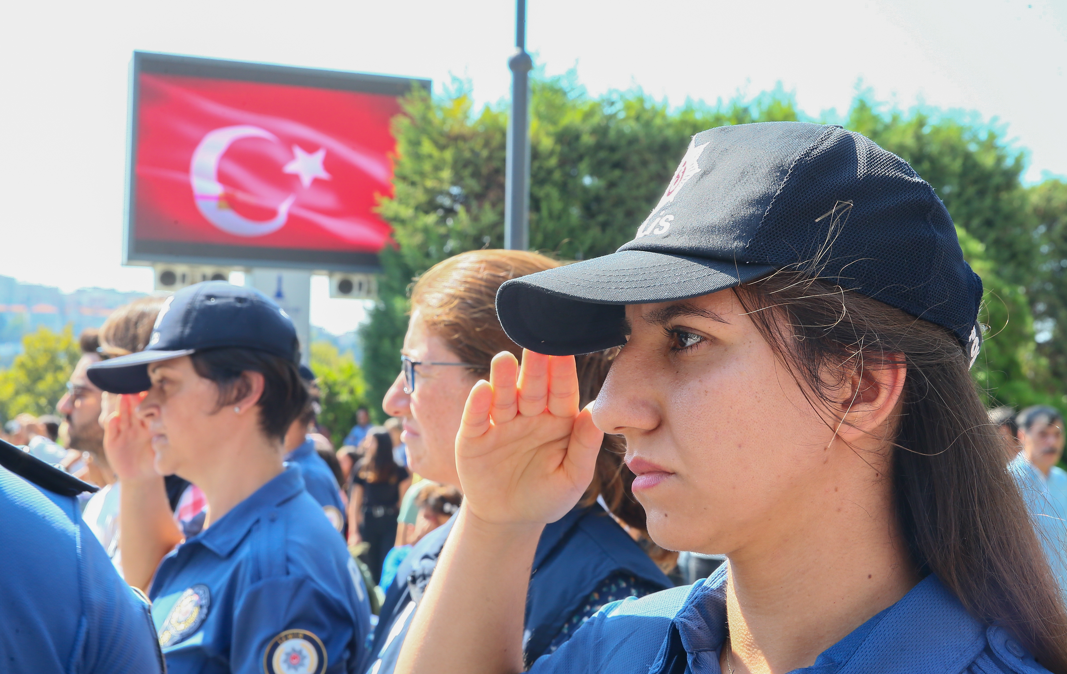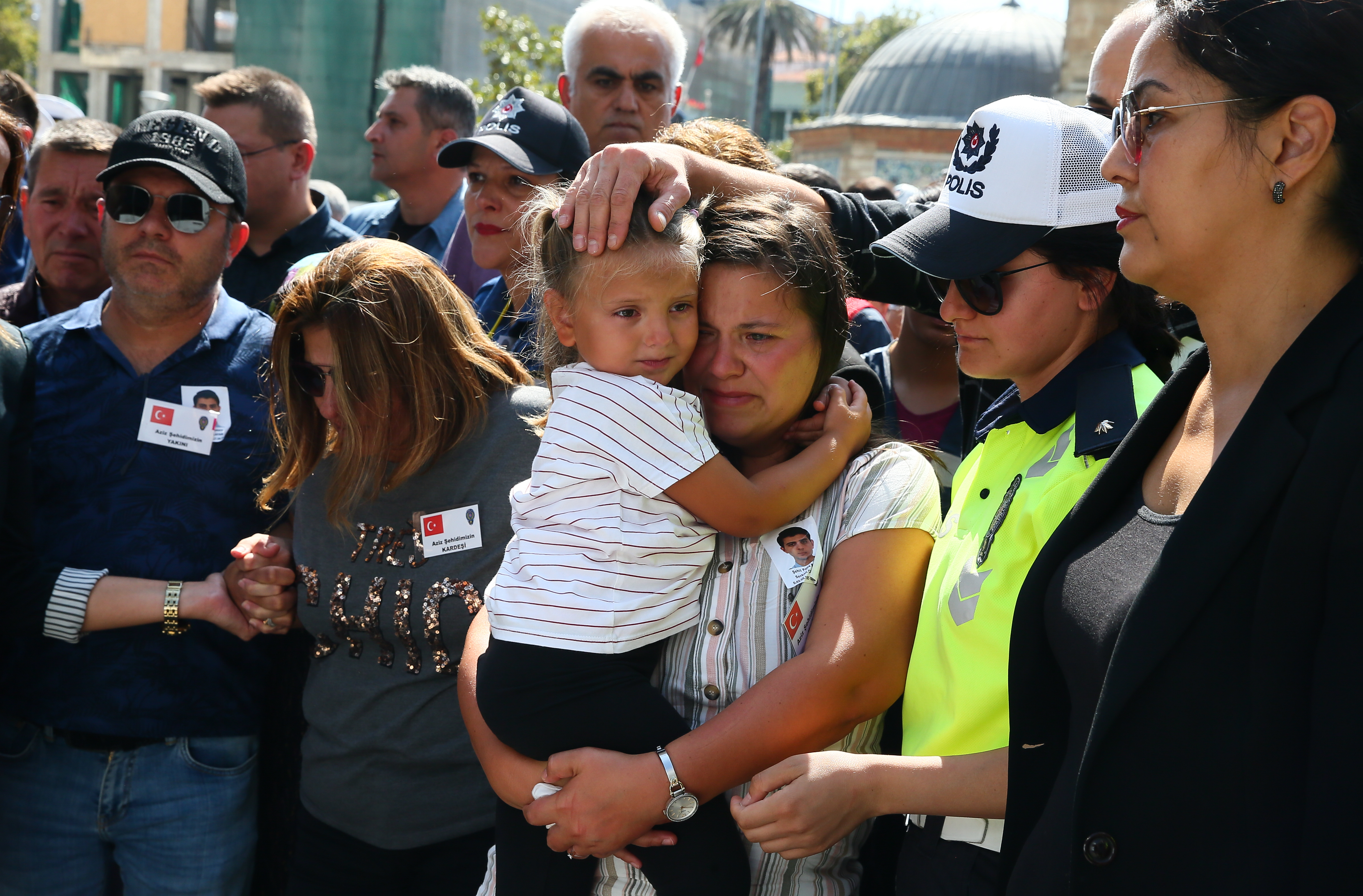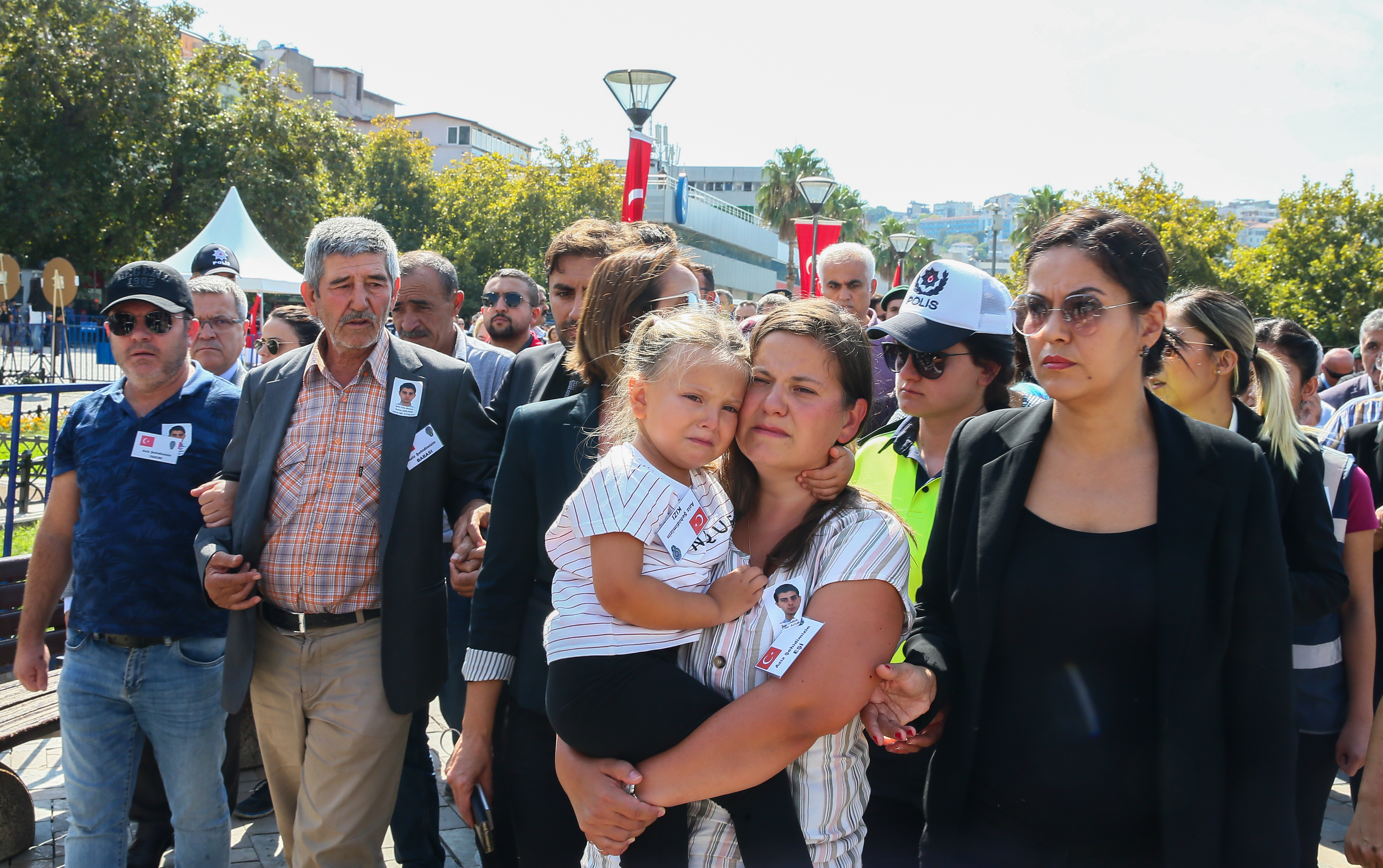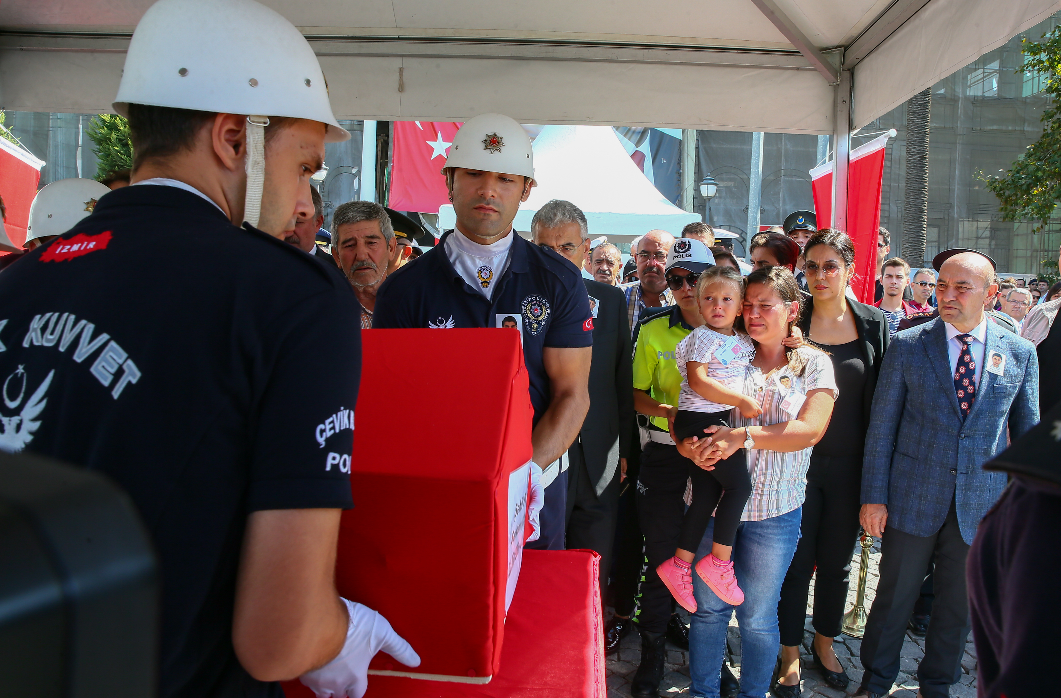 Urla ilçesinde dün hafif ticari aracın çarpması sonucu kaldırıldığı Dokuz Eylül Üniversitesi Tıp Fakültesi Hastanesinde müdahaleye rağmen şehit olan Serkan Çağlayan için Konak Meydanında tören düzenlendi.