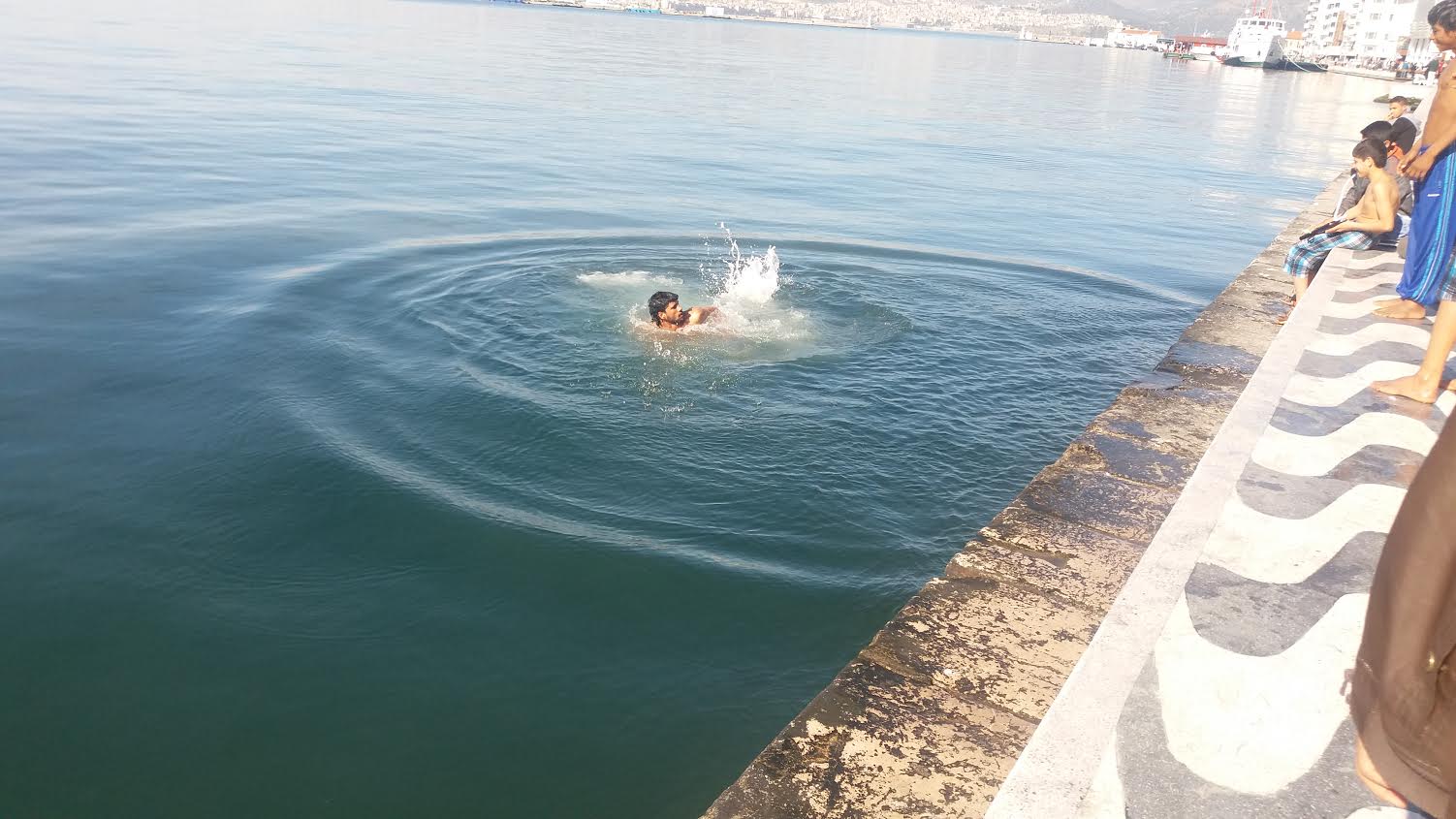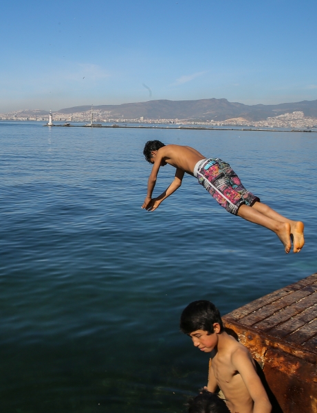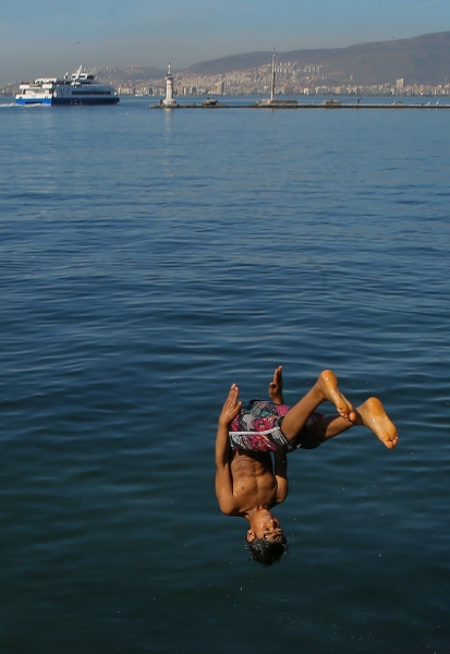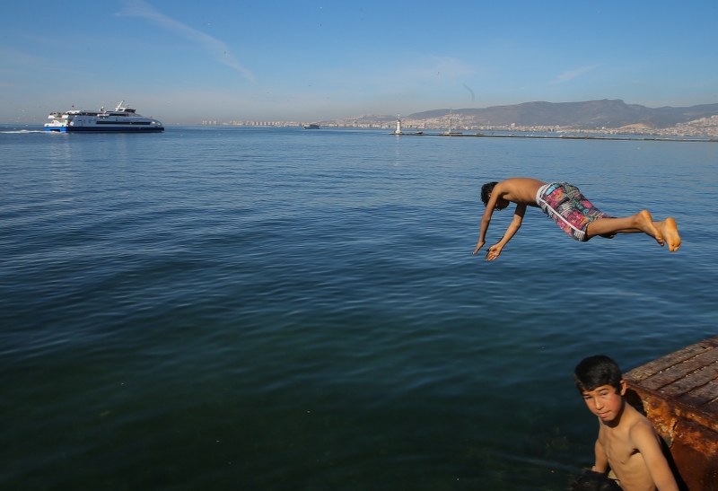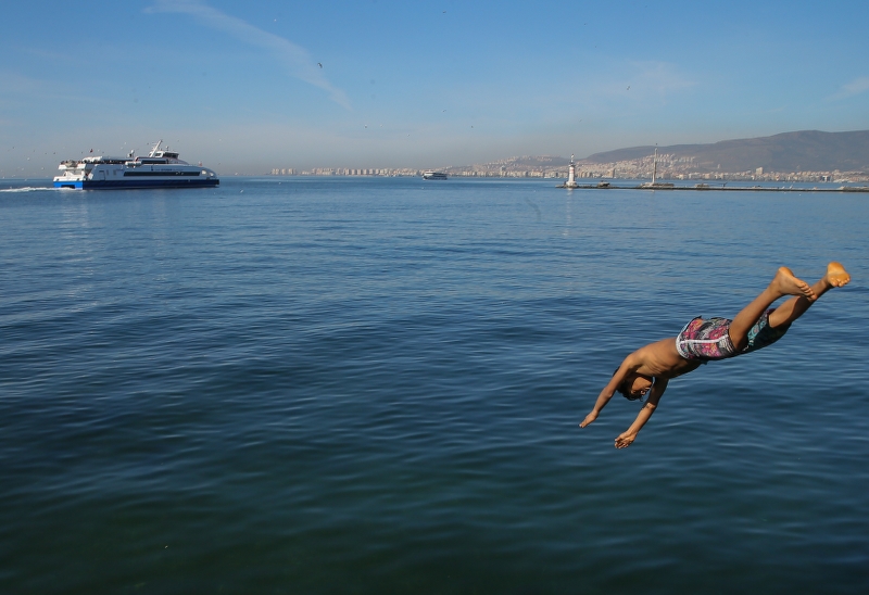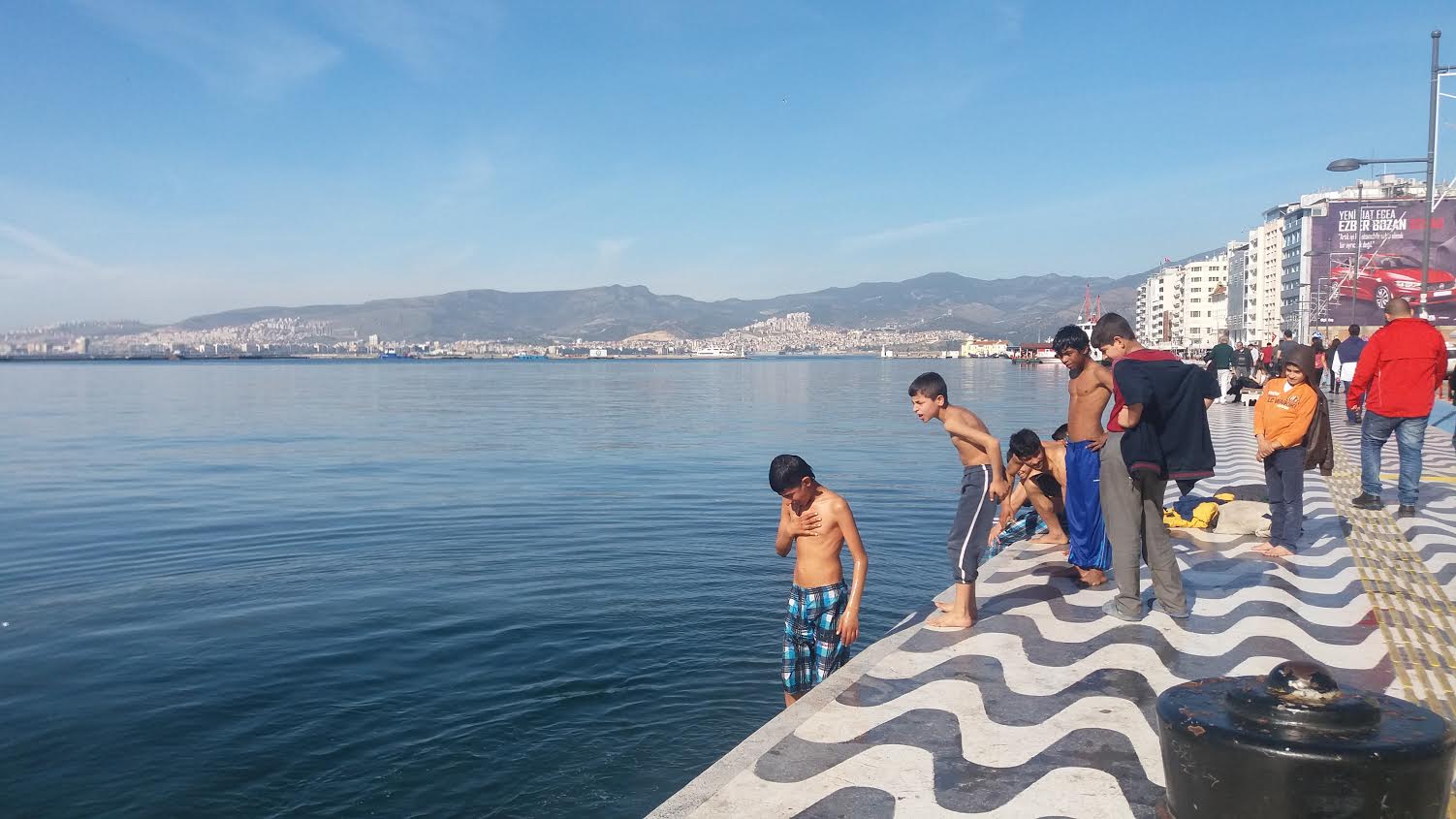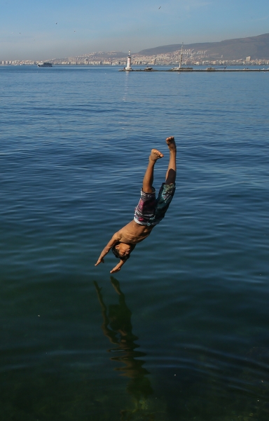 EGEDESONSÖZ - İzmir'de sıcaklık 20 dereceyi geçti ve Şubat ayı sıcaklık rekorları kırıldı! Termometrelerin zirve yaptığı bu günlerde güneşin zevkine varmak isteyenler sokaklara dökülürken, bazı çocuklar Kordon'da denize girdi. (Fotoğraf: Haber Servisi/AA)