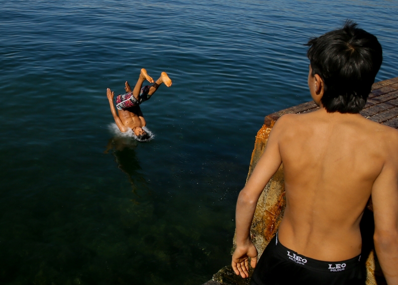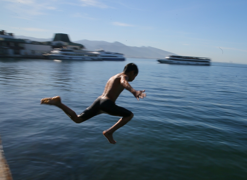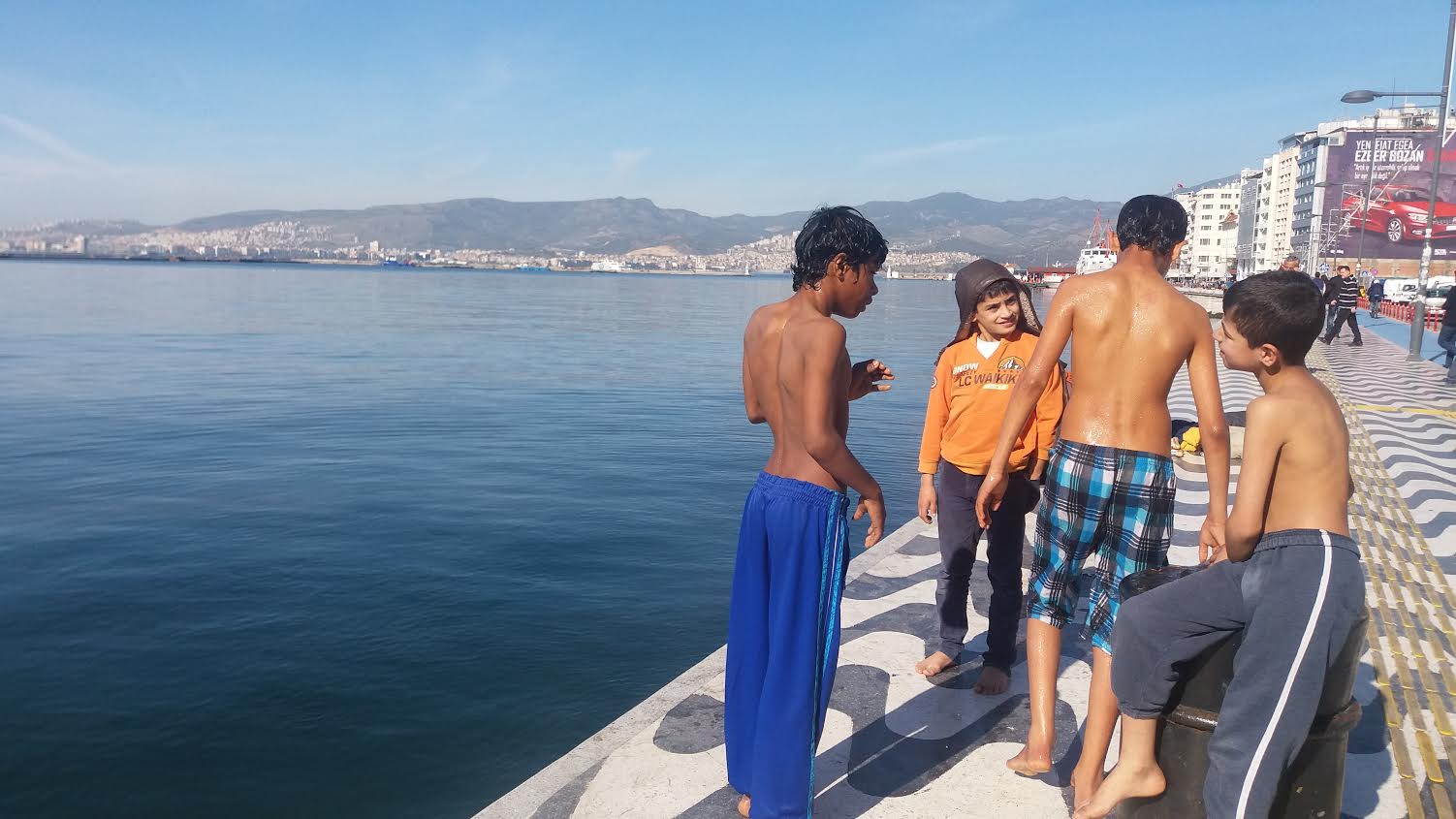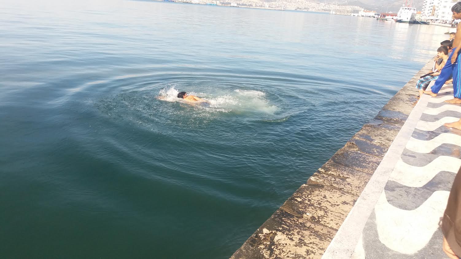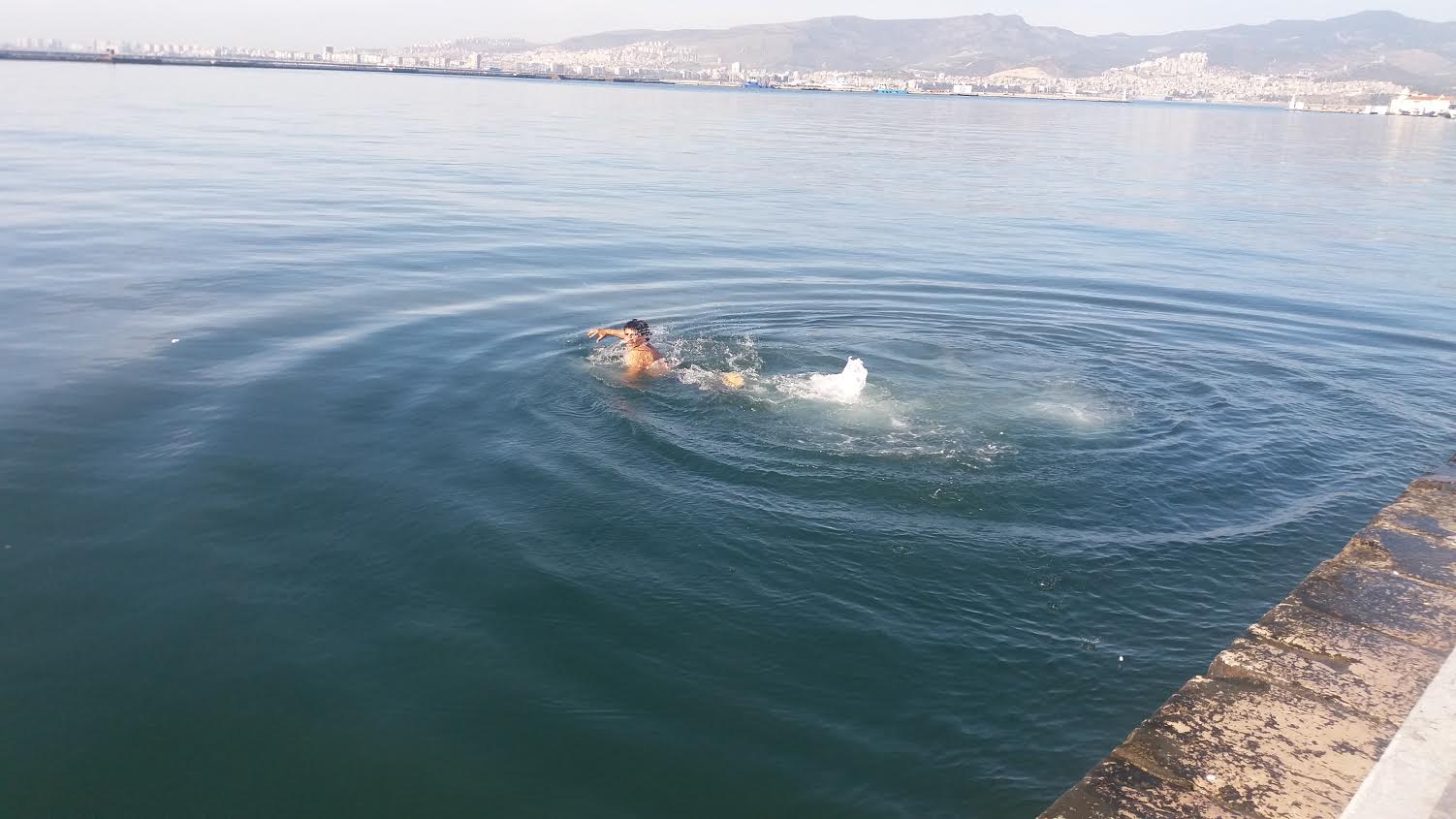 EGEDESONSÖZ - İzmir'de sıcaklık 20 dereceyi geçti ve Şubat ayı sıcaklık rekorları kırıldı! Termometrelerin zirve yaptığı bu günlerde güneşin zevkine varmak isteyenler sokaklara dökülürken, bazı çocuklar Kordon'da denize girdi. (Fotoğraf: Haber Servisi/AA)
