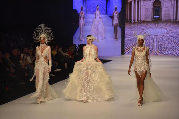 Birbirinden farklı işlemeleriyle göz dolduran transparan gelinlikler, çeşitli maske ve saç aksesuarları ile sunuldu.