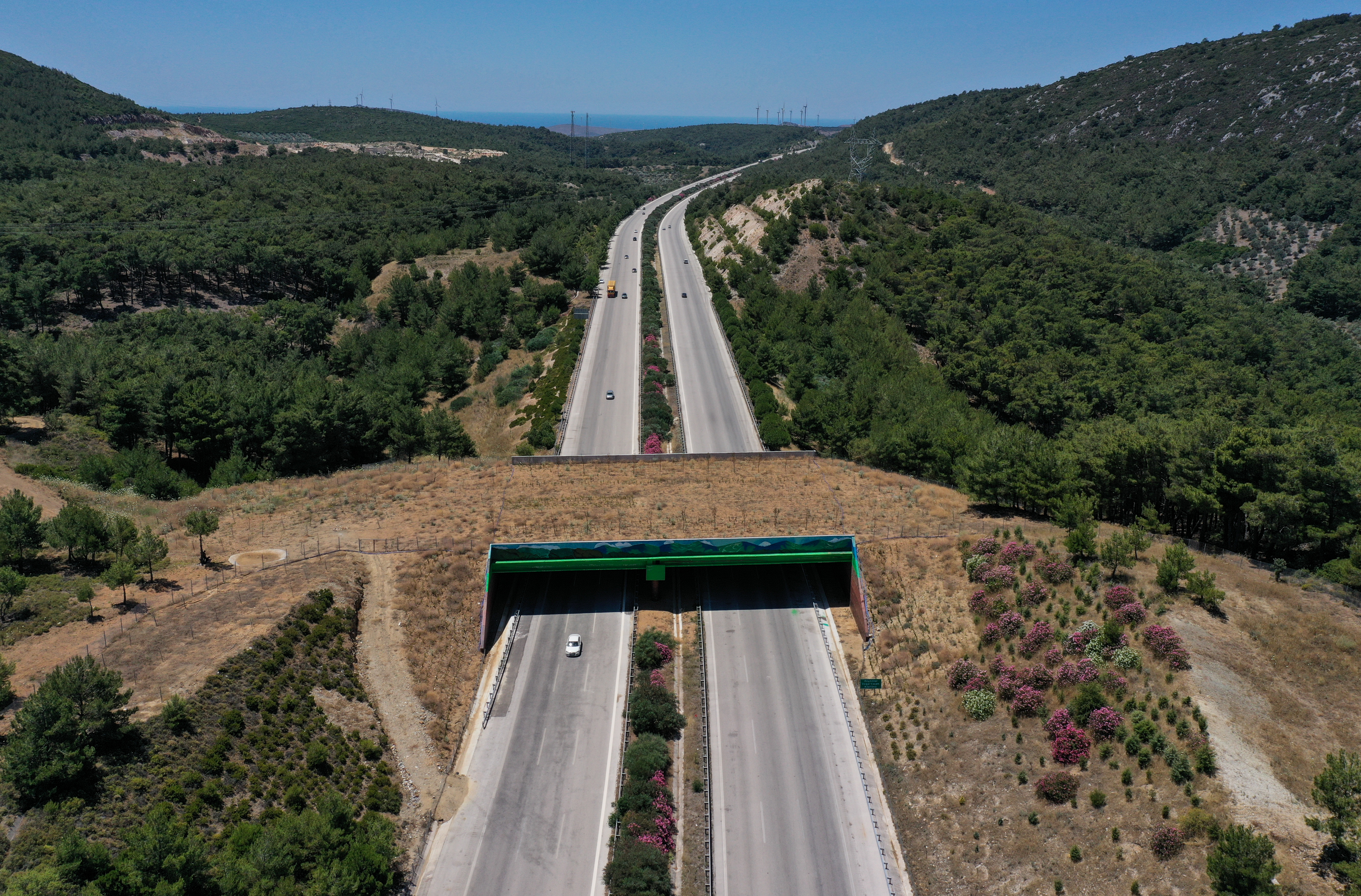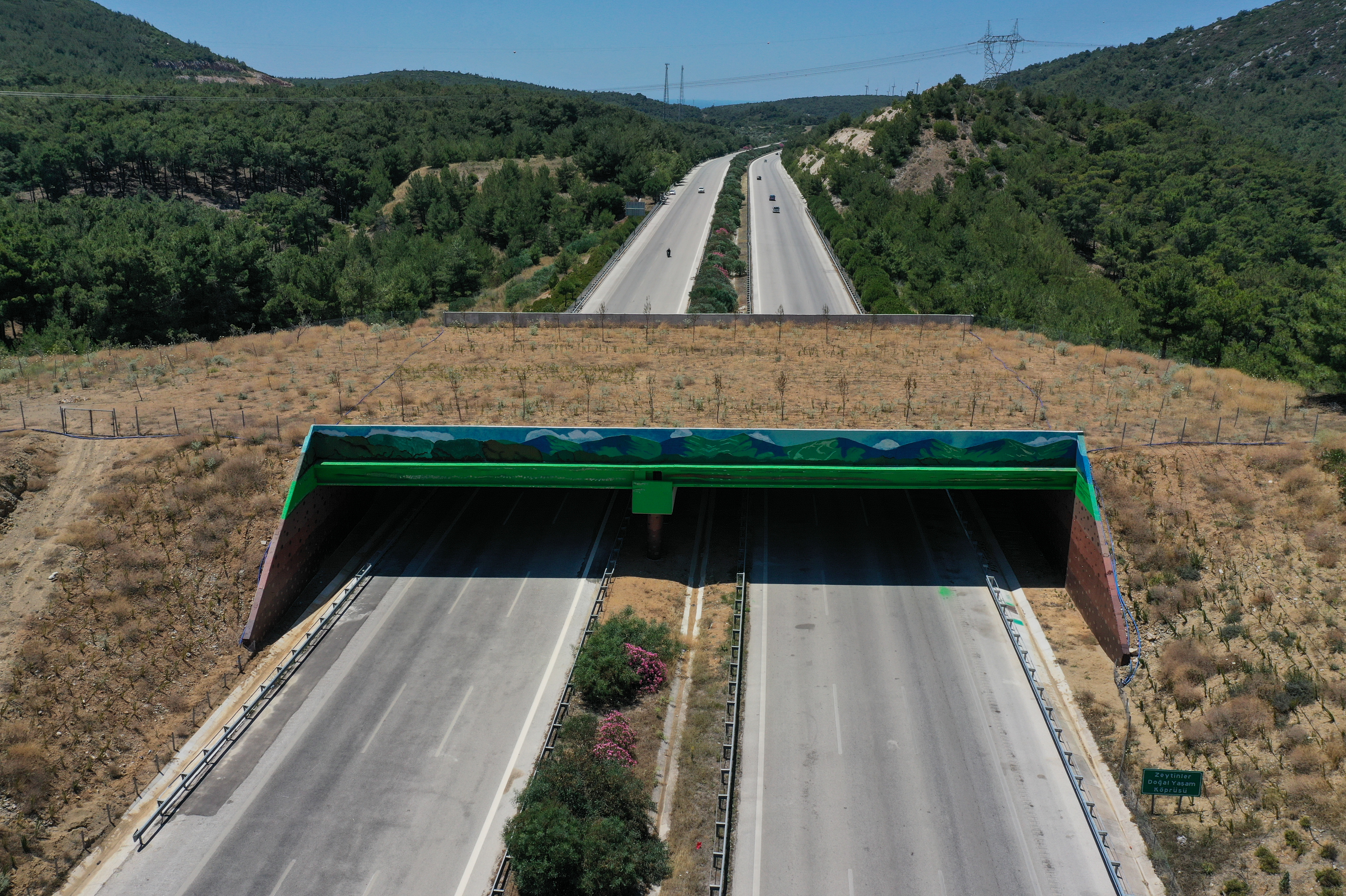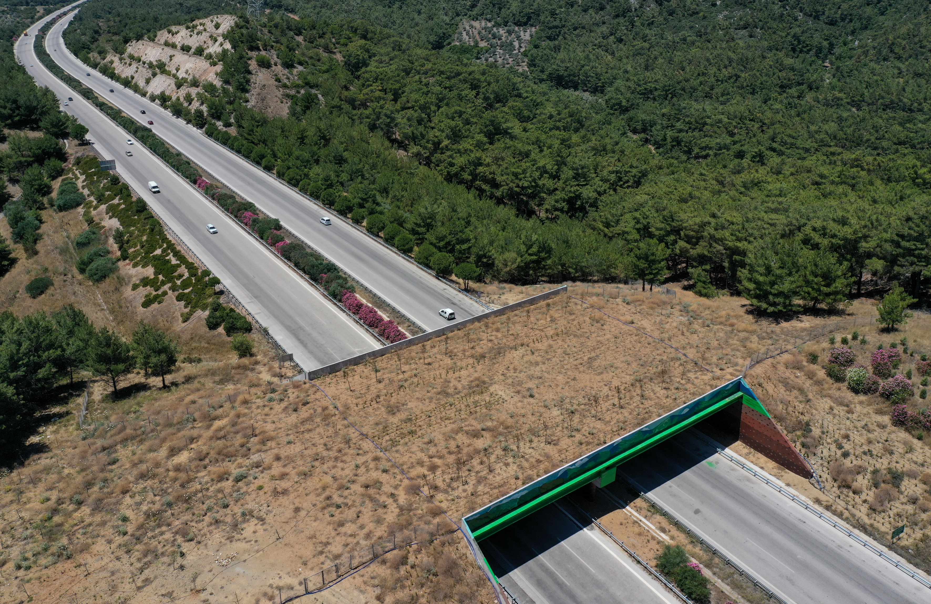 Ulaştırma ve Altyapı Bakanlığı, İzmir-Çeşme Otoyolunda yaban hayvanlarını korumak ve yaban hayatı kaynaklı trafik kazalarının önüne geçmek için planladığı 3 ekolojik köprüden birini tamamladı.