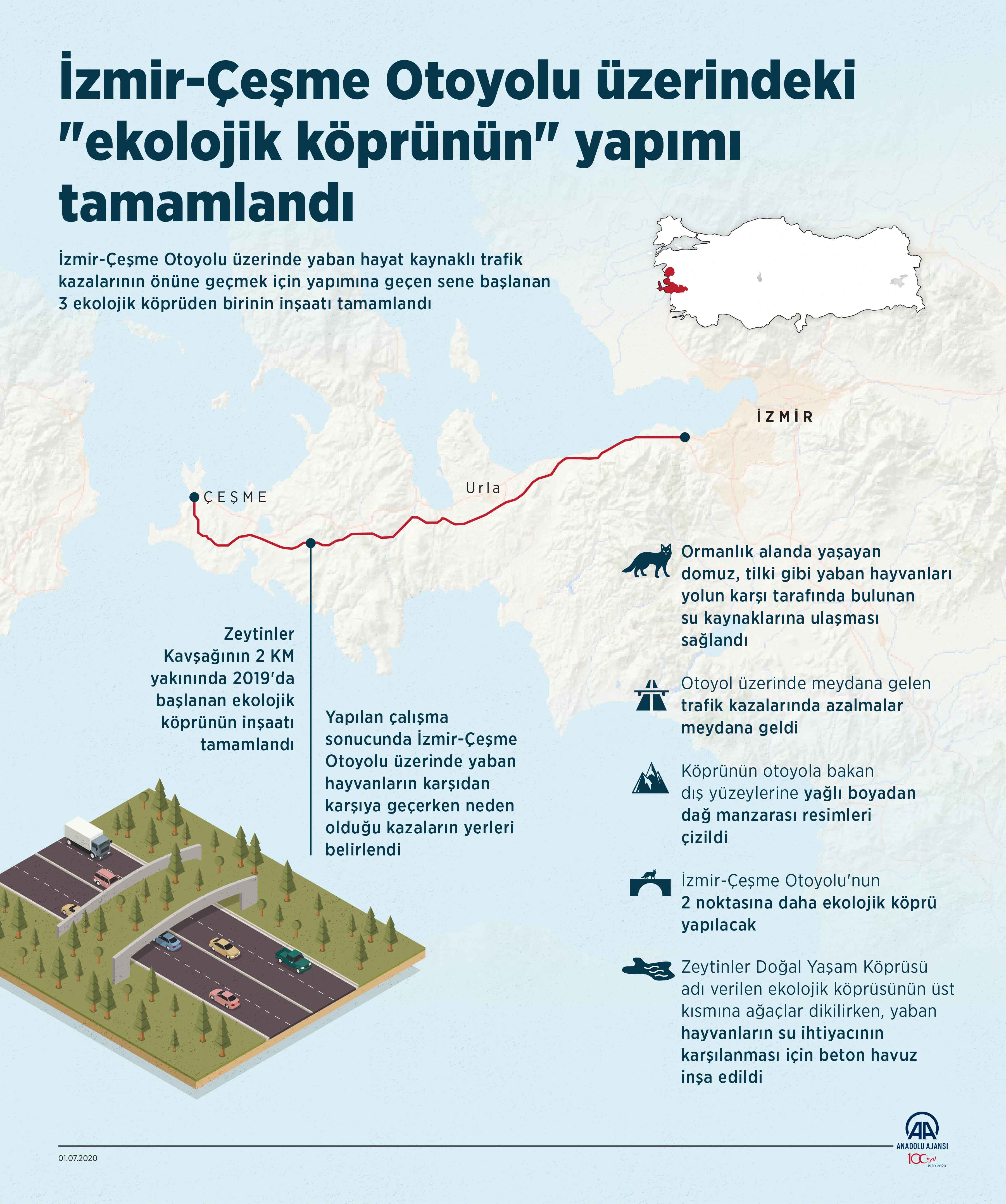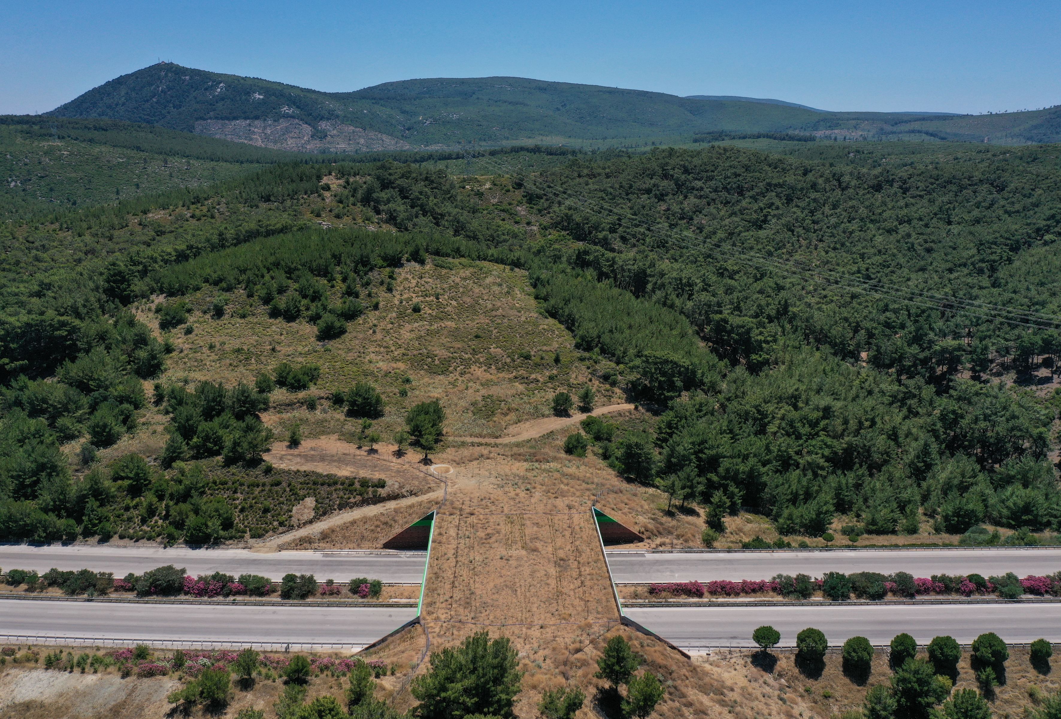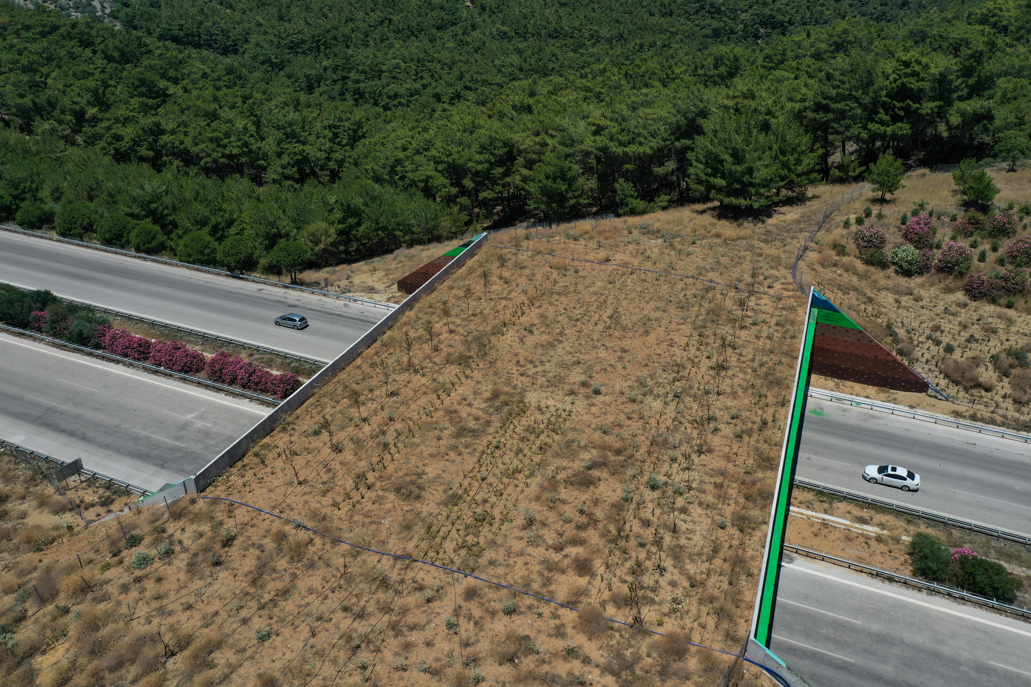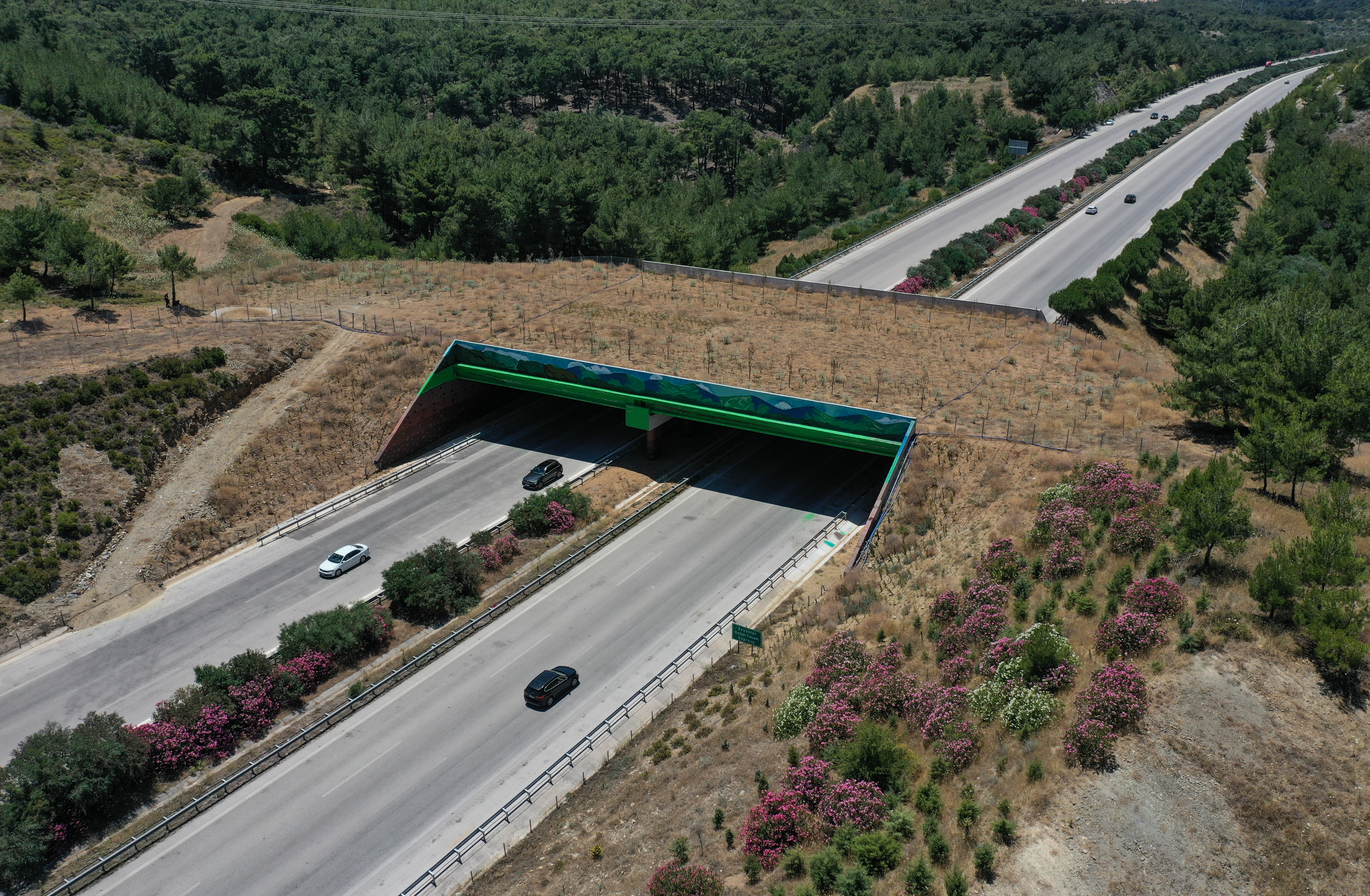 Ulaştırma ve Altyapı Bakanlığı, İzmir-Çeşme Otoyolunda yaban hayvanlarını korumak ve yaban hayatı kaynaklı trafik kazalarının önüne geçmek için planladığı 3 ekolojik köprüden birini tamamladı.