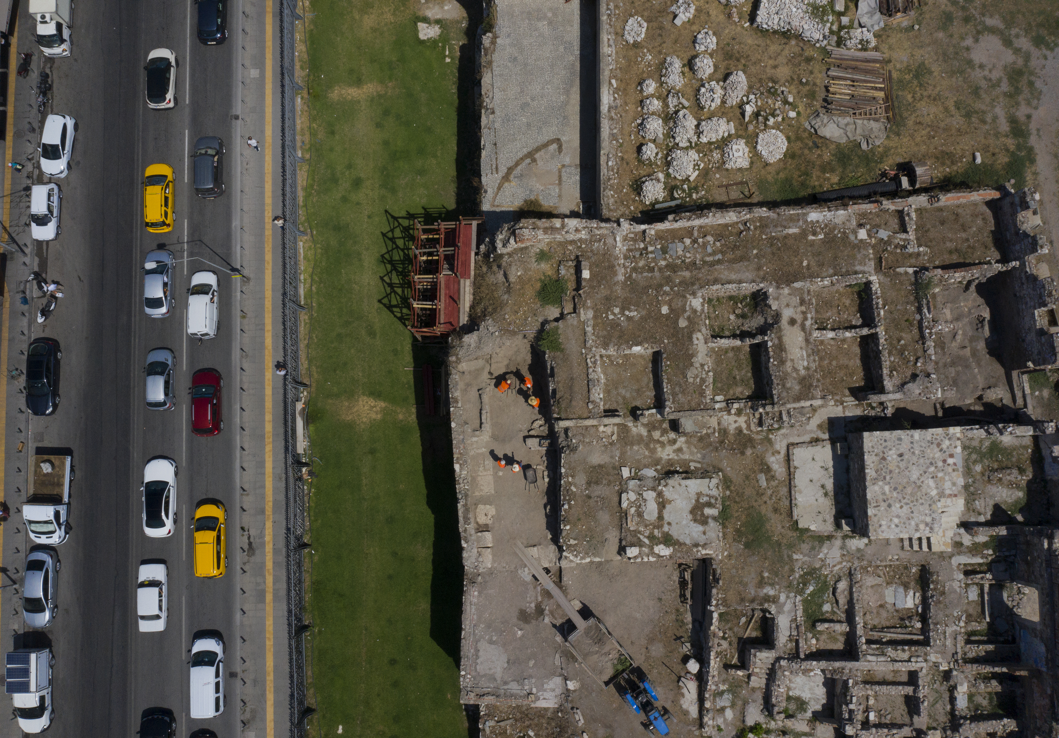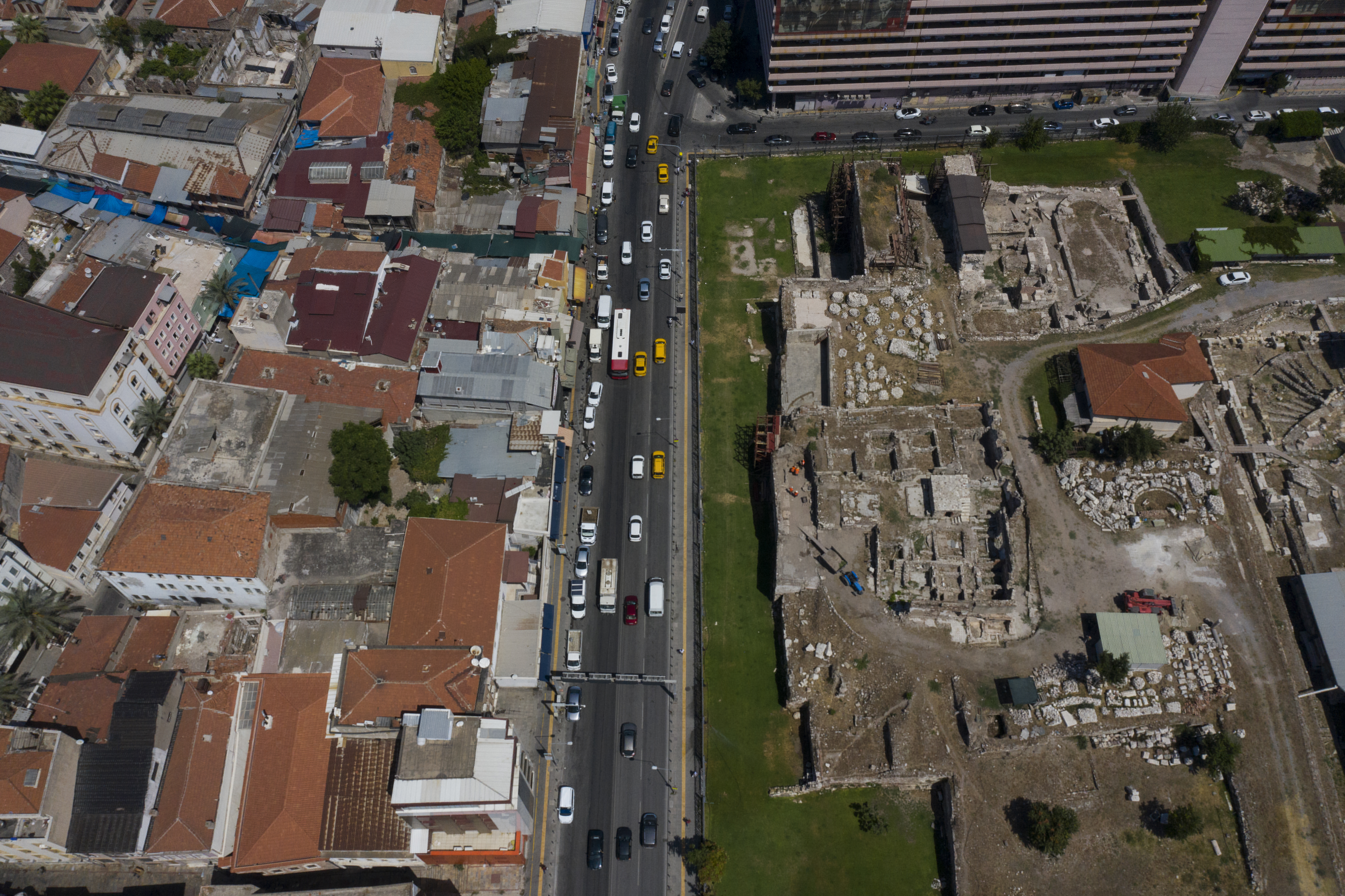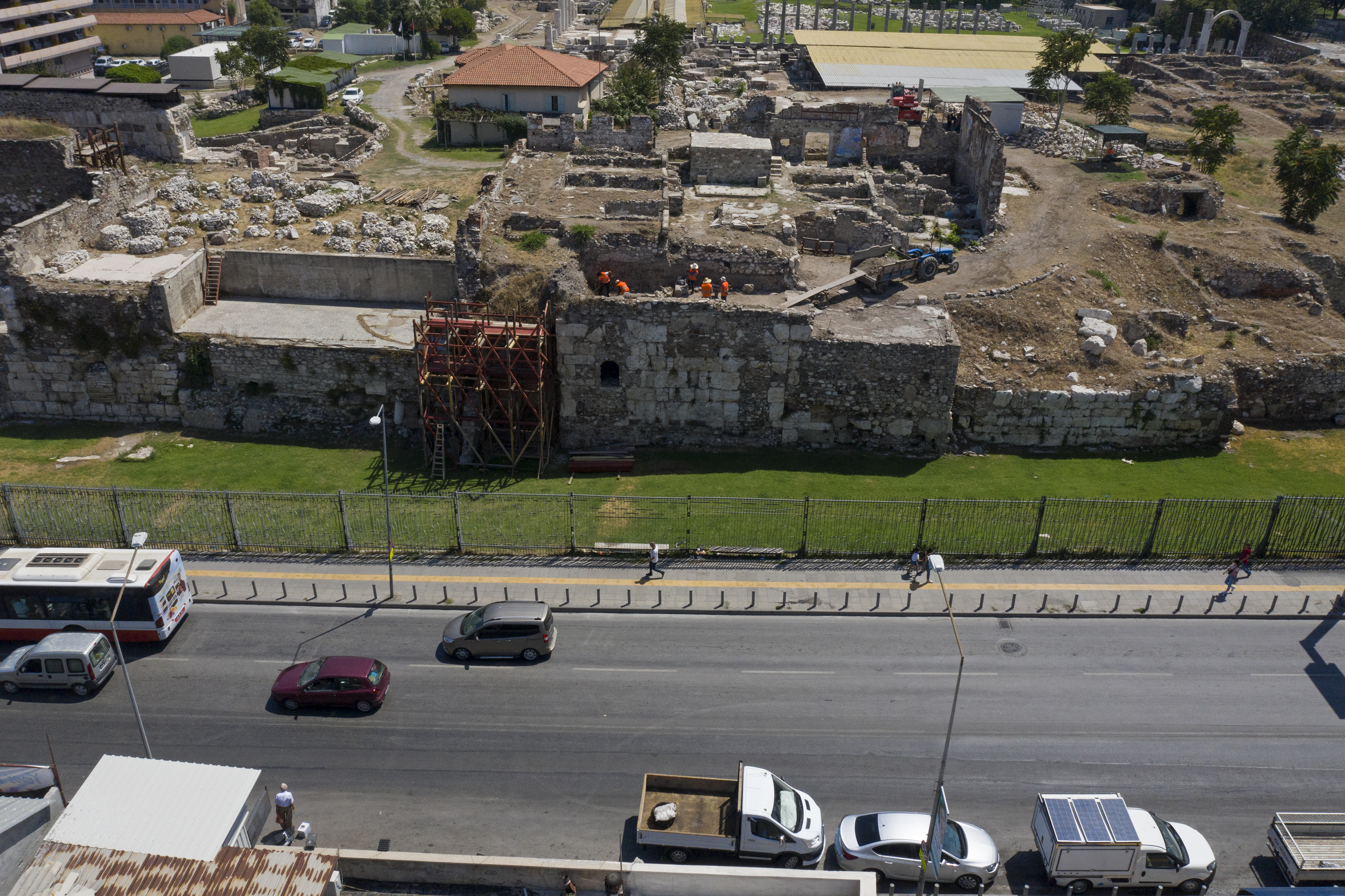 "İkiçeşmelik Caddesi'nden geçerken sur duvarı gibi algılanan, 7 metreye kadar yükselen duvarlar var. Bu duvarların üzerinde yaptığımız okumalar bize hamam ve gymnasium yapısının varlığını işaret ediyordu. Başka kentlerdeki kazılardan hamam ve gymnasium ilişkisini zaten biliyorduk. Üçüncü çıkış noktamız da şu oldu; kazısını yapamadığımız belki de yapamayacağımız noktalarda, alanlarda güney bölümüne giriş yapan, açılan bazı mekanların kapılarını ve bölümlerini ele geçirdik. Bütün izleri topladığımızda hamamın yanı sıra gymnasium yapısını da görmekteyiz."