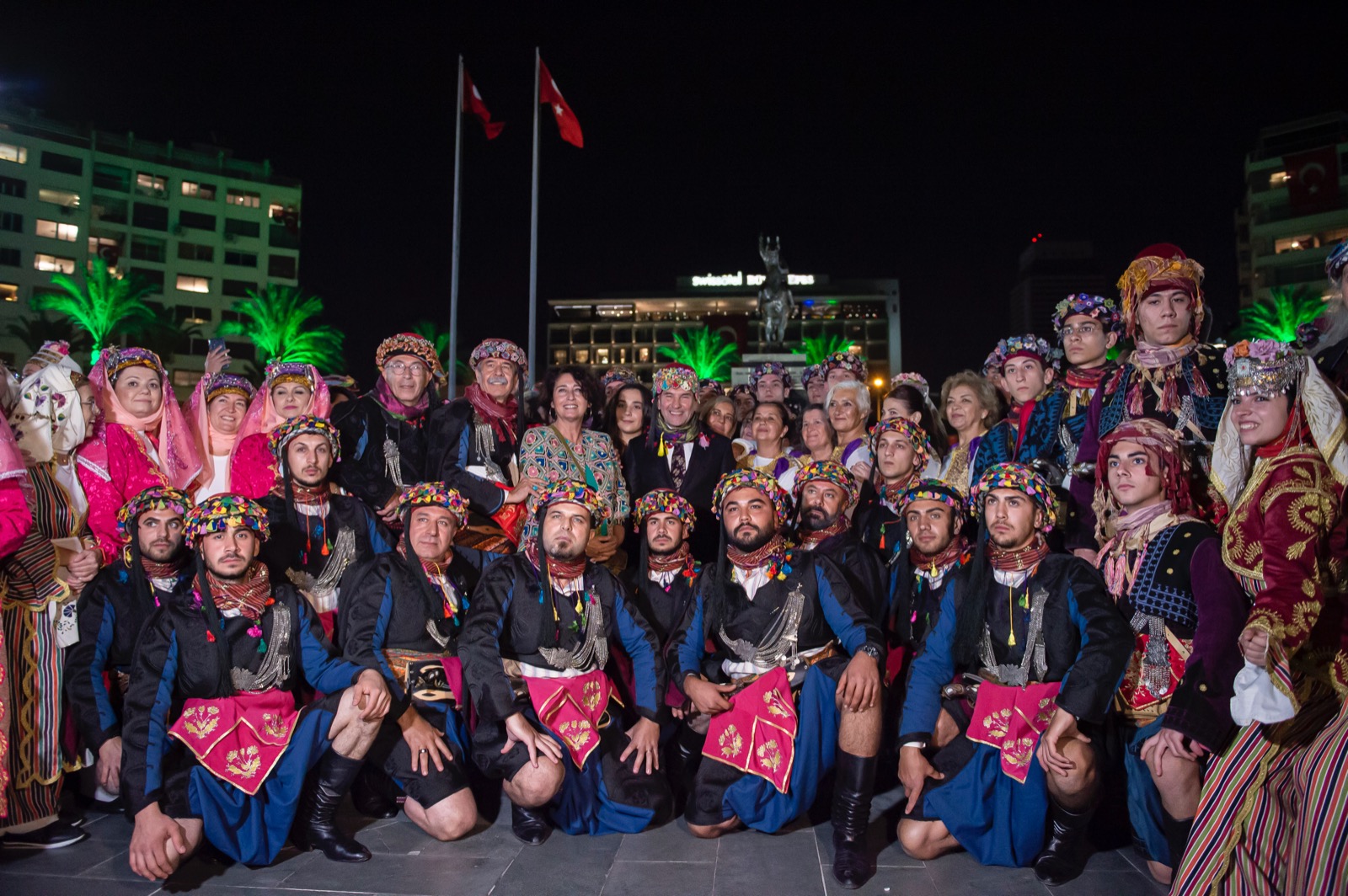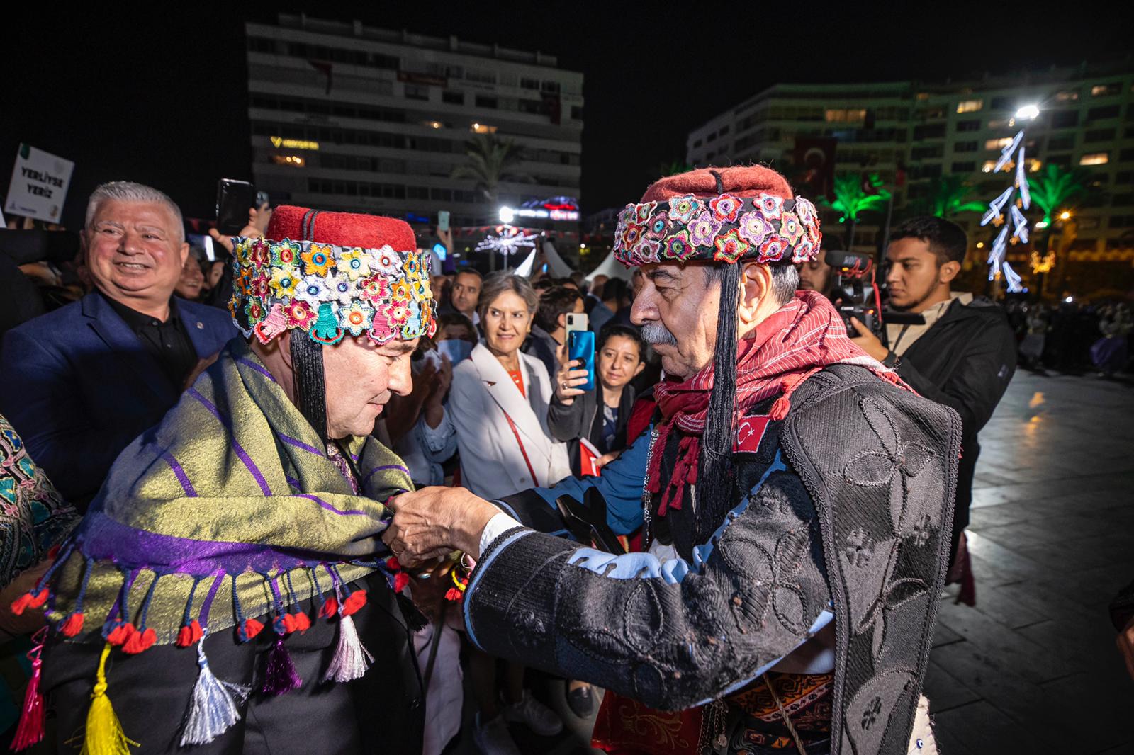 İzmir Büyükşehir Belediye Başkanı Tunç Soyer Cumhuriyet Meydanı’nda 9 ilçeden 200 zeybekle Ata’nın huzurunda diz vurdu.