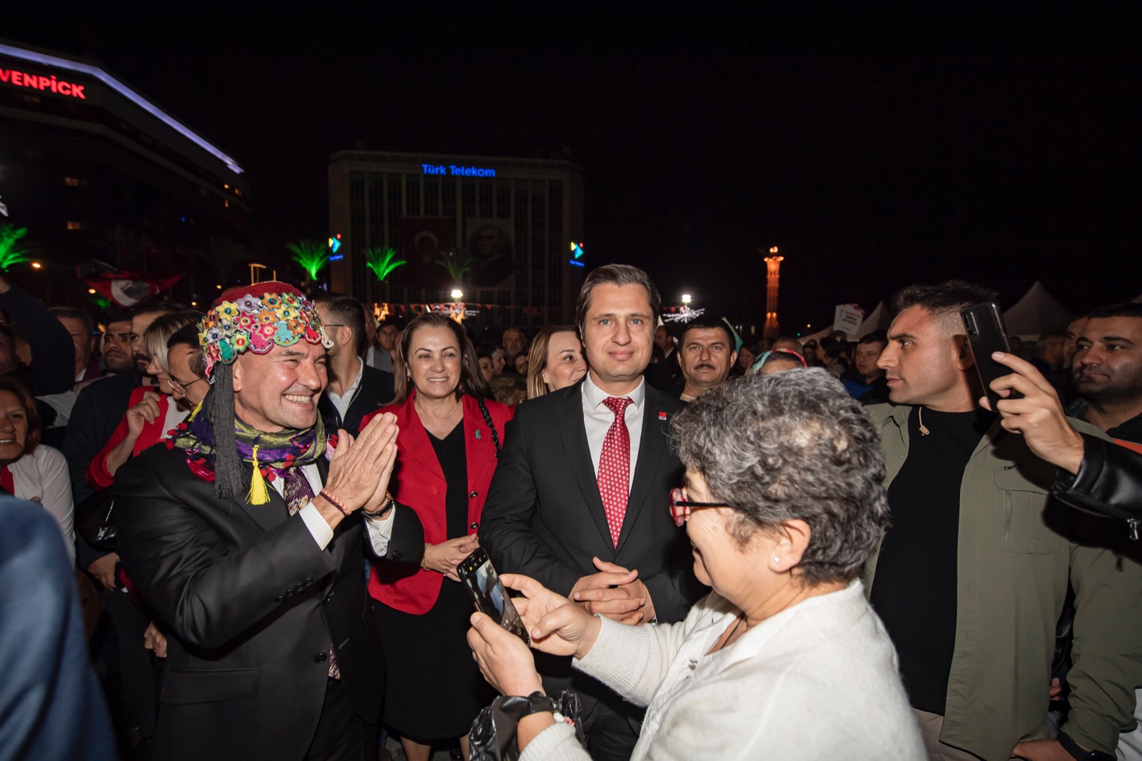 350 metrelik Türk bayrağının taşındığı fener alayıyla Kordonboyu’ndan Kültürpark’a yürüyen Başkan Soyer, çim alanda konser için toplanan İzmirlilerin bayramını kutladı.