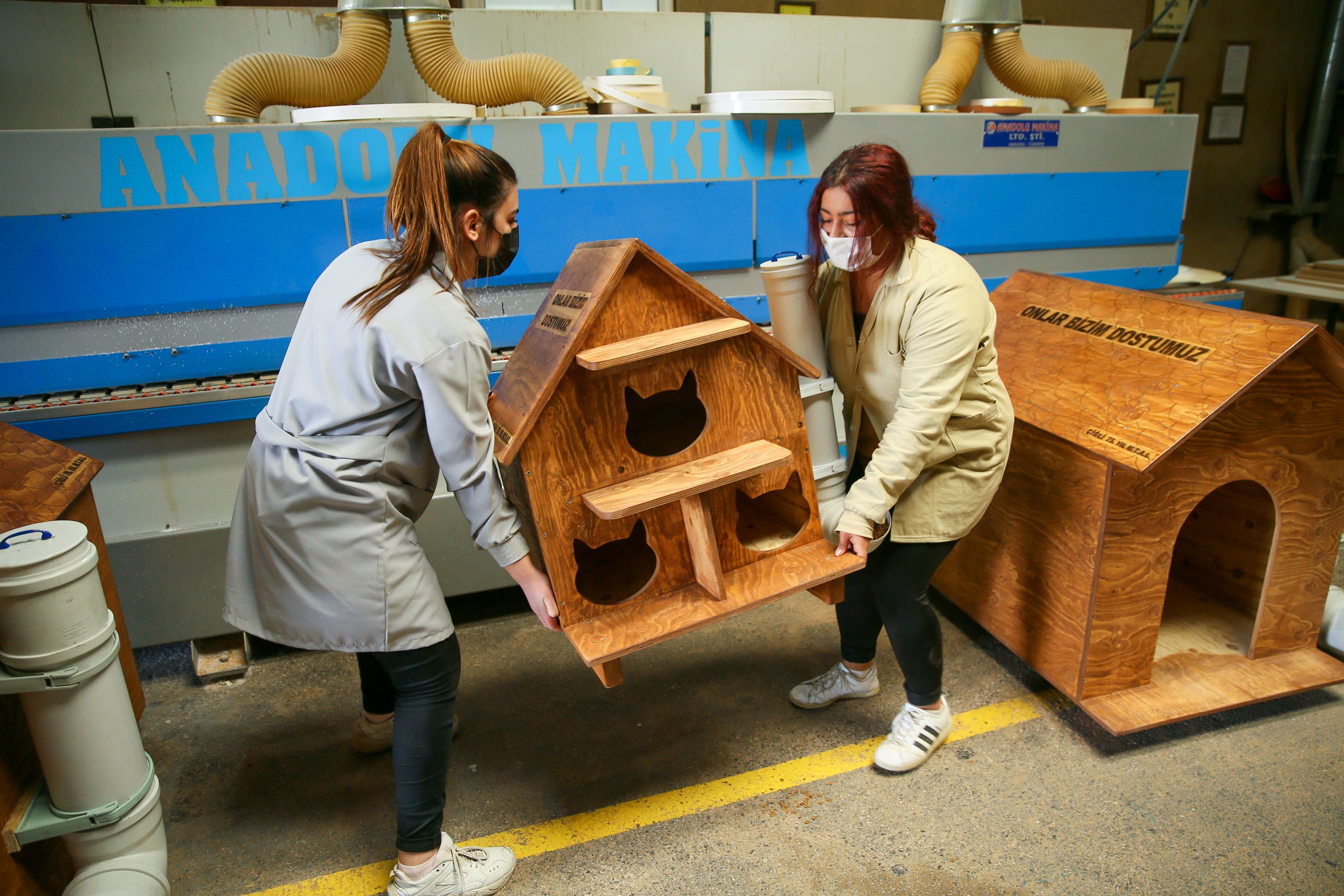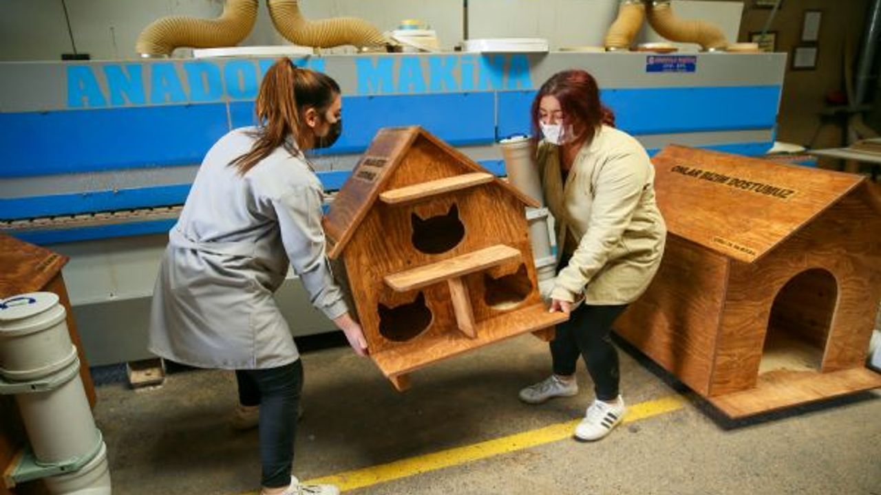 İzmir'de meslek liselerindeki mobilya bölümü öğrencileri, sokak hayvanlarının olumsuz havalardan etkilenmemesi için konforlu kulübeler üretiyor.