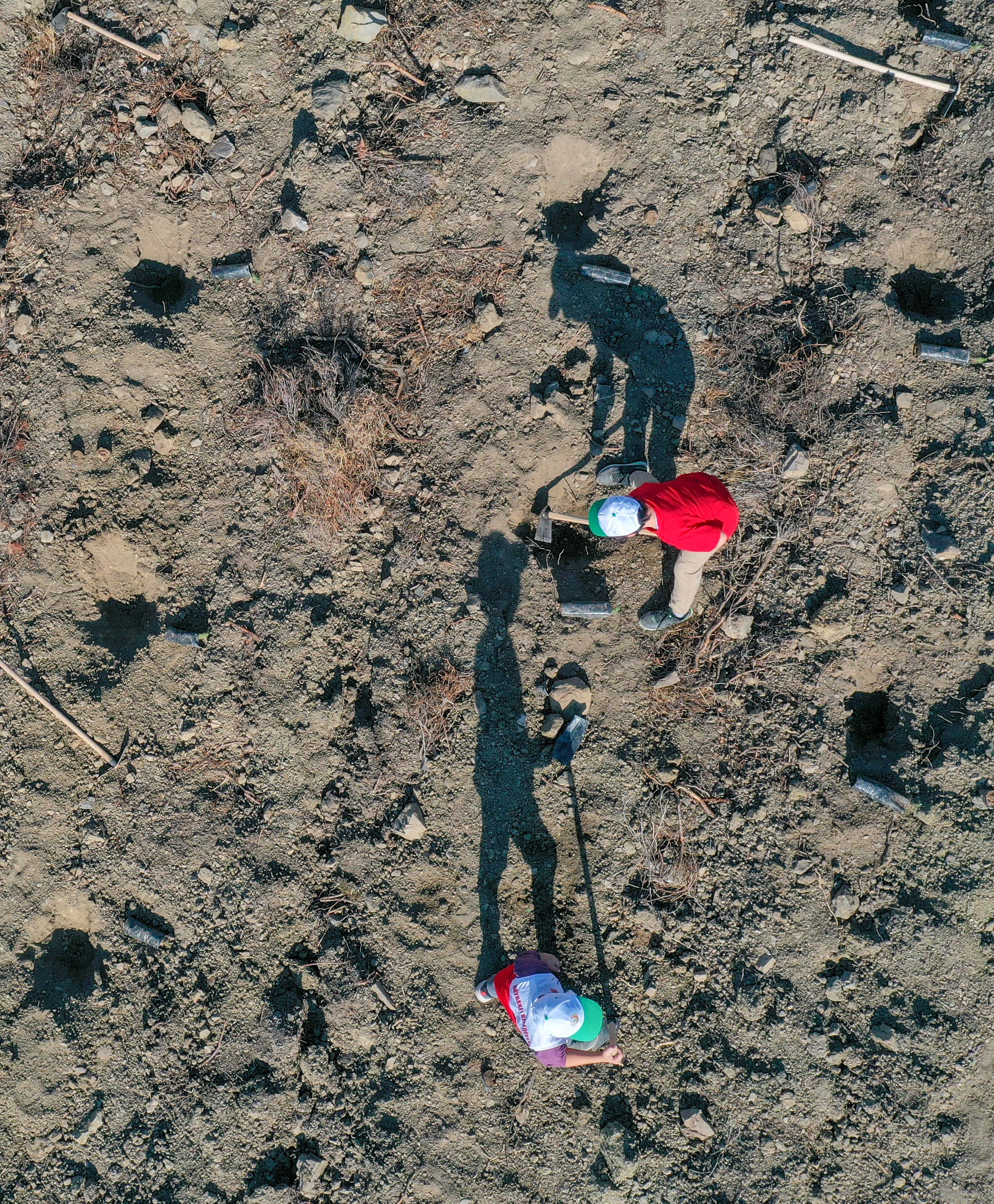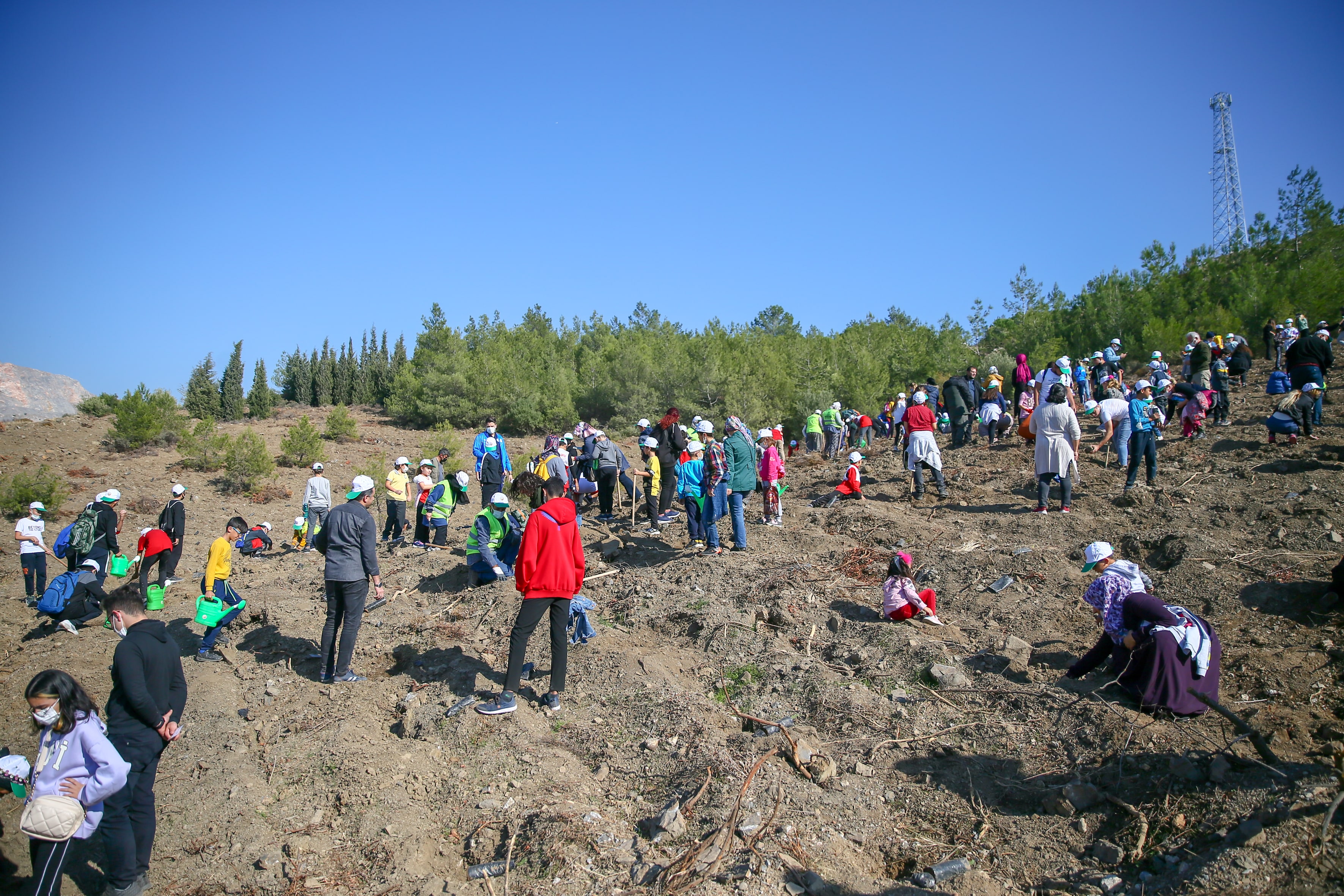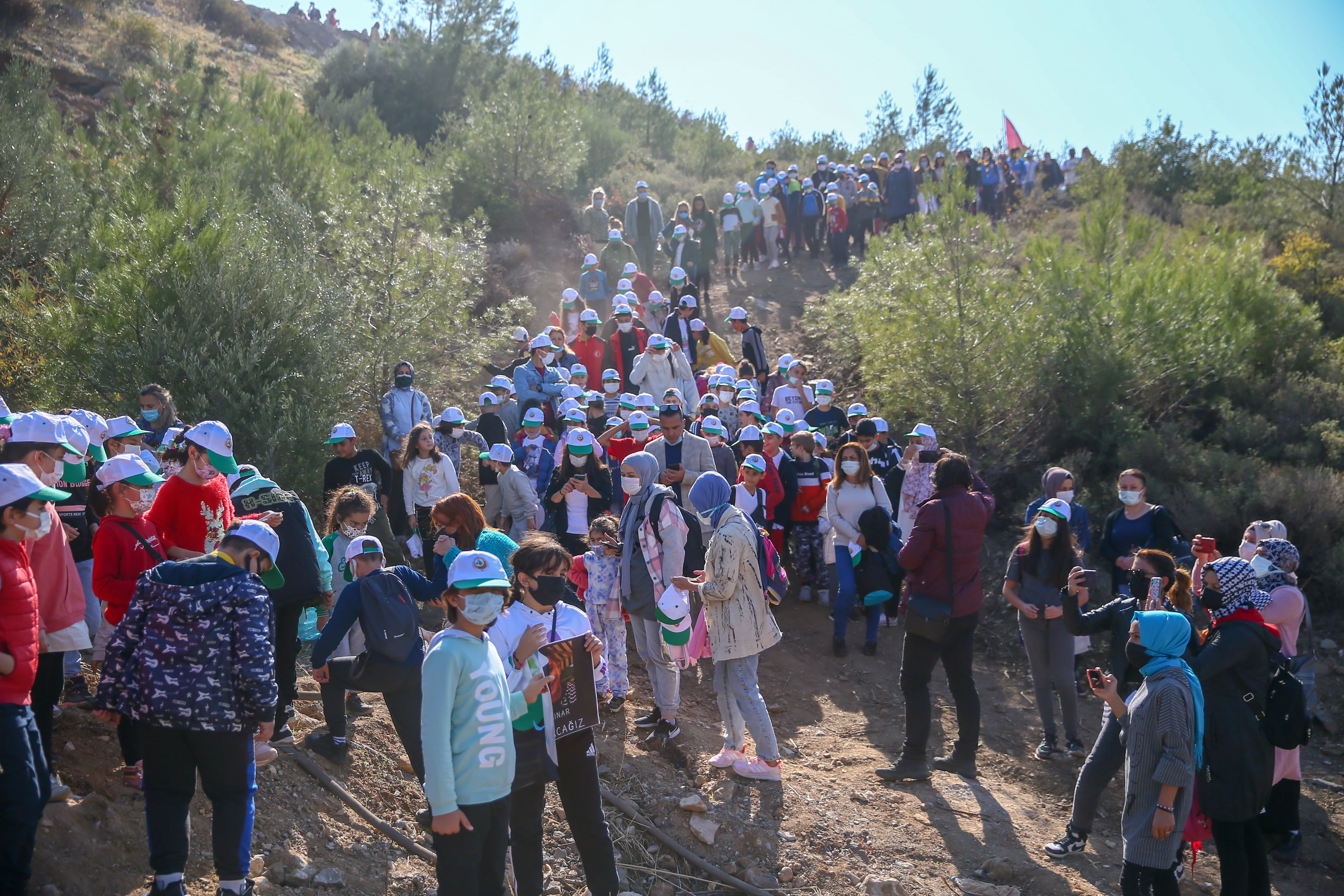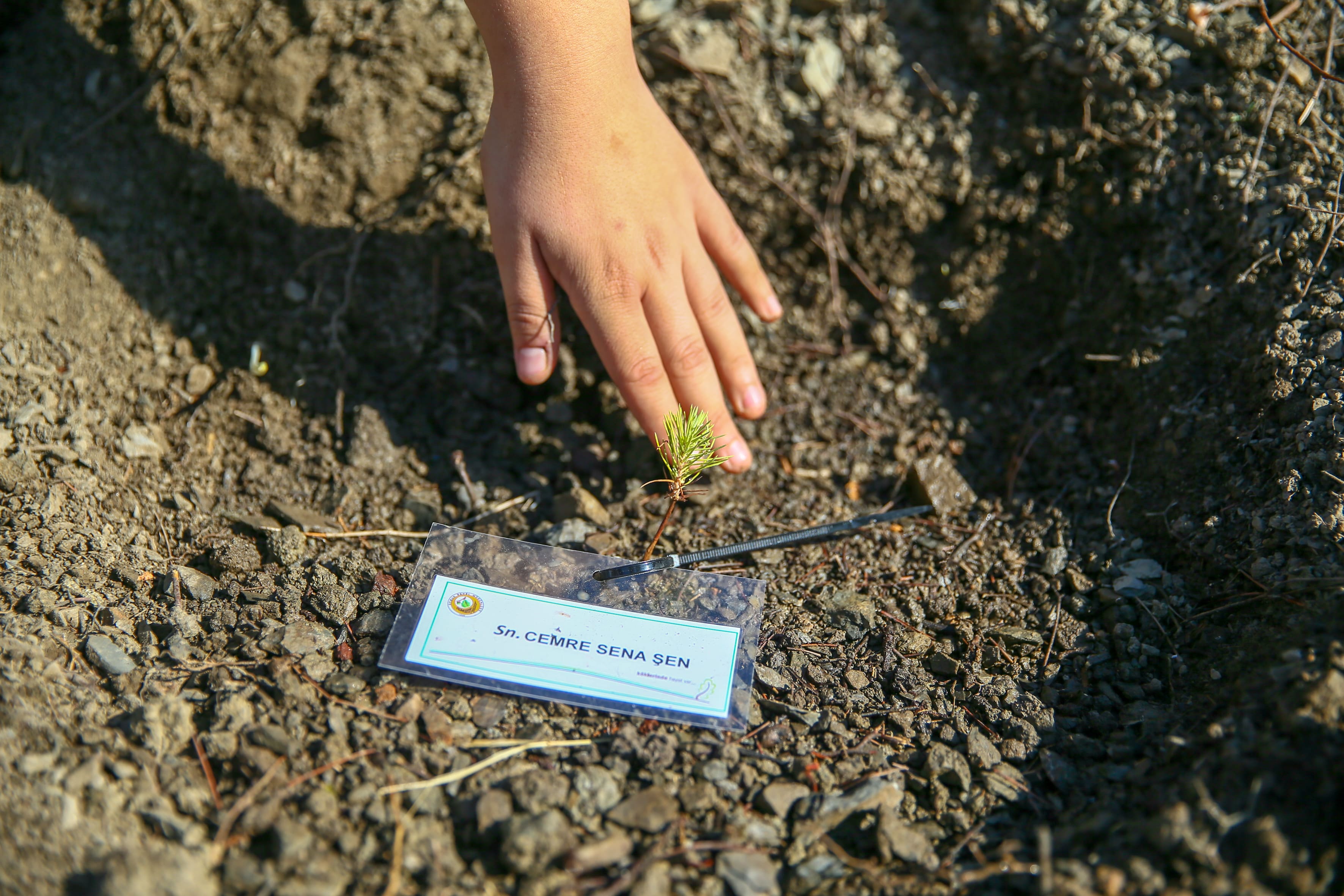 Burada 450 öğrenci, İzmir Orman Bölge Müdürlüğü ekipleriyle 600 selvi ve 900 kızılçam fidanını, ikizlerin anısına toprakla buluşturup can suyunu verdi.