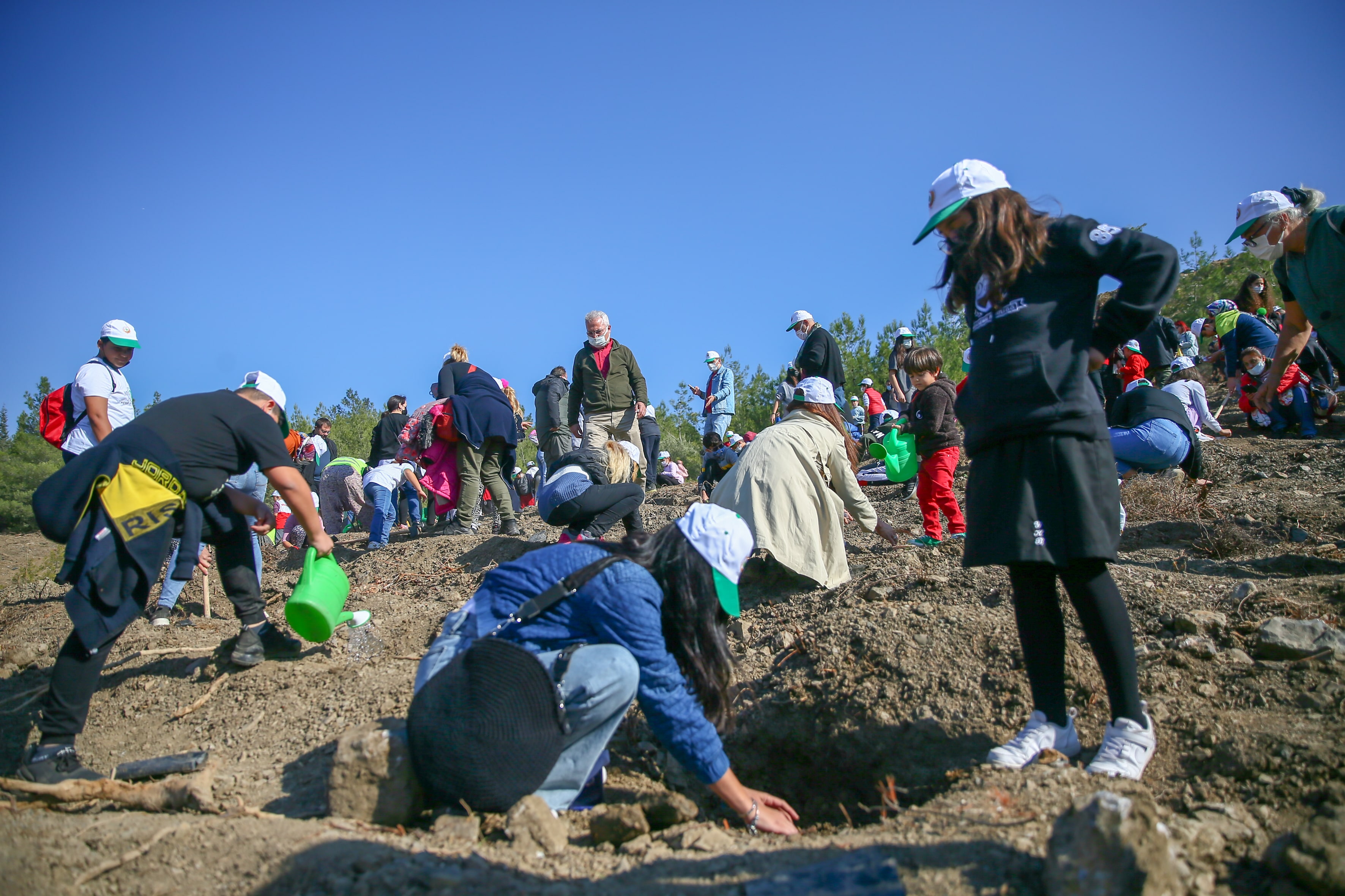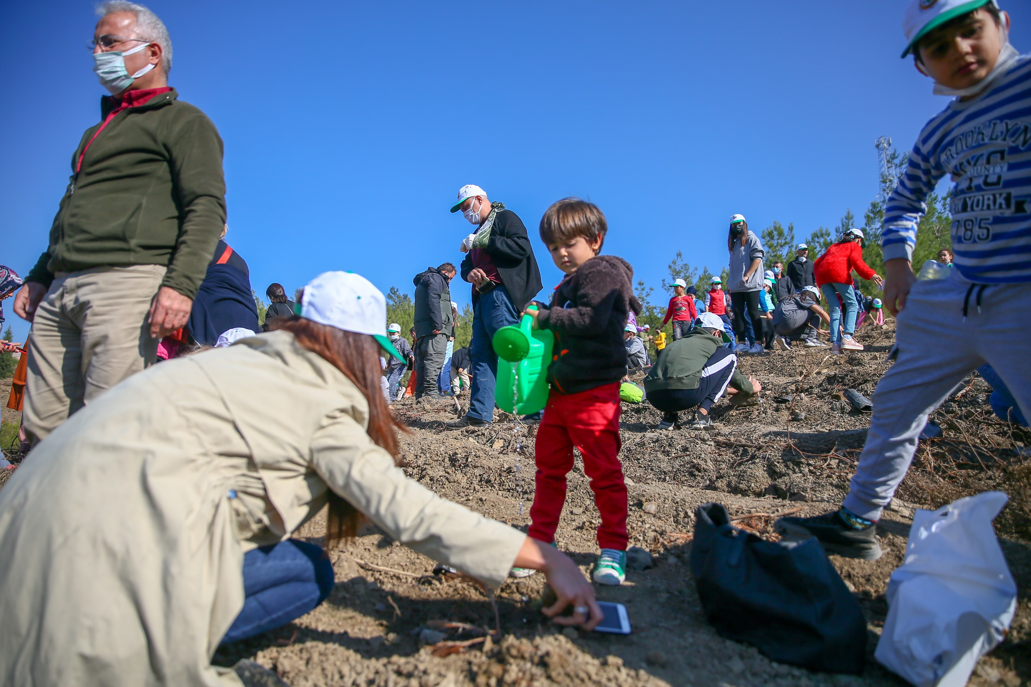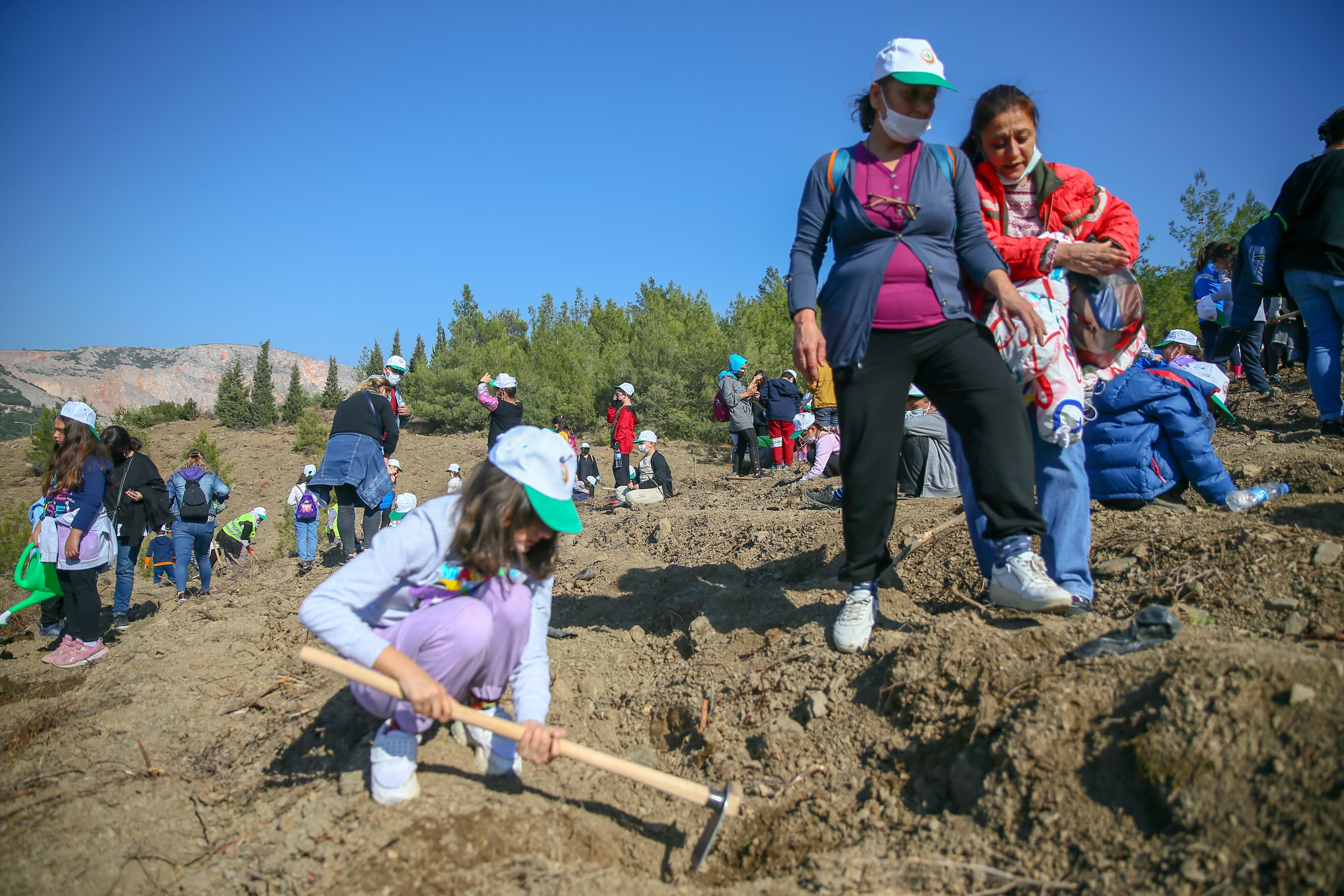 Anne Tülin Batmaz'ın sosyal medya üzerinden "İyilik İkizim" adını verdiği proje kapsamında, Bornova'daki Kavaklıdere ağaçlandırma sahasında oluşturulan hatıra ormanında fidan dikim etkinliği düzenlendi.