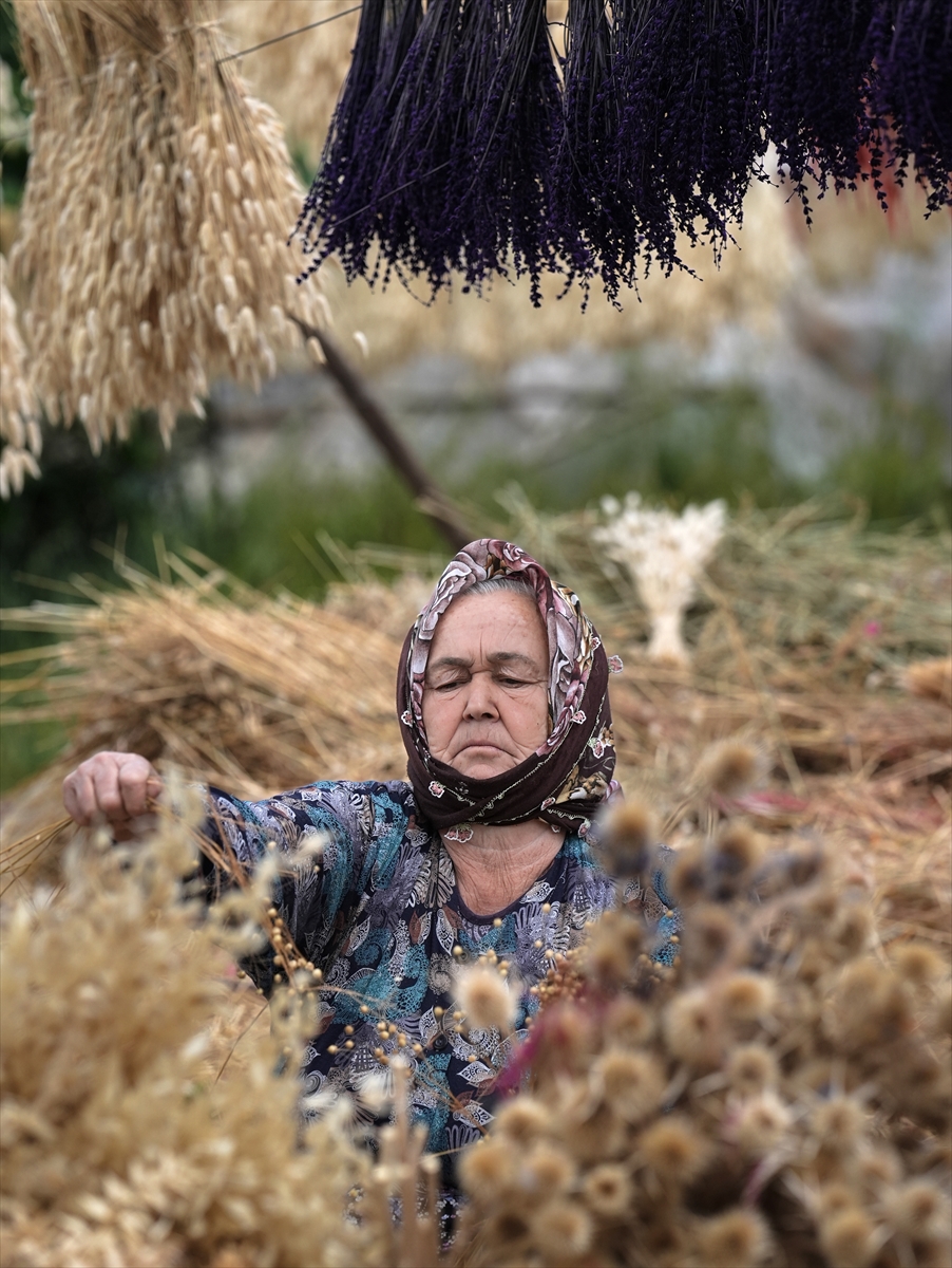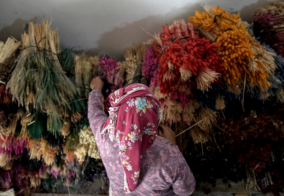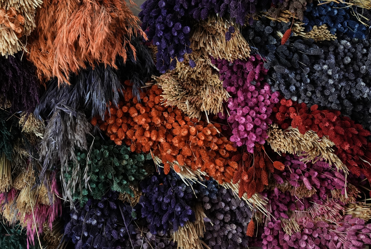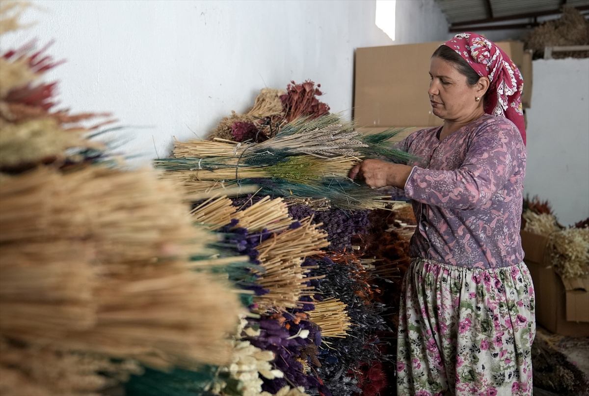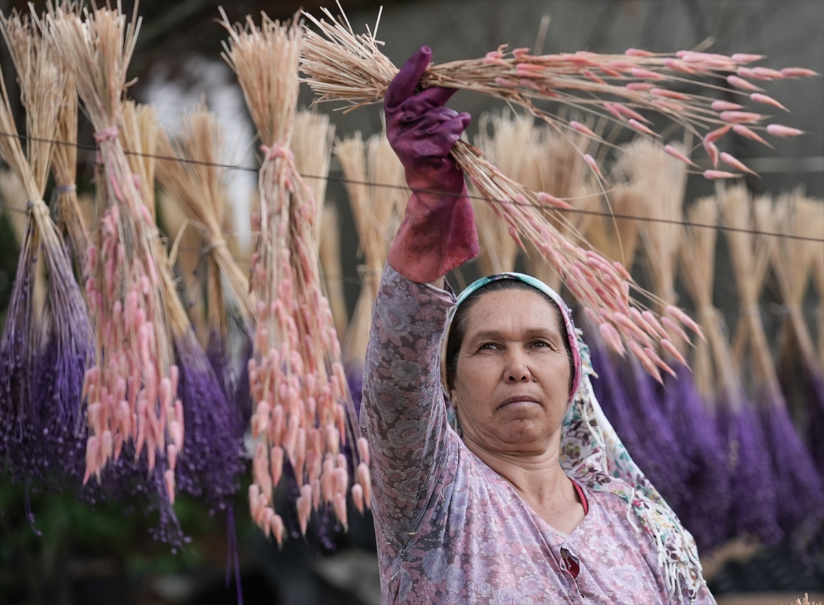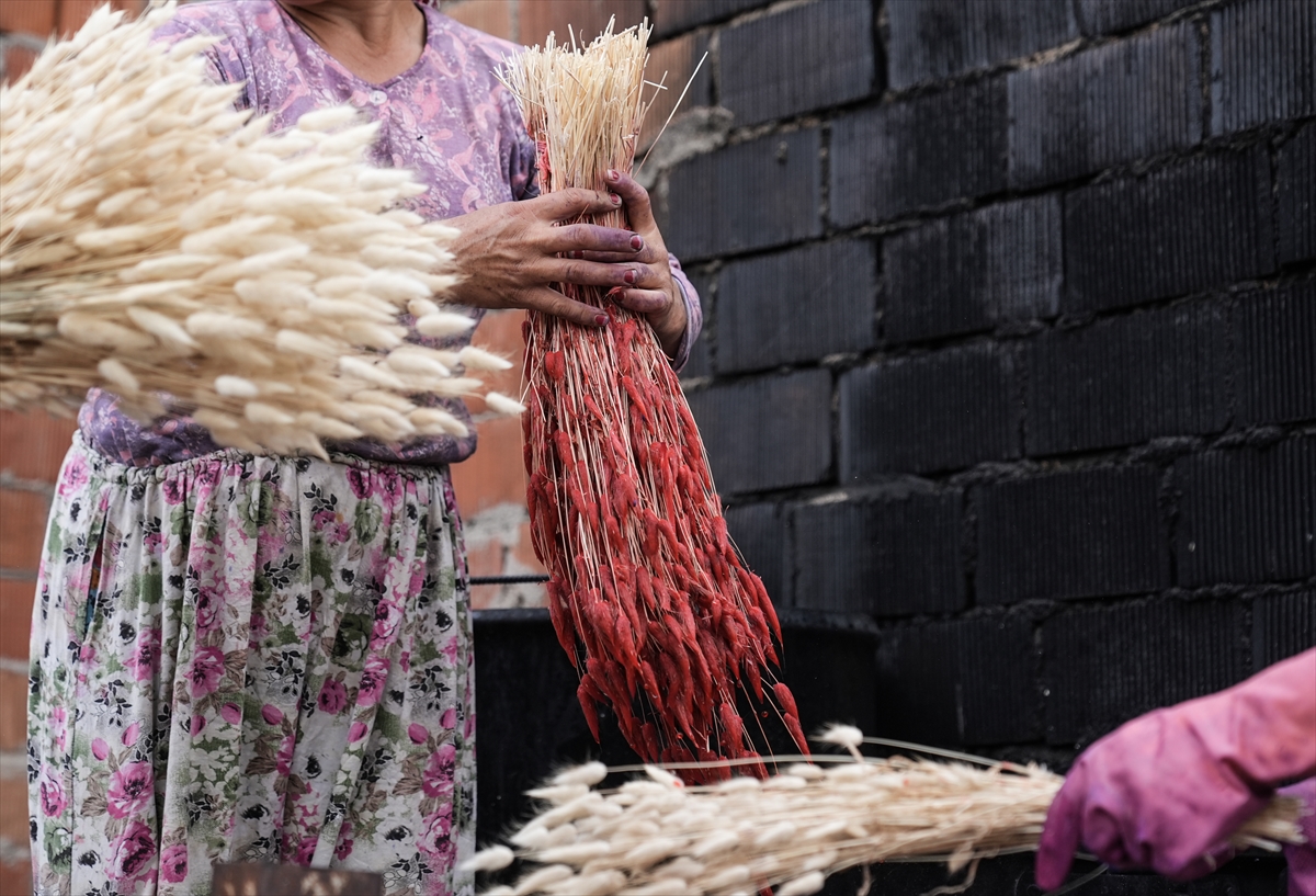 Evlerin önünde dezenfekte edilerek kurutulan bitkiler, yaprak ve tohumlarının dökülmemesi için bazı işlemlerden geçirilerek kazanlarda rengarenk boyanıyor. Özellikle iç mekan tasarımında aksesuar malzemesi olarak yoğun talep gören bu ürünler paketlenerek sipariş alınan alıcılara gönderiliyor.