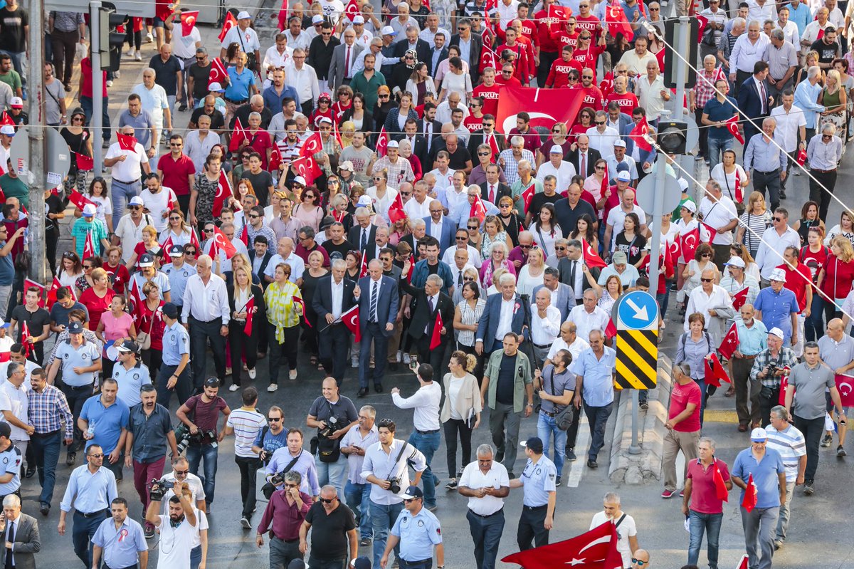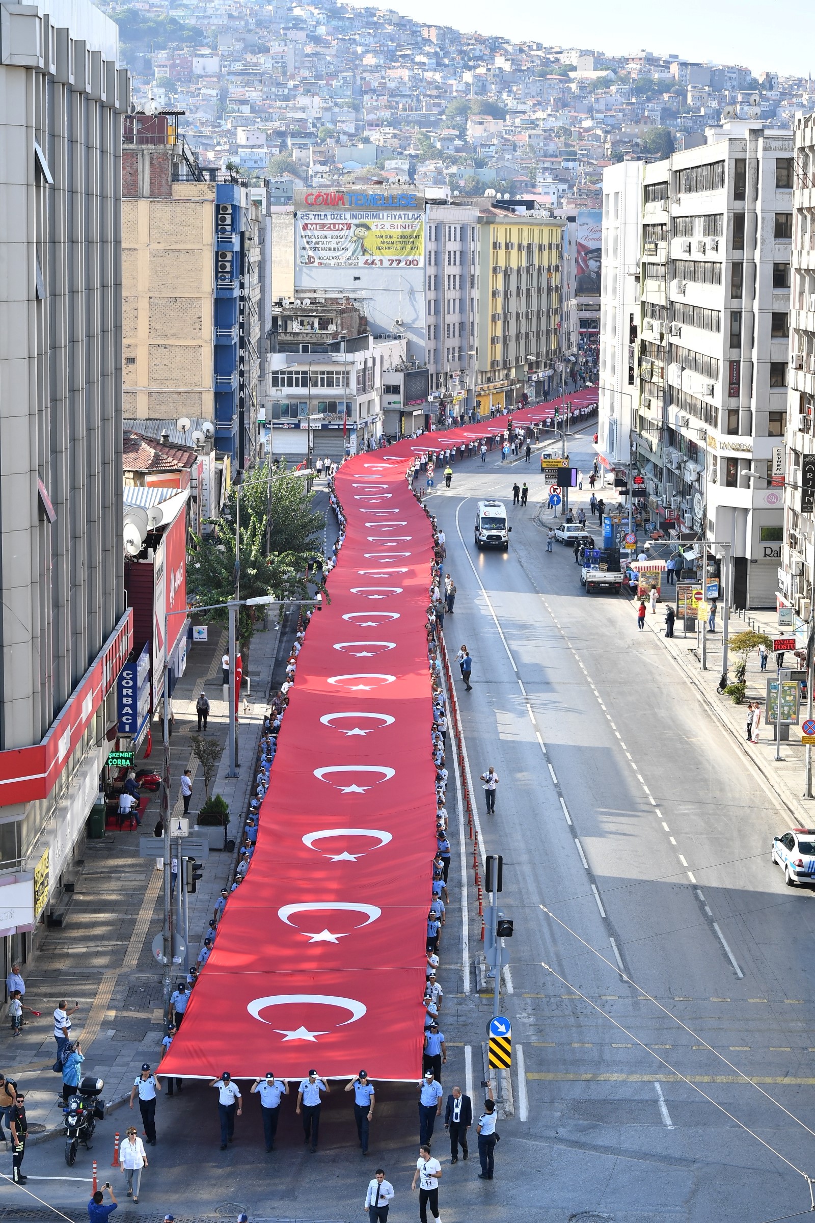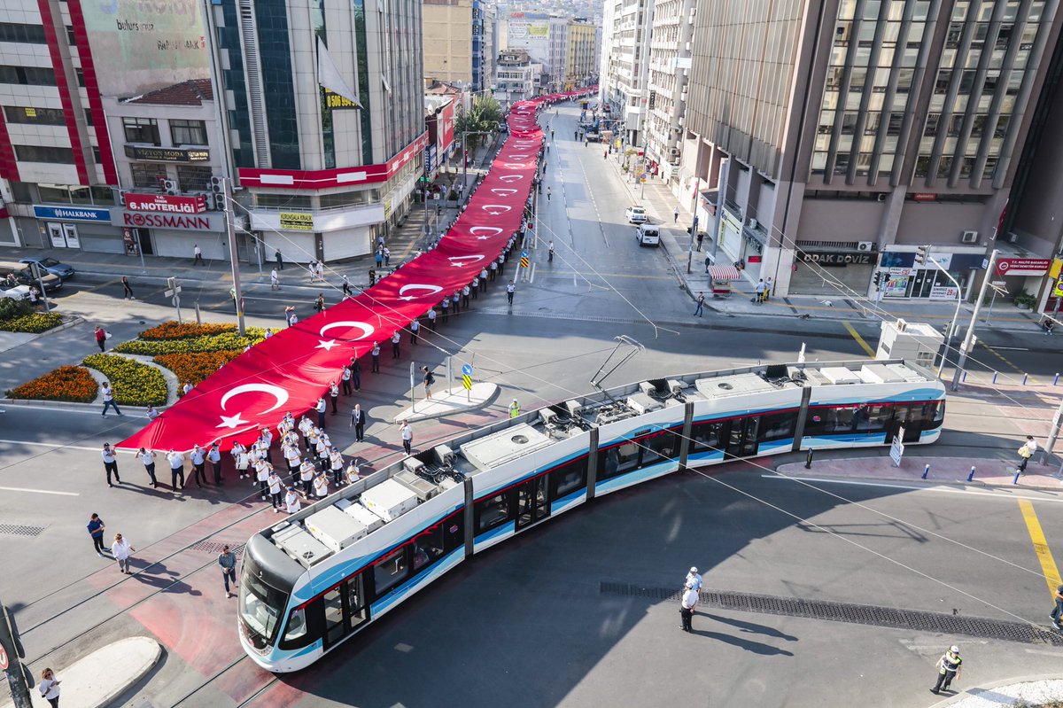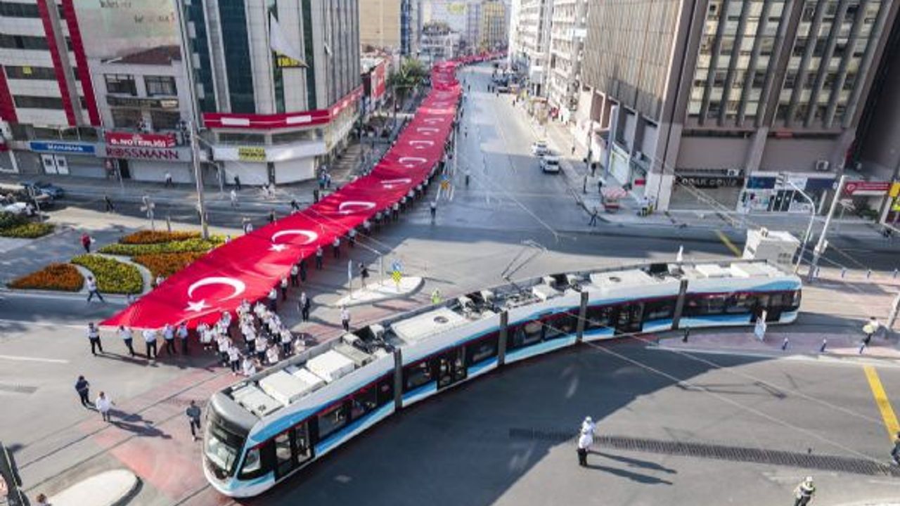 İzmir Büyükşehir Belediyesi'nin hazırladığı 350 metre uzunluğundaki Türk bayrağını taşıyan İzmirliler; Türk ordusunun kente girdiği tarihi güzergahı izleyerek Gaziler, Anafartalar ve İkiçeşmelik caddeleri üzerinden Cumhuriyet Meydanı'na ulaştı. Marşlar eşliğinde ilerleyen korteje çevredeki vatandaşlar da alkışlarla destek verdi. İzmir Büyükşehir Belediyesi bandosunun eşlik ettiği yürüyüşün ardından, Cumhuriyet Meydanı’ndaki Atatürk anıtına çelenk sunuldu.
