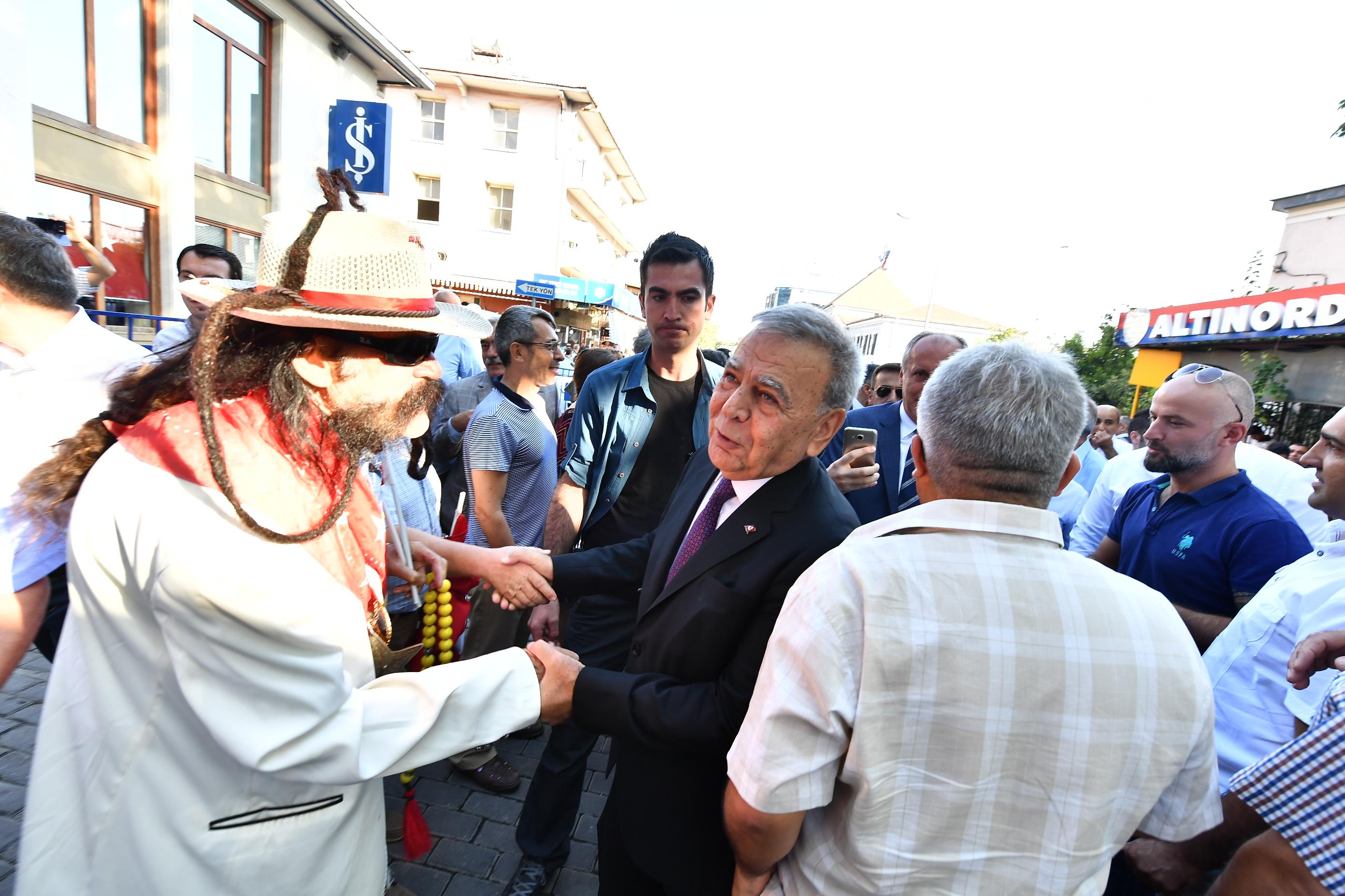 Basmane Meydanı’na Büyükşehir Belediye Başkanı Aziz Kocaoğlu ile gelen İnce’yi görev vatandaşlar sevgi gösterilerinde bulunuyorlar.