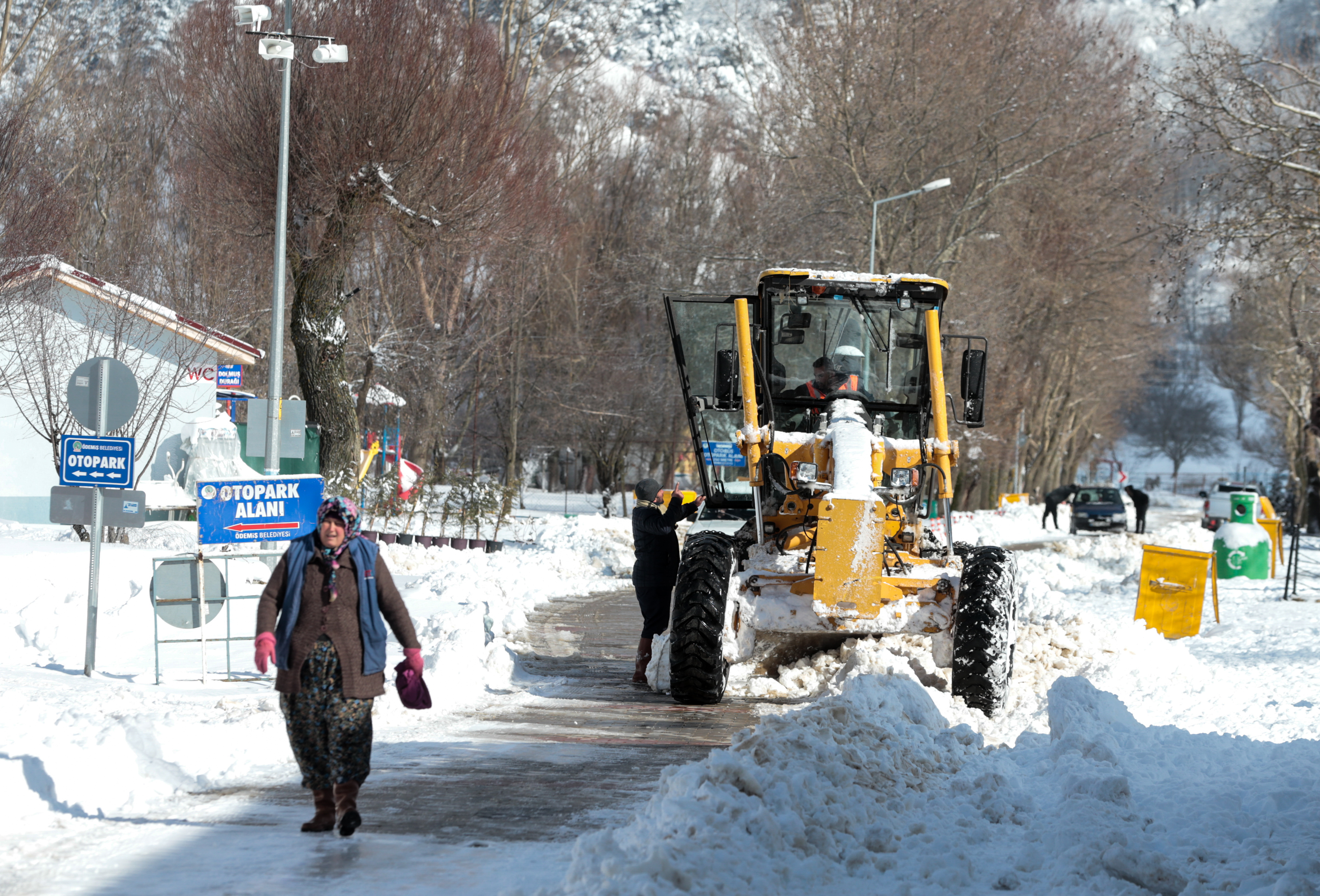 Öte yandan İzmir Büyükşehir Belediyesine bağlı ekipler bölgede kapanan yolları açmak için kar küreme çalışması yürütürken, esnaflar ise dükkanlarının önünde biriken karı kürek yardımıyla temizliyor.