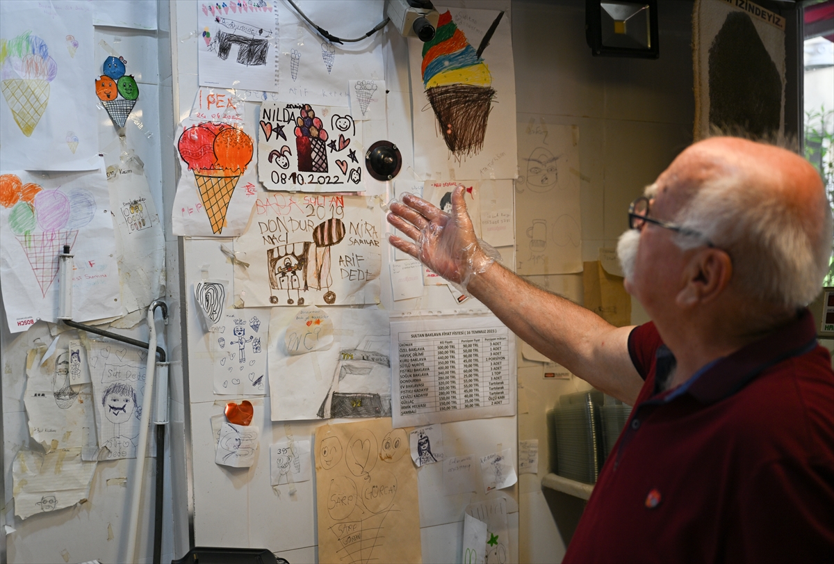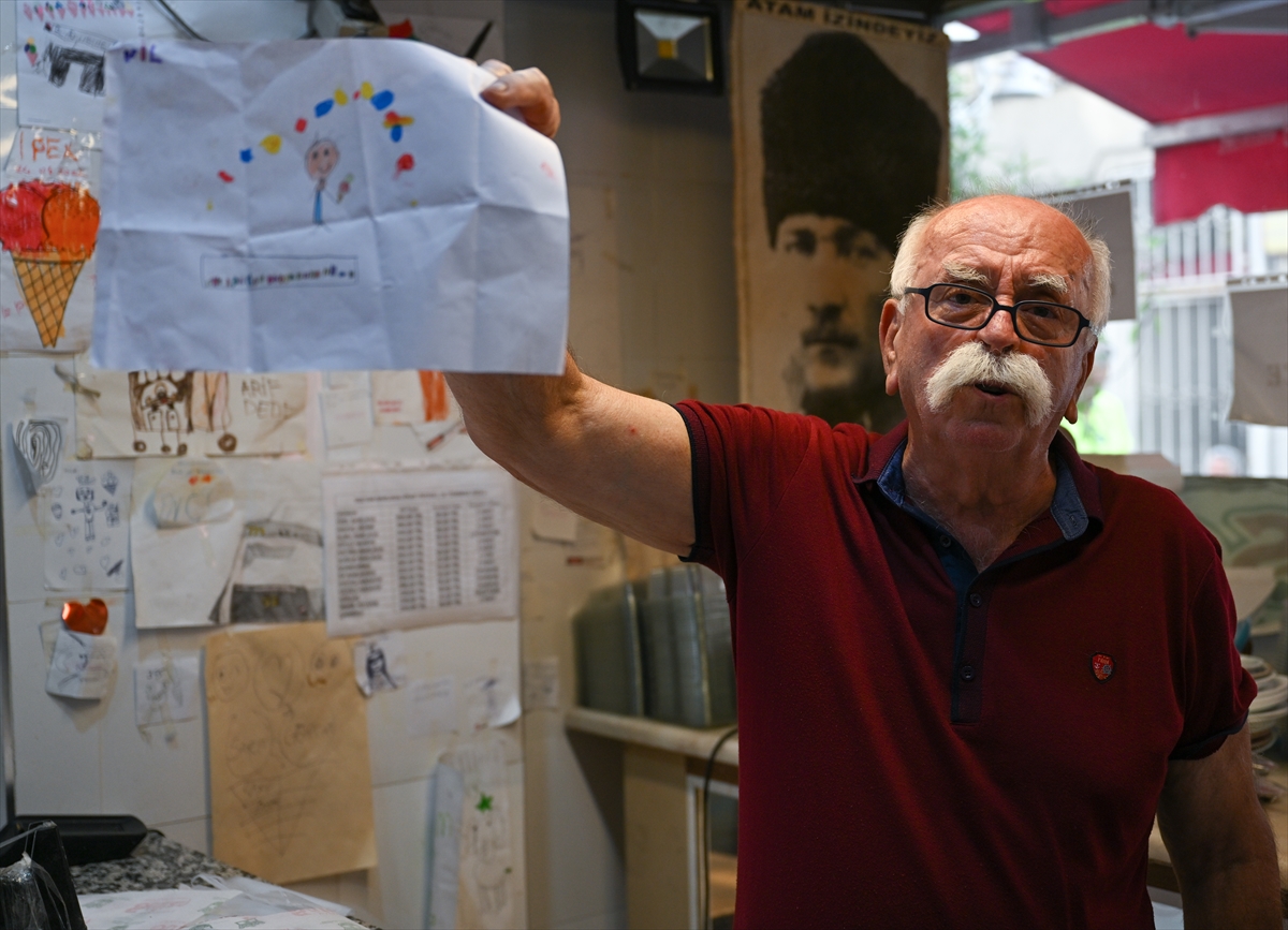 Suyolcu, kendisine "Arif Dede", "Dondurma Dede", "Süt Dede", "Pala Dede" diye seslenen çocukların çizdiği resimleri de dükkanında sergiliyor.