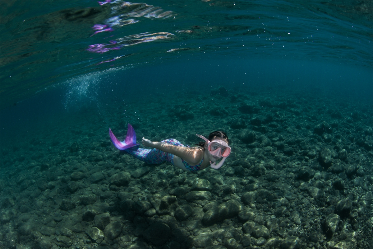 "Deniz kızı" kostümüyle 6 yaş üstü kişilere verilen mono paletli dalış kursu, çevrim içi ve yüz yüze yapılan teorik eğitimin ardından uygulamalı eğitimle devam ediyor.