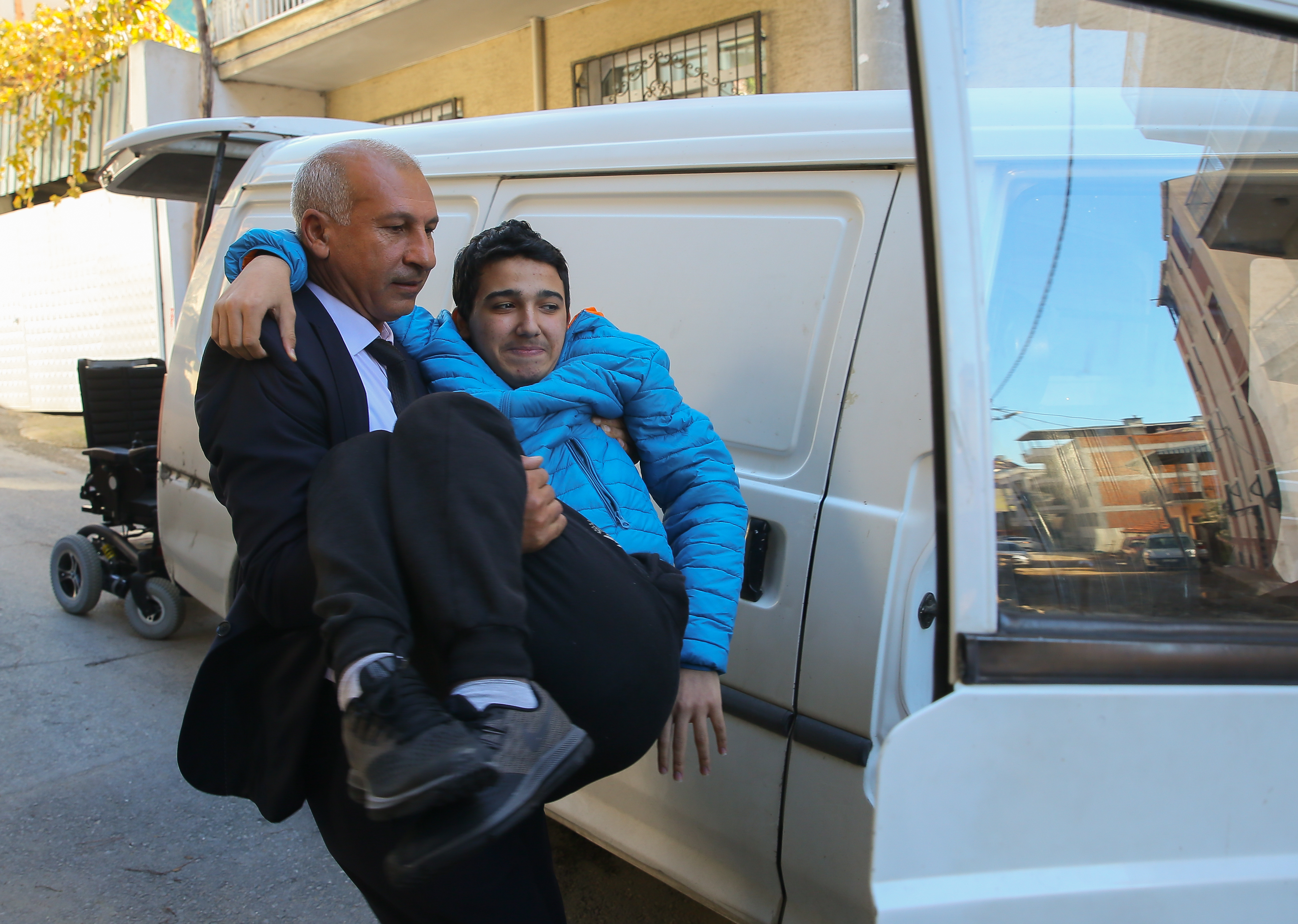 "Yağmurda, soğukta... Liseye başladığında kayıt olduğu okulun binası engelliler için uygundu. Hele onu Birol öğretmen taşımaya başladıktan sonra 'Ben artık engelli annesi değilim.' dedim. Hep engel vardı önümüzde o zamana kadar. İki yıl boyunca Birol öğretmen her gün geldi. İki kere arabası bozulduğu için gelemedi. Telefonla gelemeyeceğini söylerken de mahcuptu. Çocuklar bir yaramazlık yapar da mahcup anlatır ya. Hastayken bile geldi. Raporluymuş, geldi Samet'i götürdü, sonra evine gitti. Hastayım demedi, ben sonradan duydum. Samet hastalığını öğrendikten sonra dersi boş vermişti. Sonra kendine kendine 'Hocam oradan geliyor buraya kadar benim için. Ben de o yüzden ders çalışacağım artık.' dedi."