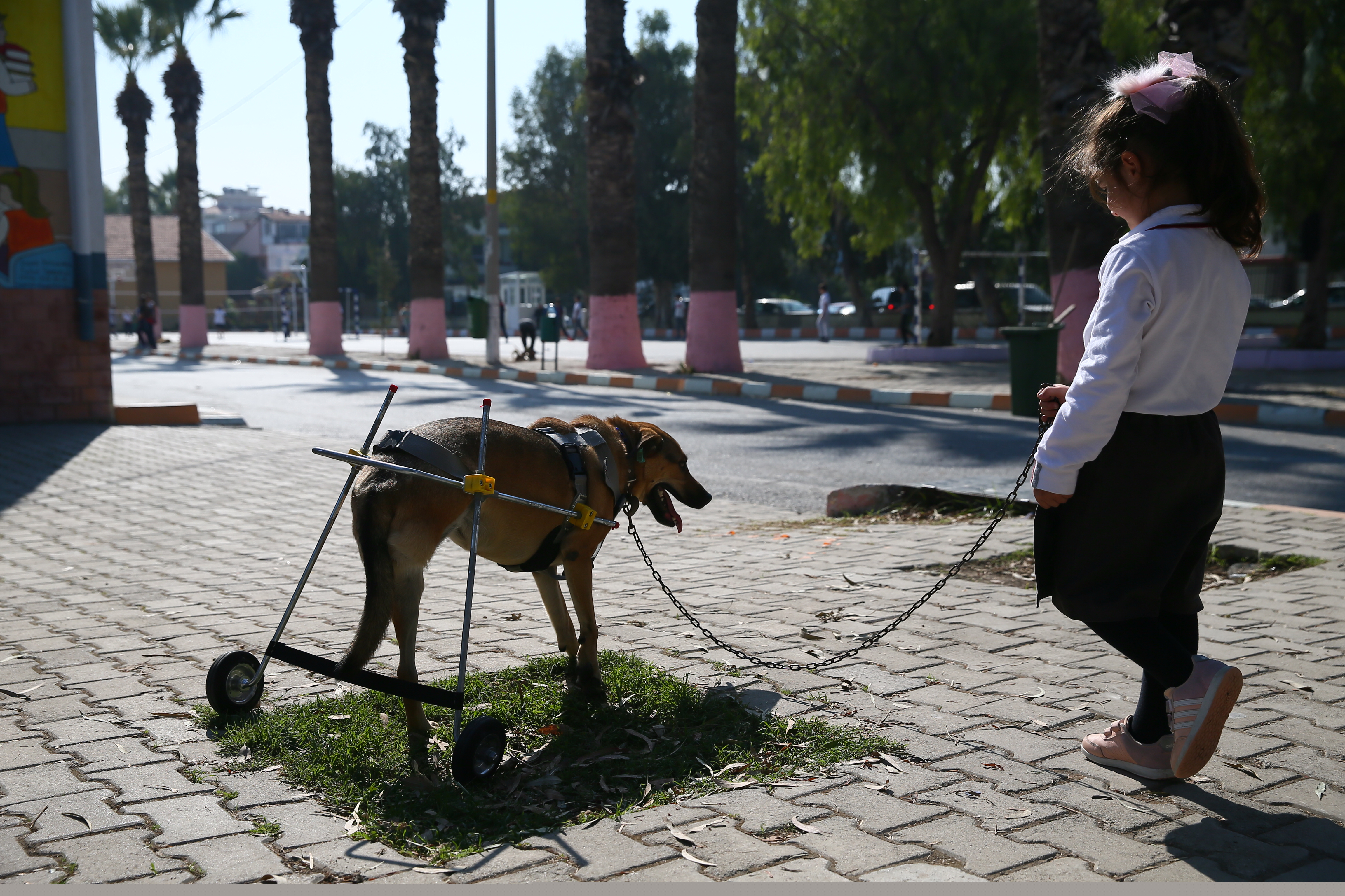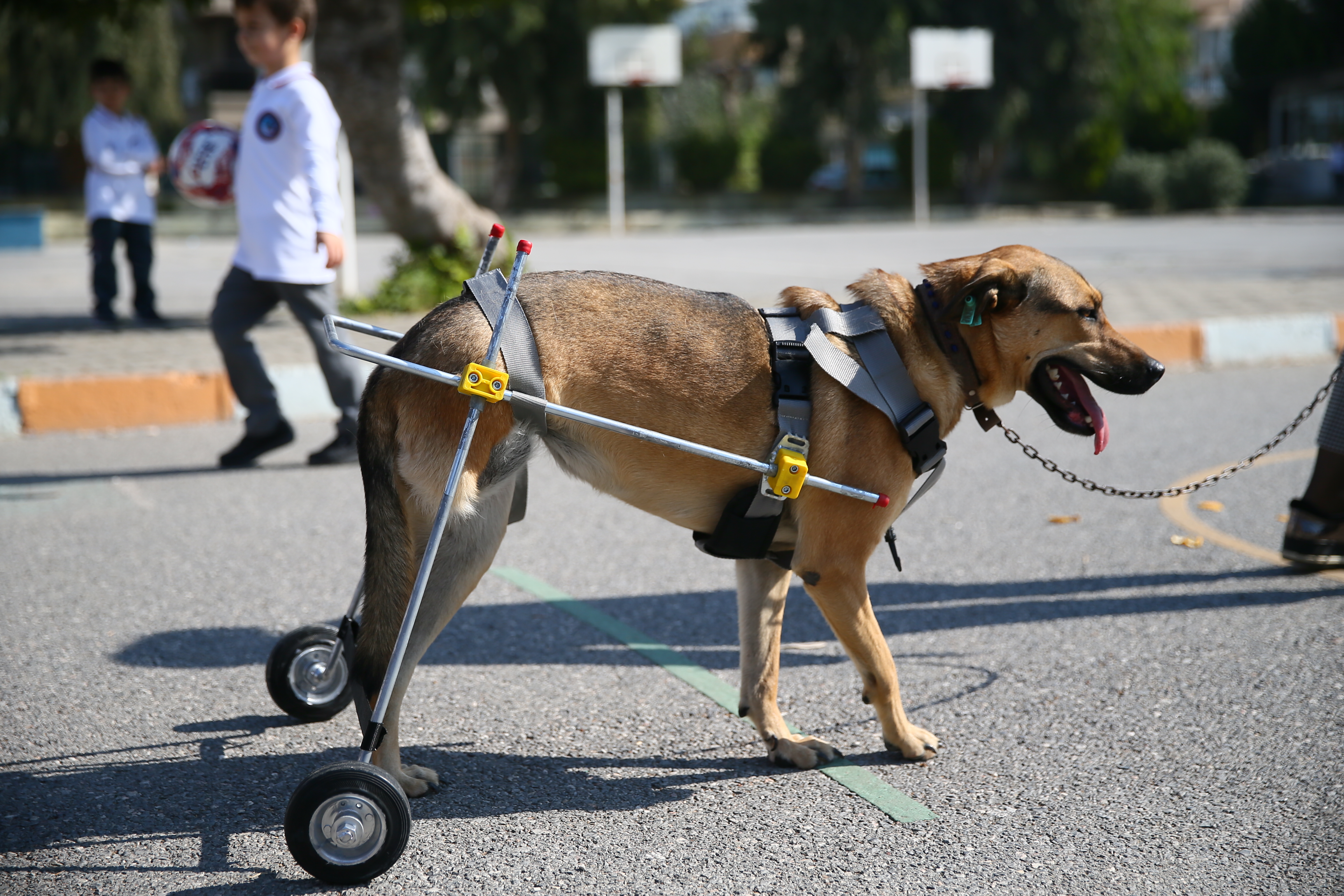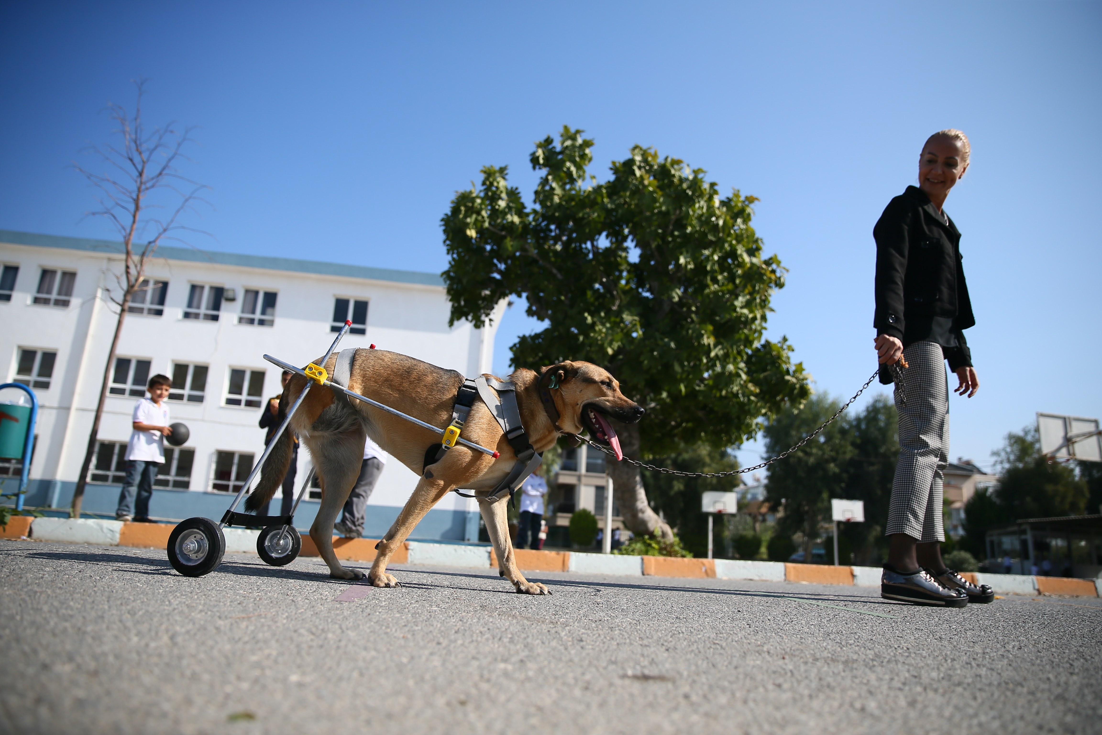 Öğretmenin girişimleri sayesinde, aracın çarpması sonucu arka bacağı kopan "Fıstık" adlı köpek de protez yürütece kavuştu.