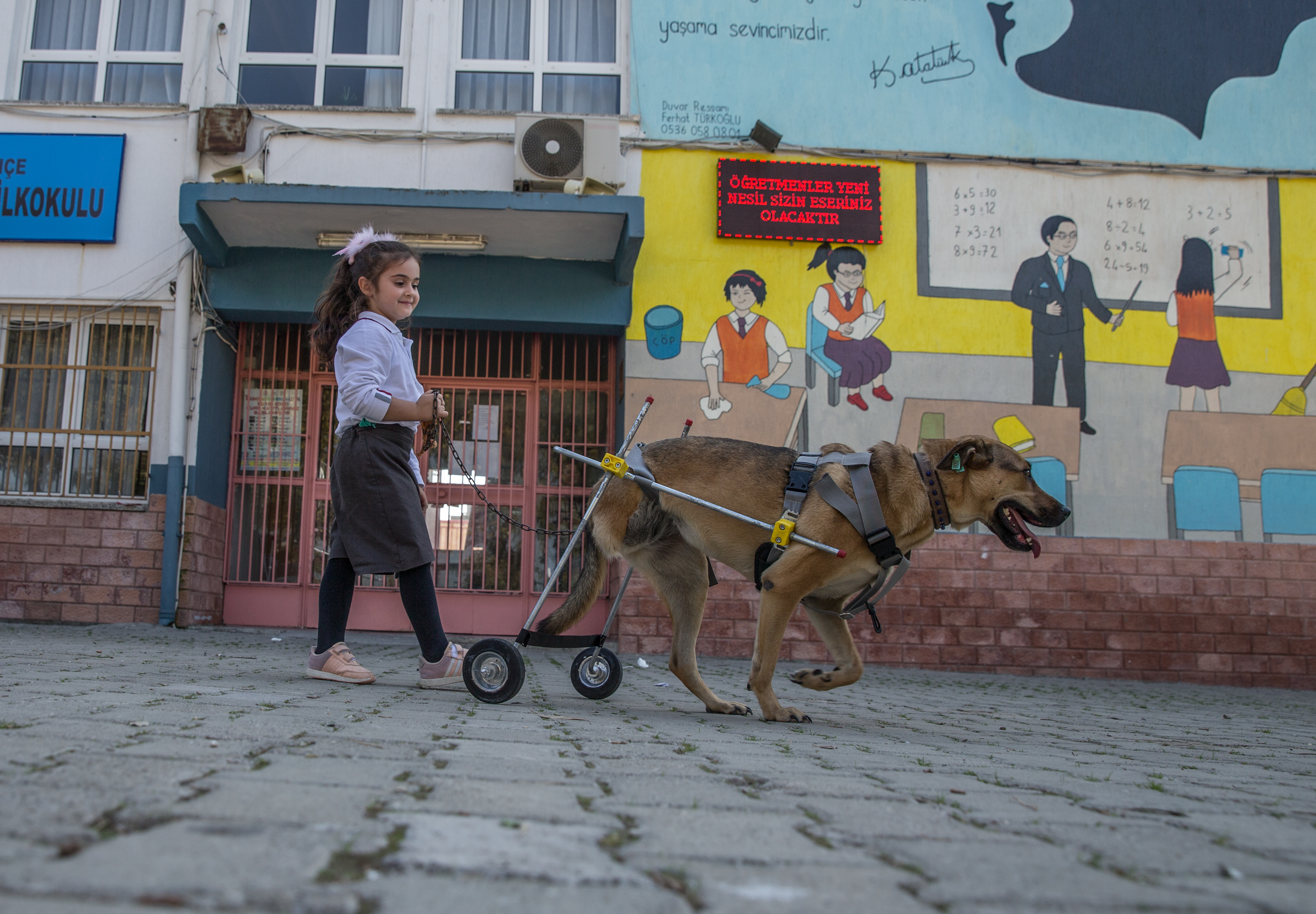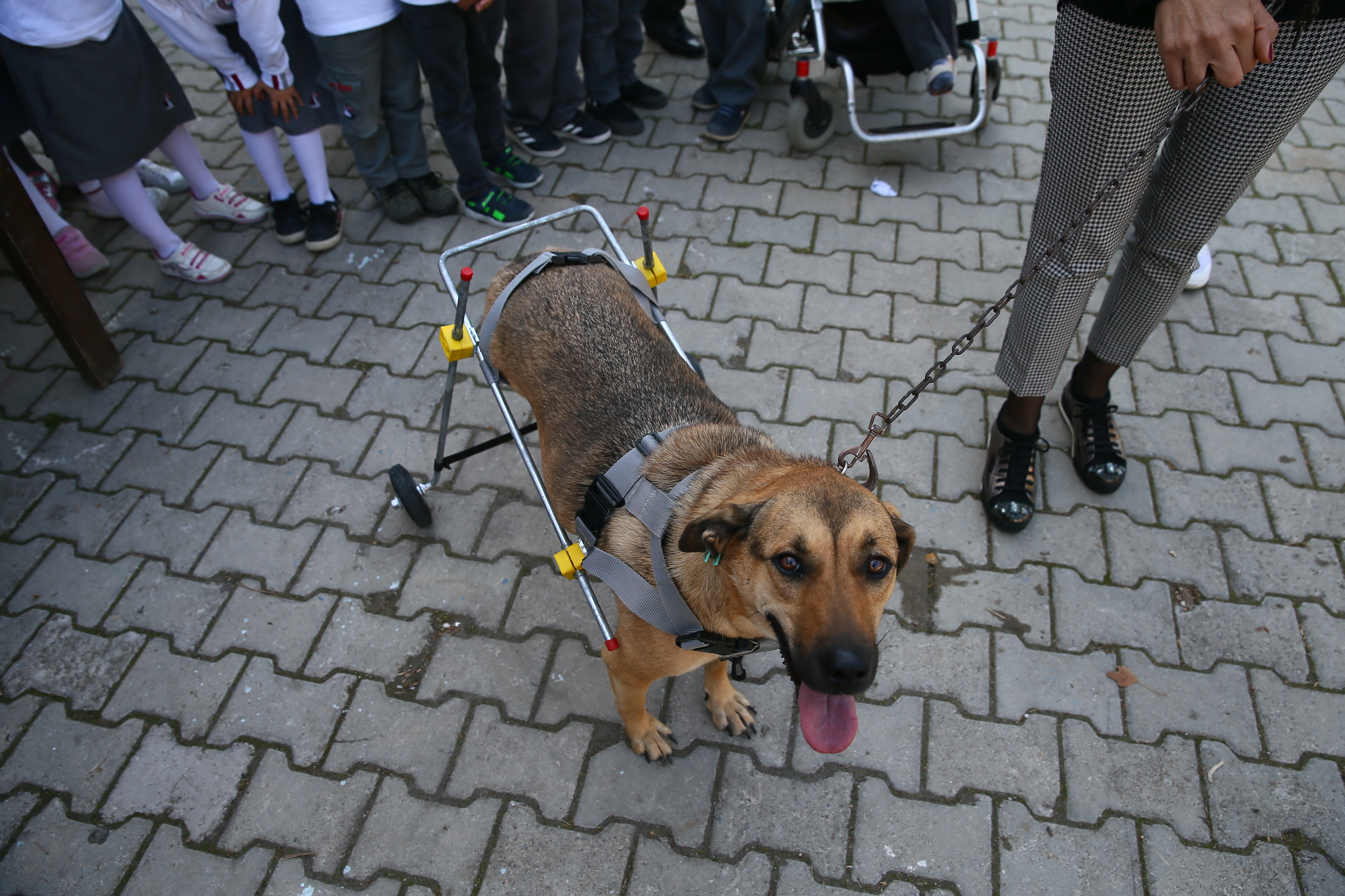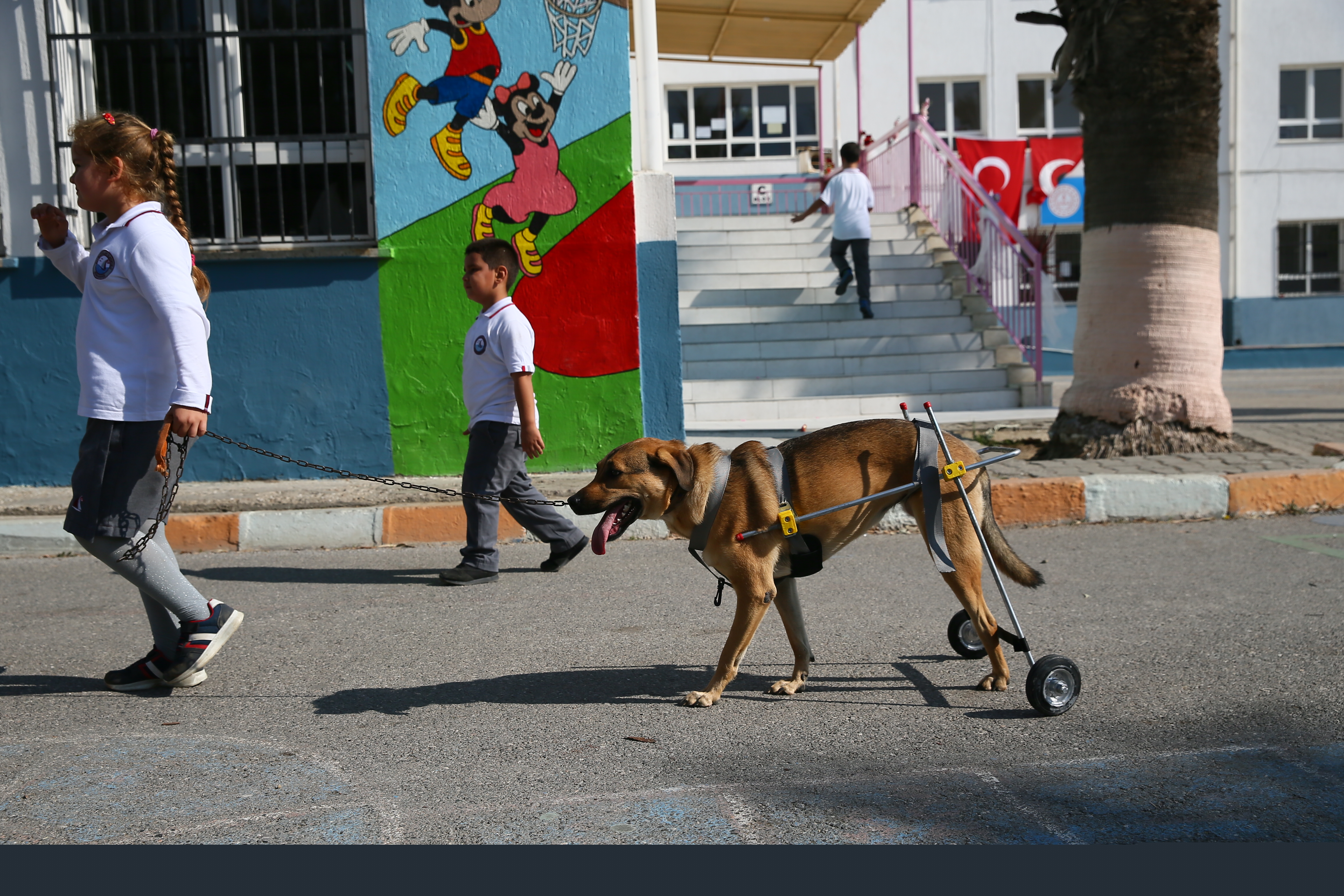 Öğretmenin girişimleri sayesinde, aracın çarpması sonucu arka bacağı kopan "Fıstık" adlı köpek de protez yürütece kavuştu.