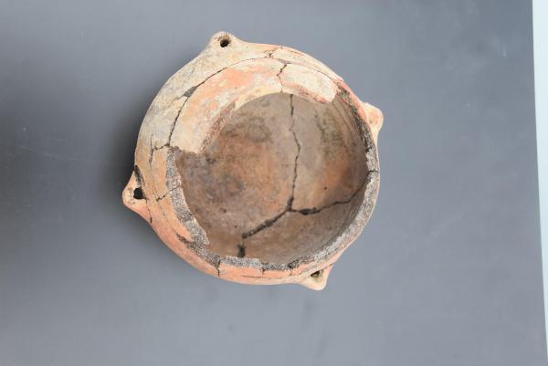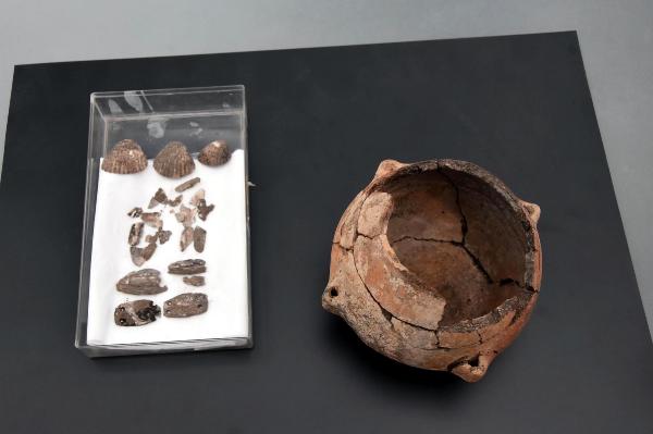 15- 20 santimetre uzunluğunda, iple tavana asılan, 4 kulplu bir kabın içinde deniz hayvan kabukları ve midyelerden yapılmış kolyeler bulduk.