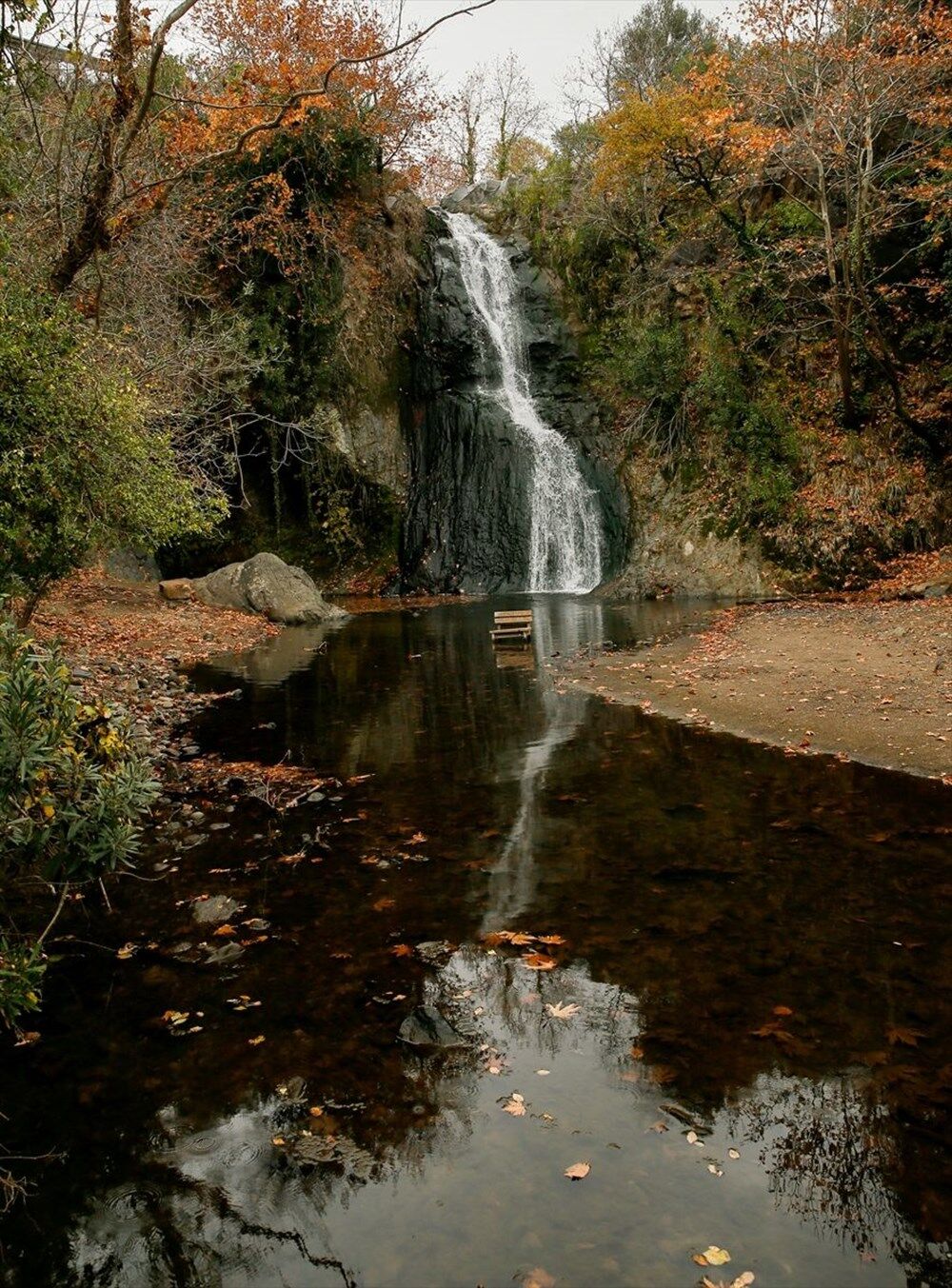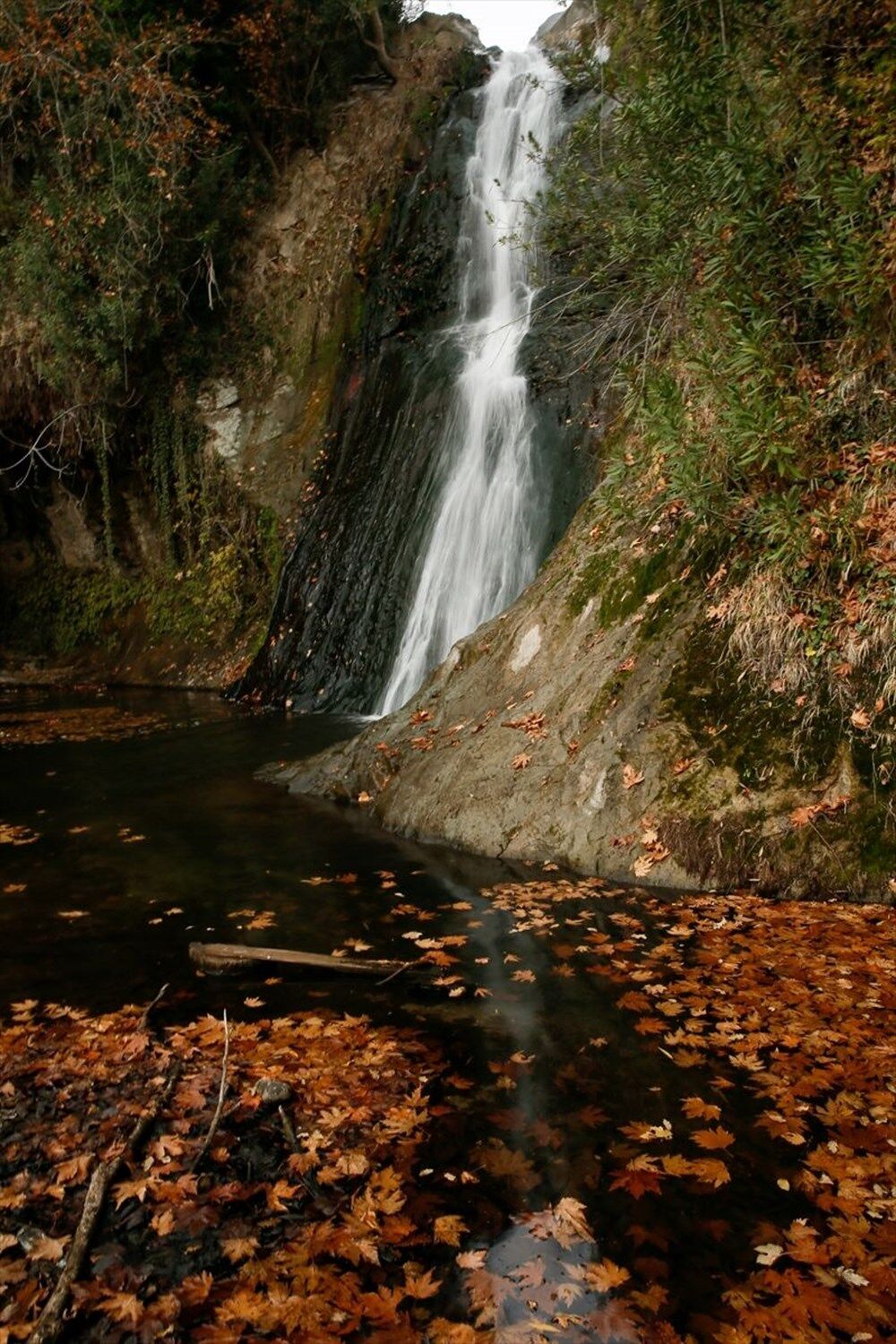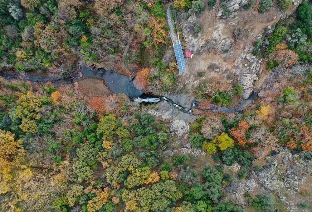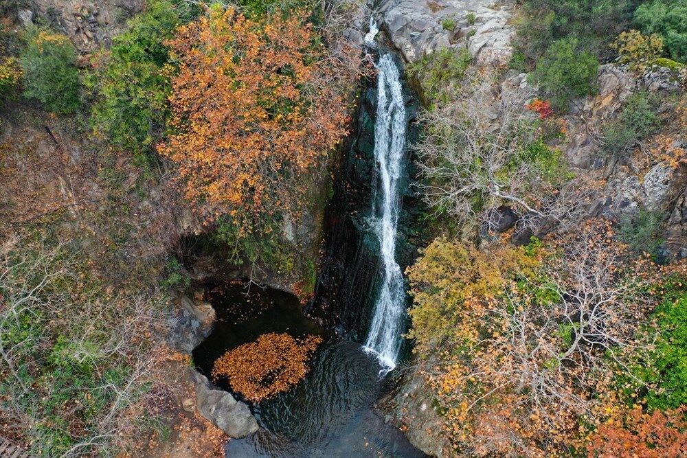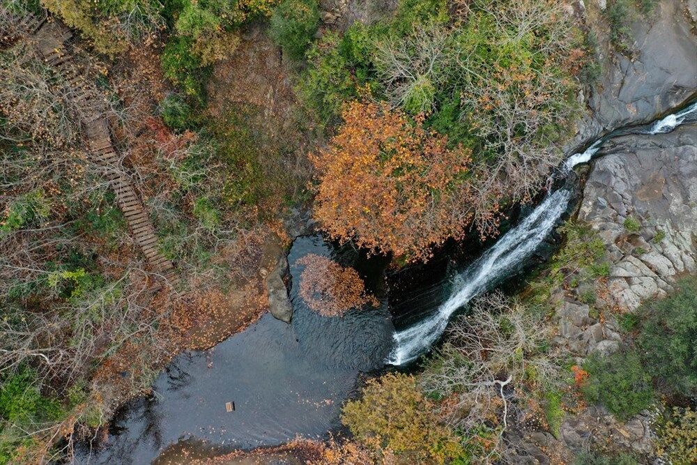 İzmir'in Dikili ilçesindeki Aşıklar Şelalesi'nde, yeşilden kızıla dönen ağaçlar, eşsiz manzaralar oluşturuyor.