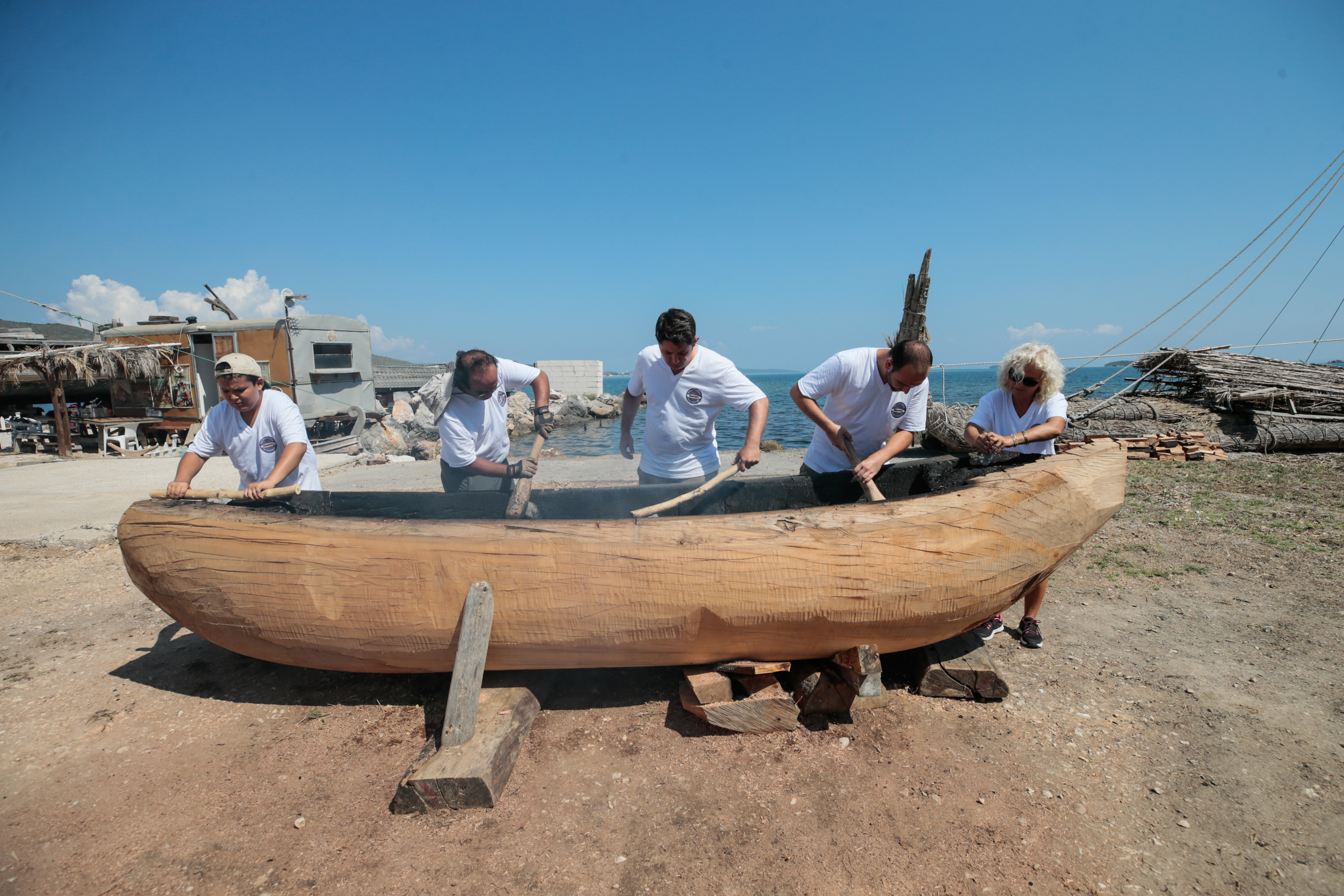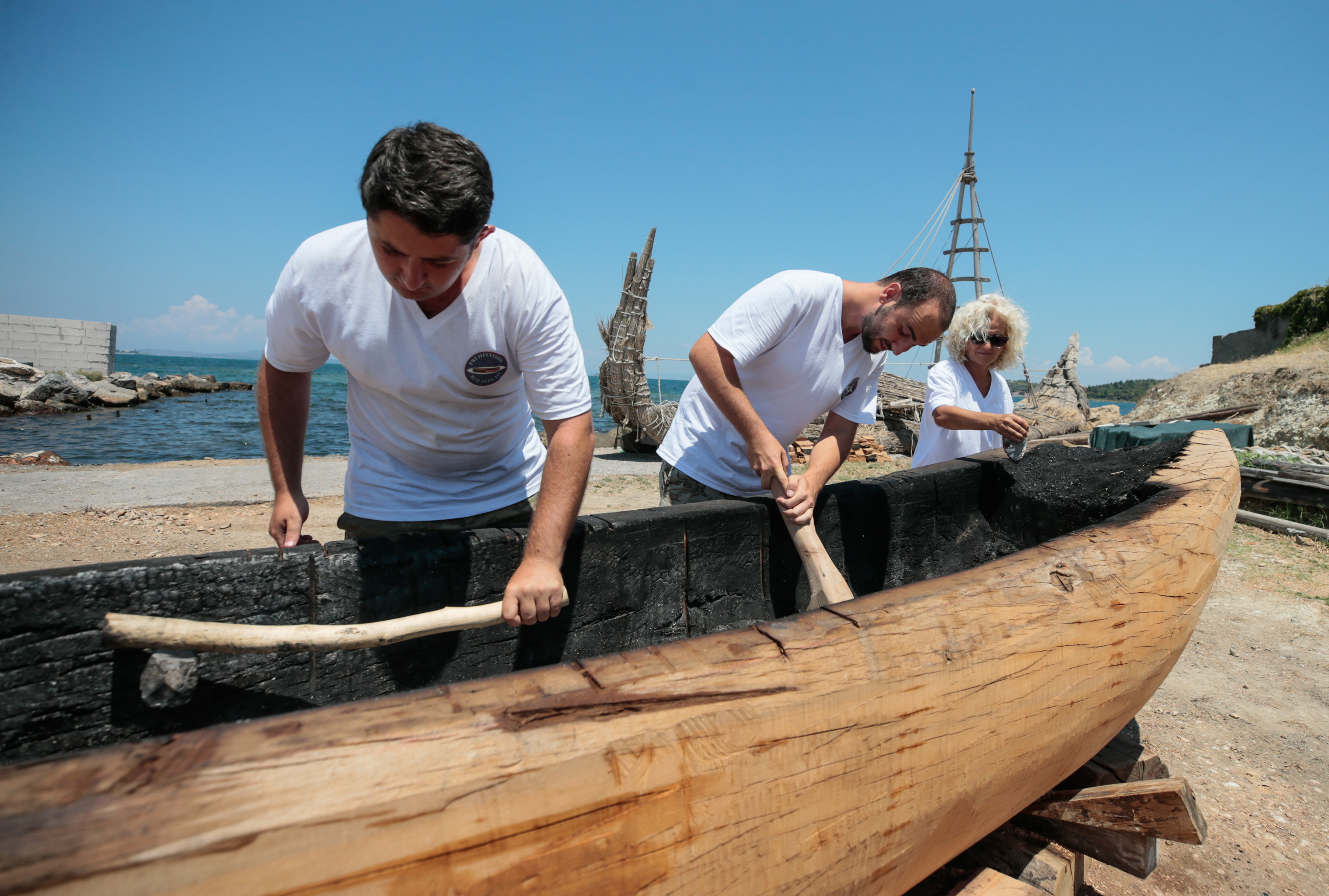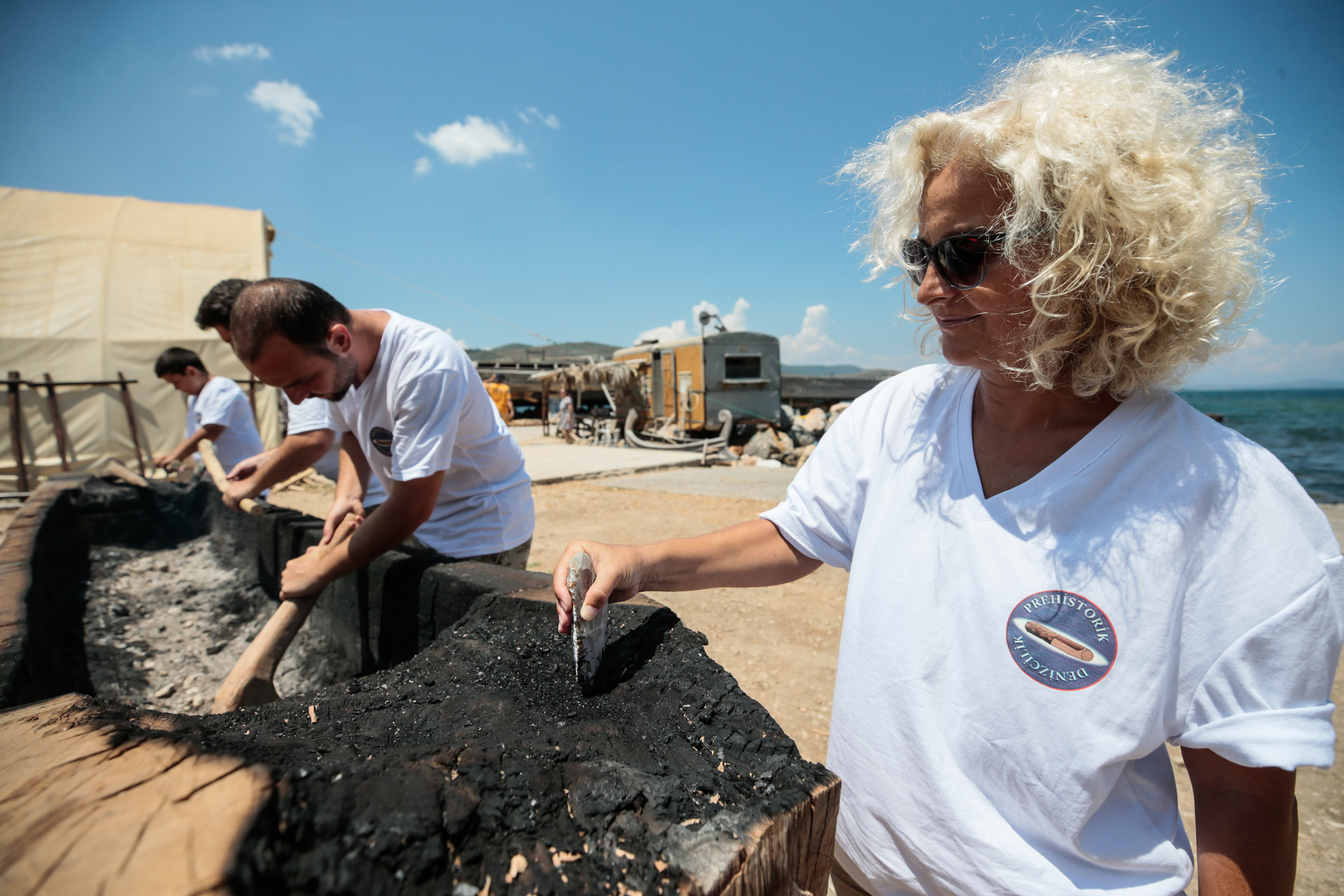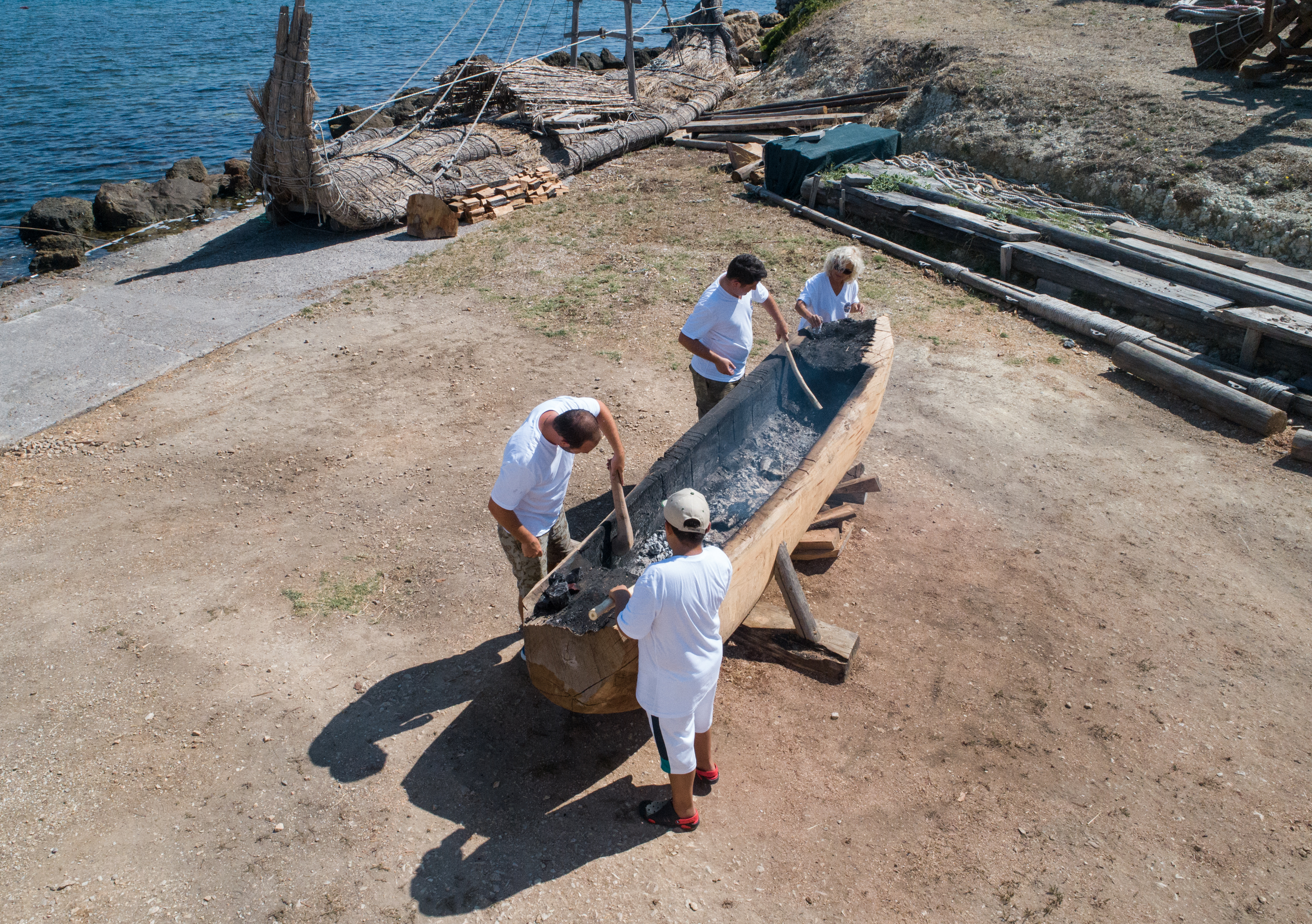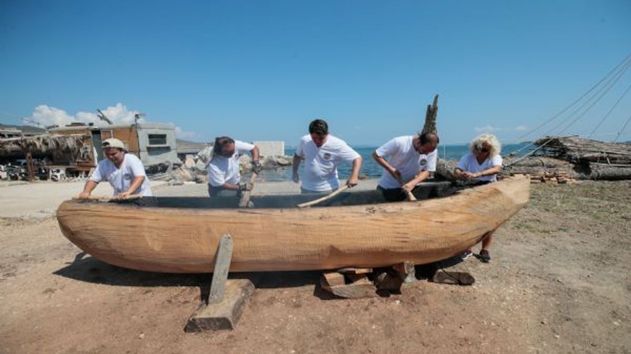 İzmir'in Urla ilçesinde başlatılan bir deneysel arkeoloji projesi kapsamında Cilalı Taş Devri'nde kullanılan teknikle kayın ağacı kütüğünün içi yakılıp keskin taşlarla oyularak "ilkel tekne" inşa ediliyor.