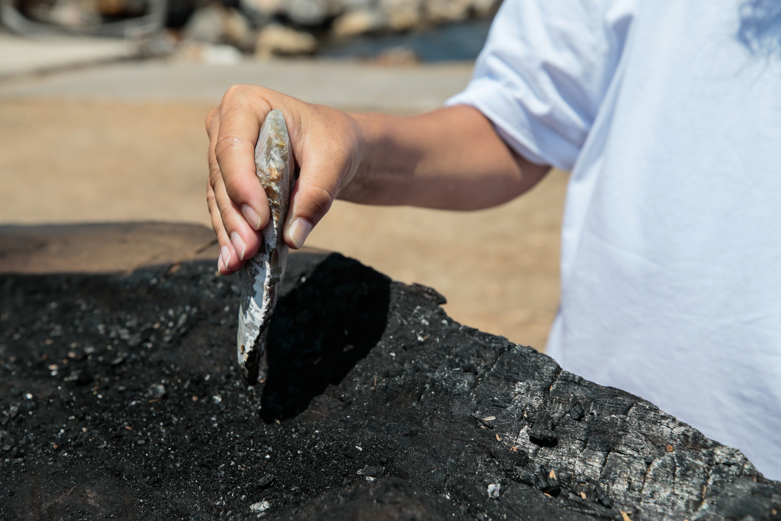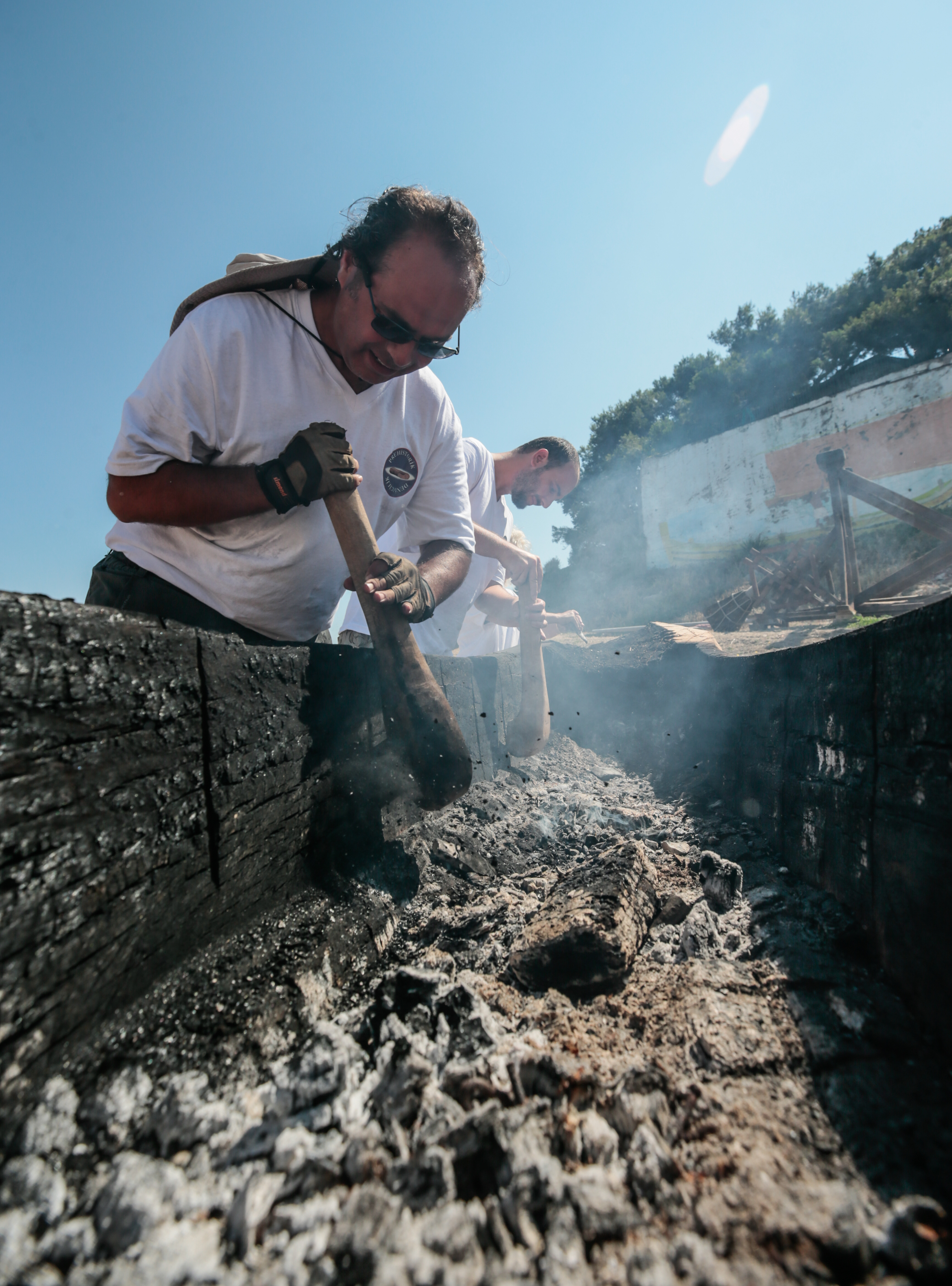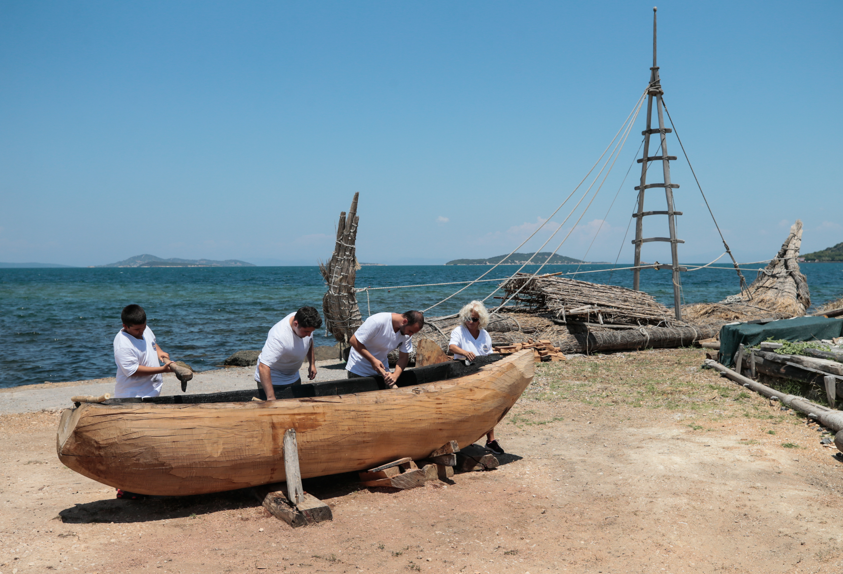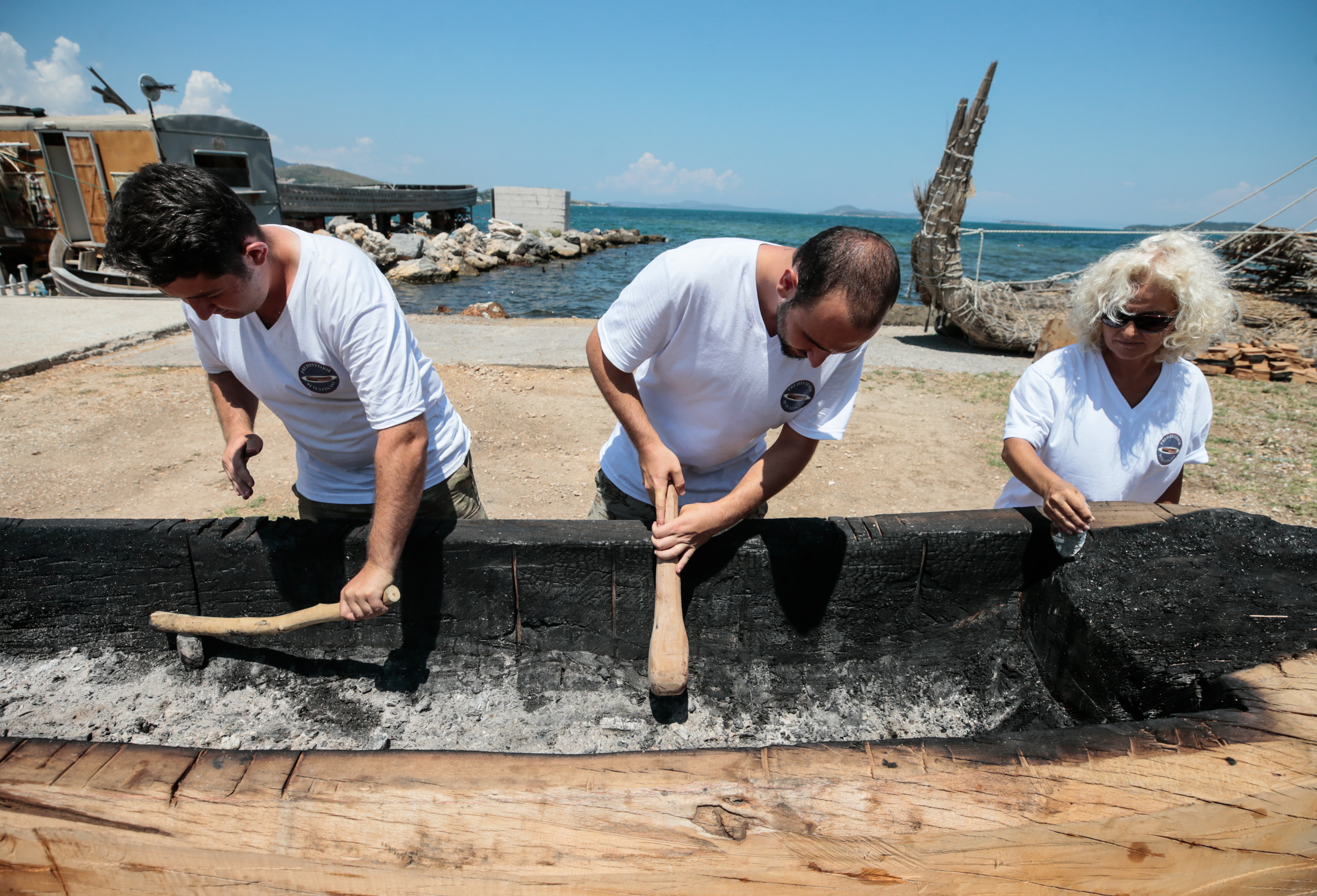 İzmir'in Urla ilçesinde başlatılan bir deneysel arkeoloji projesi kapsamında Cilalı Taş Devri'nde kullanılan teknikle kayın ağacı kütüğünün içi yakılıp keskin taşlarla oyularak "ilkel tekne" inşa ediliyor.