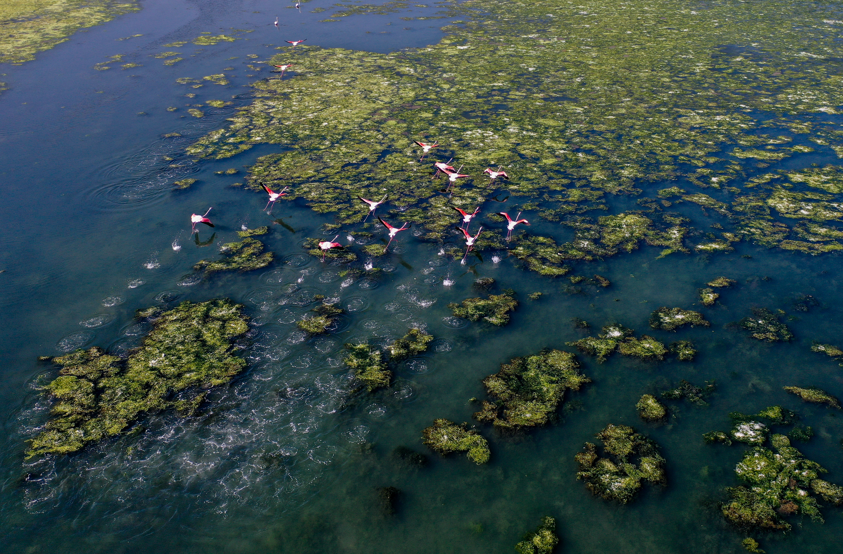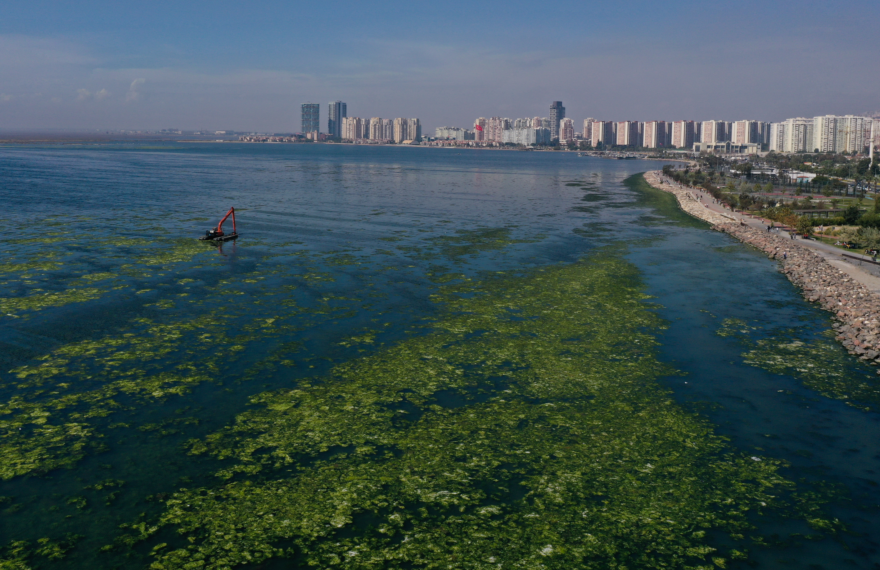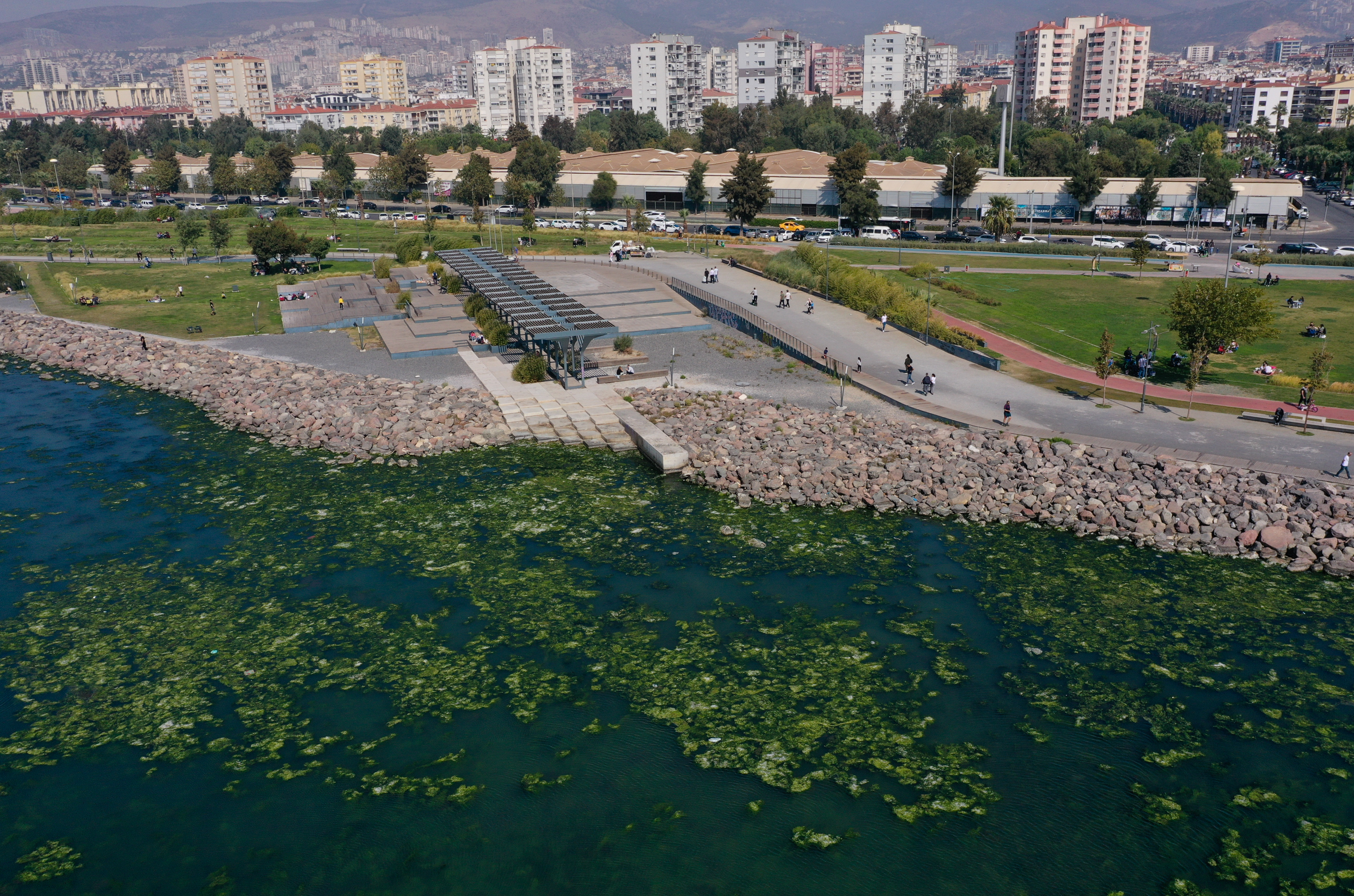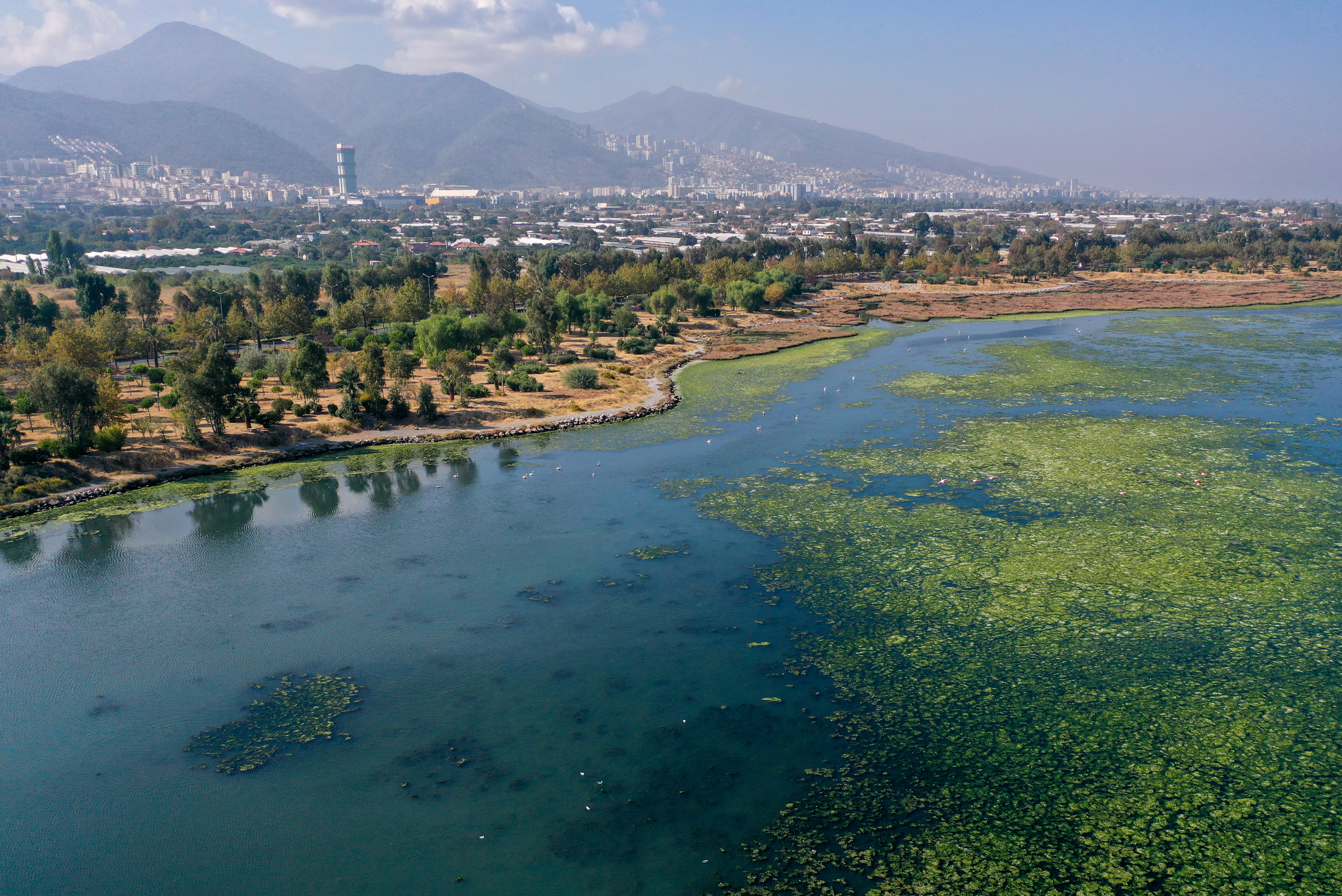İzmir Körfezinde sudaki kirliliğe bağlı azot ve fosfor miktarının artmasıyla aşırı çoğalan deniz marulları, körfezin kuzey kıyısının yanı sıra güneyde de çok sayıda kuşa ev sahipliği yapan lagünü yeşile bürüdü.
