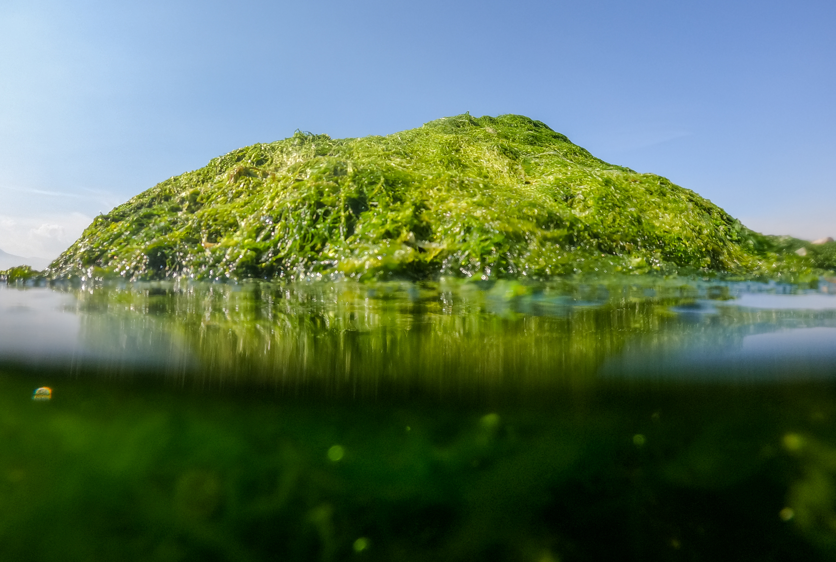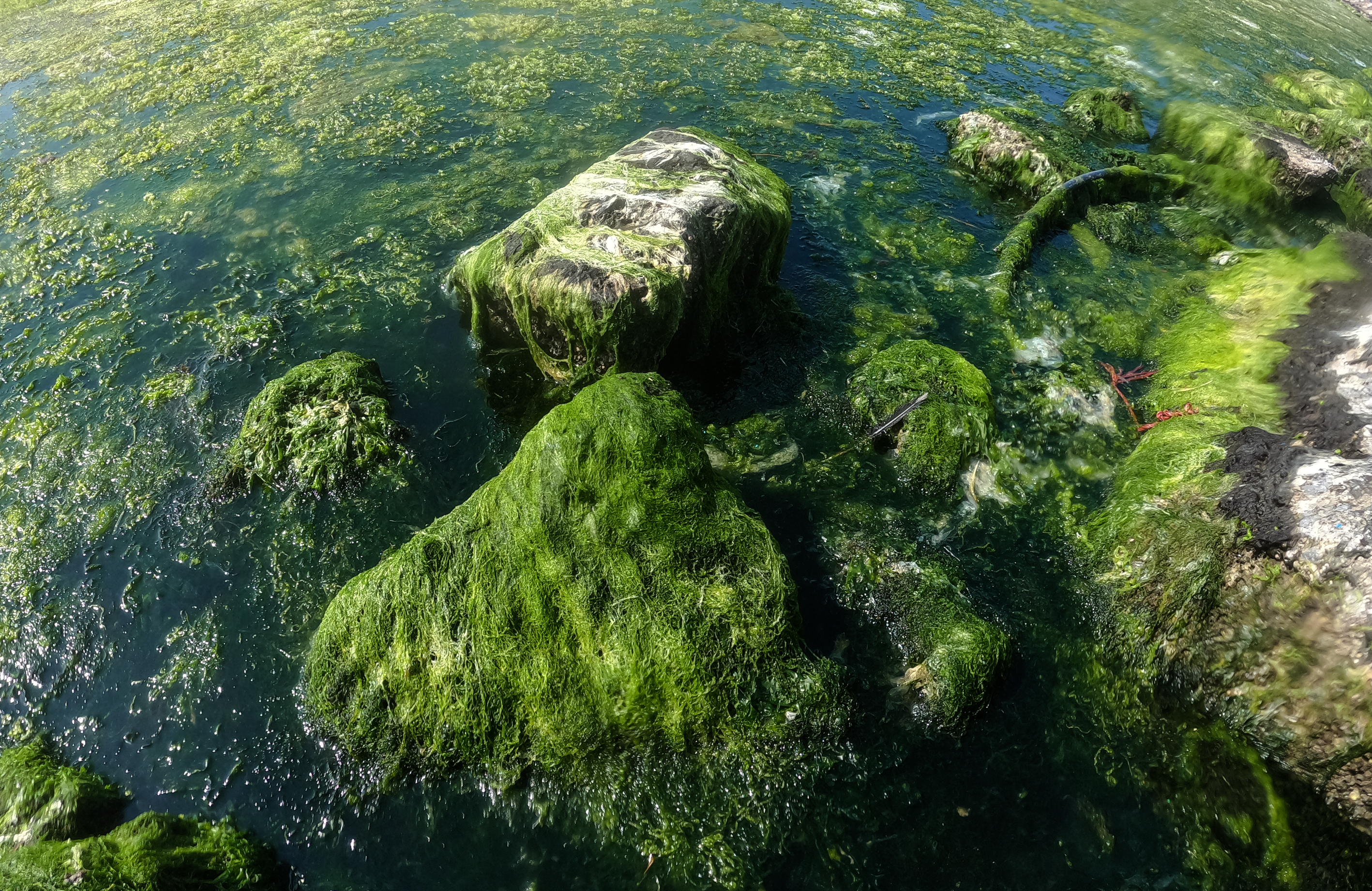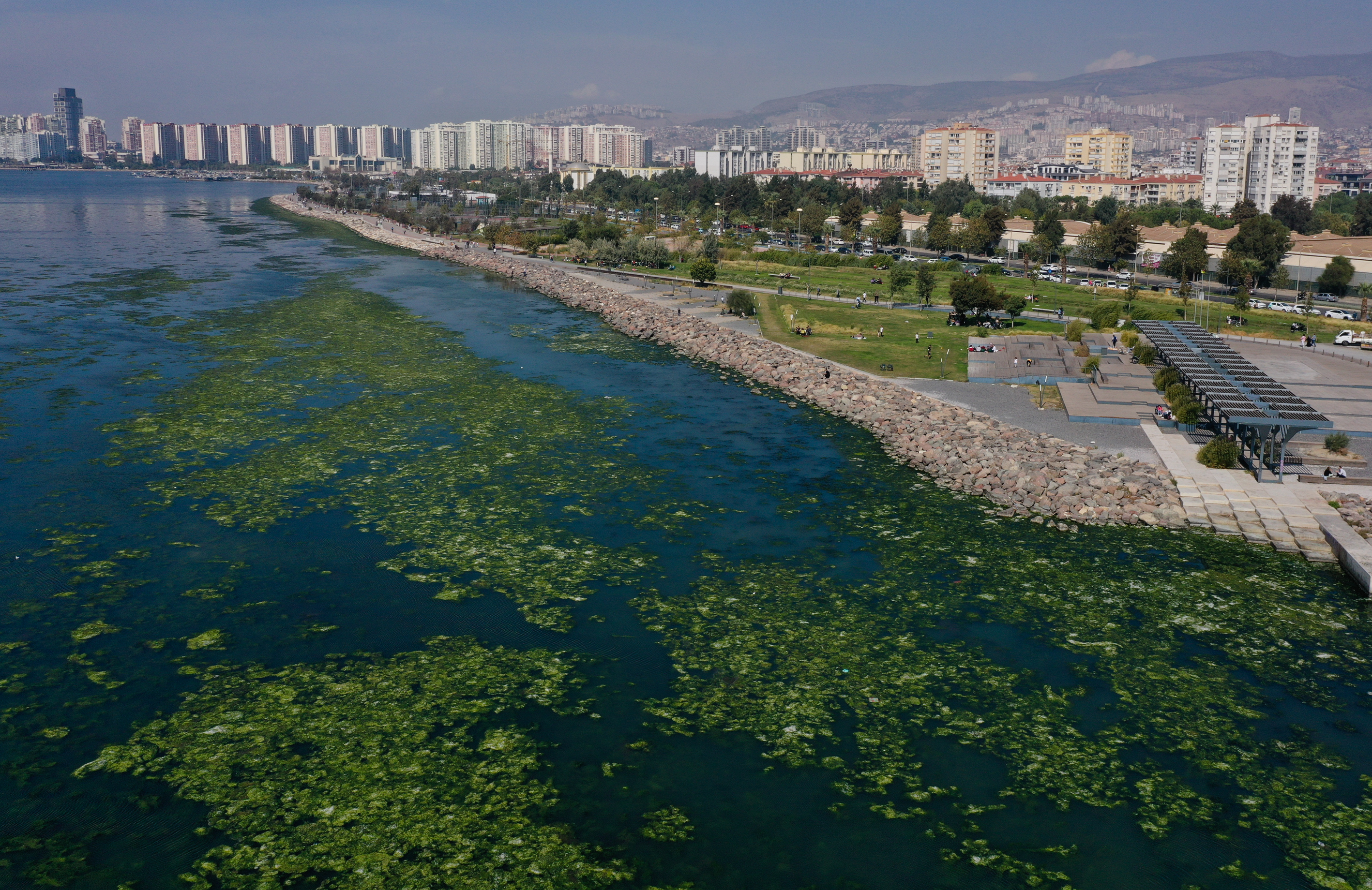 Karşıyaka ilçesindeki Bostanlı sahilinde kıyıya yakın noktalar, "deniz marulu" adı verilen yeşil renkli deniz yosunlarıyla kaplandı.