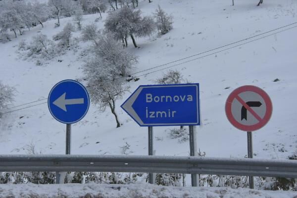 İzmir-Manisa kara yolunun Sabucubeli mevkisinde etkili olan kar yağışı kısa sürede ana arterleri beyaza bürüdü.