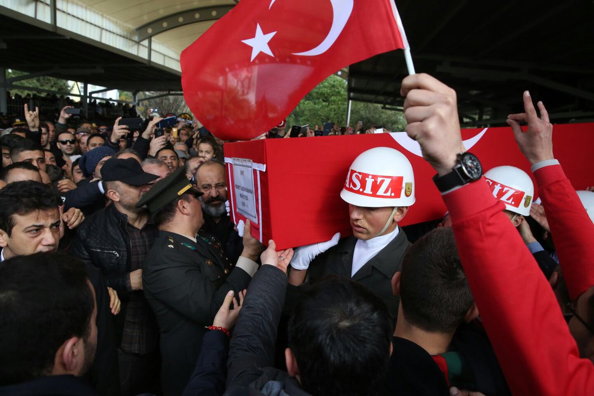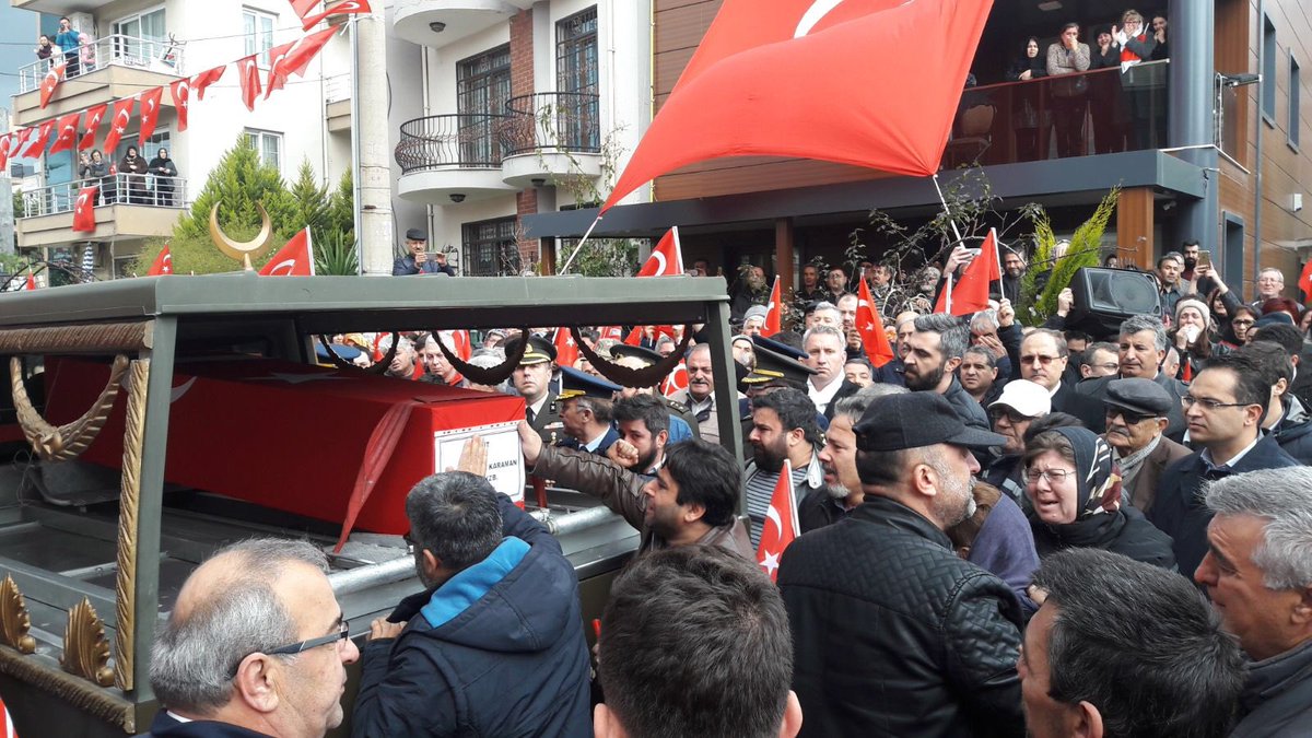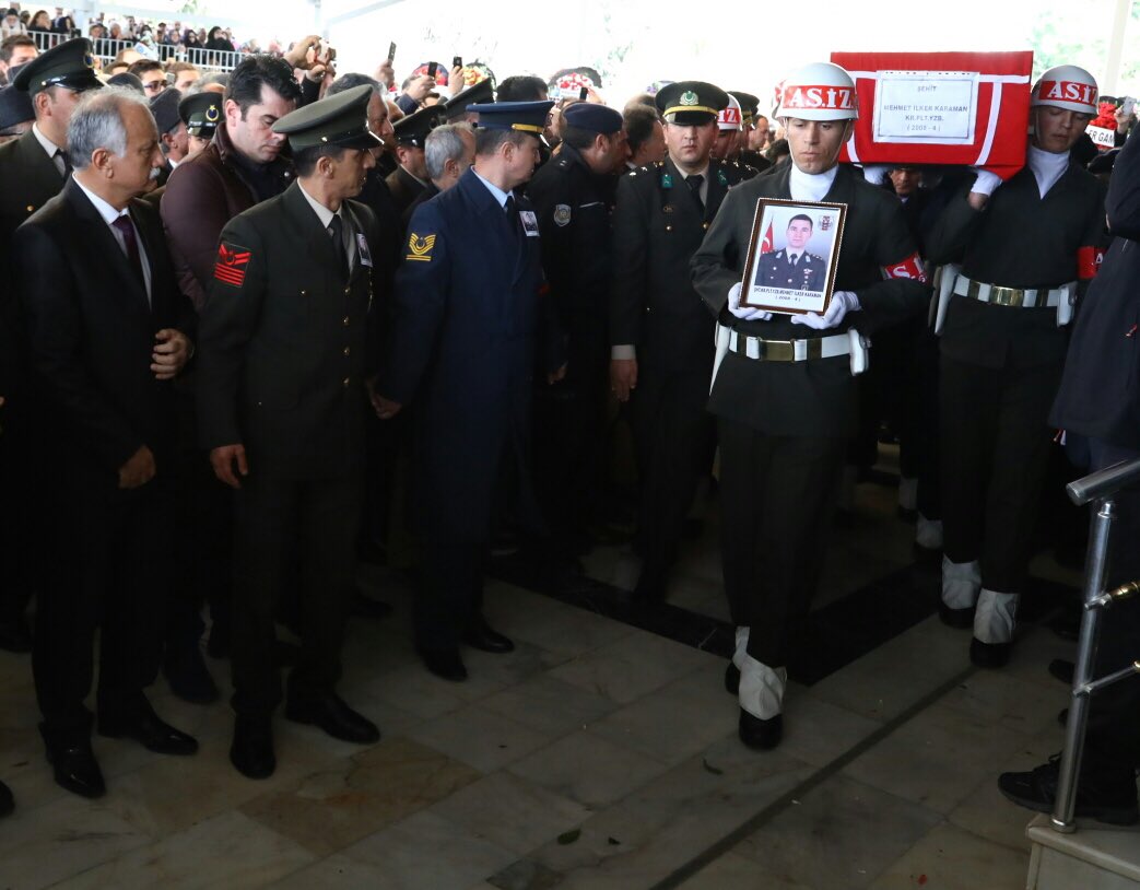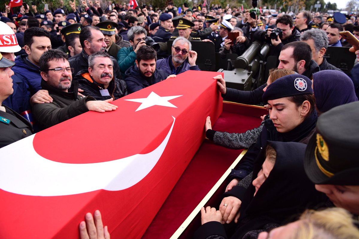 Zeytin Dalı Harekatı kapsamında Afrin’de devam eden operasyonlar sırasında kırıma uğrayan helikopterde şehit olan Şehit Kurmay Pilot Yüzbaşı Mehmet İlker Karaman ile girdiği çatışmada şehit düşen Uzman Çavuş Ali Akdoğan İzmir'de son yolculuğuna uğurlanıyor.