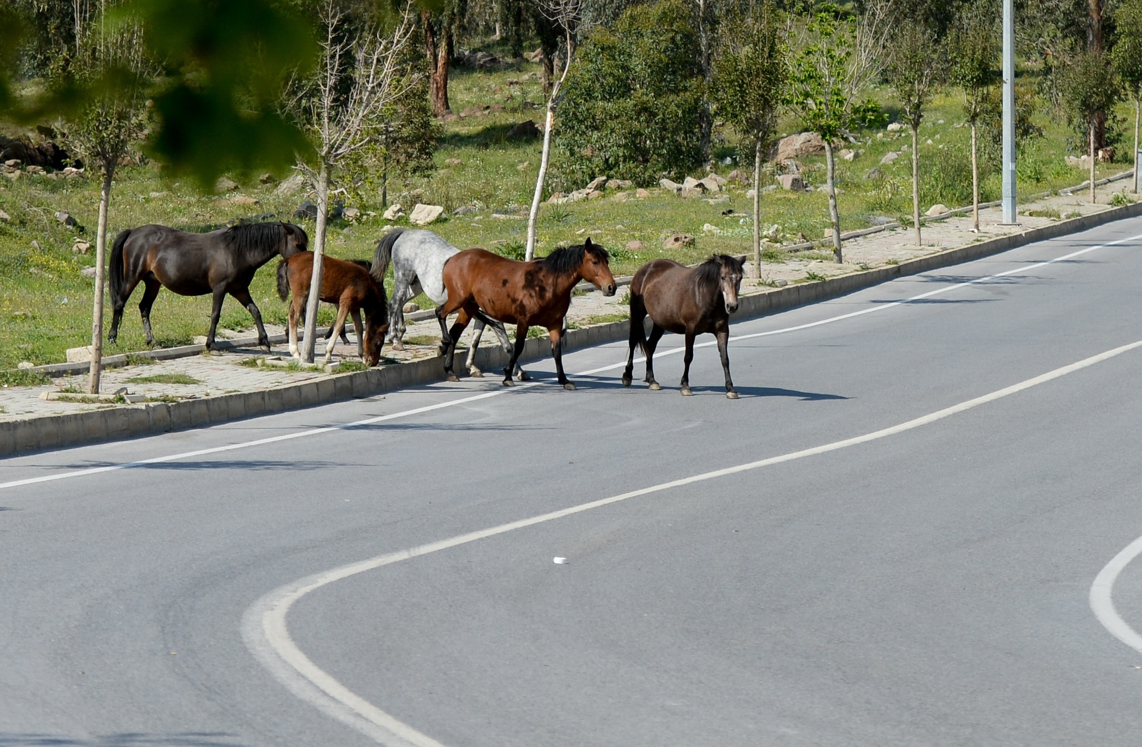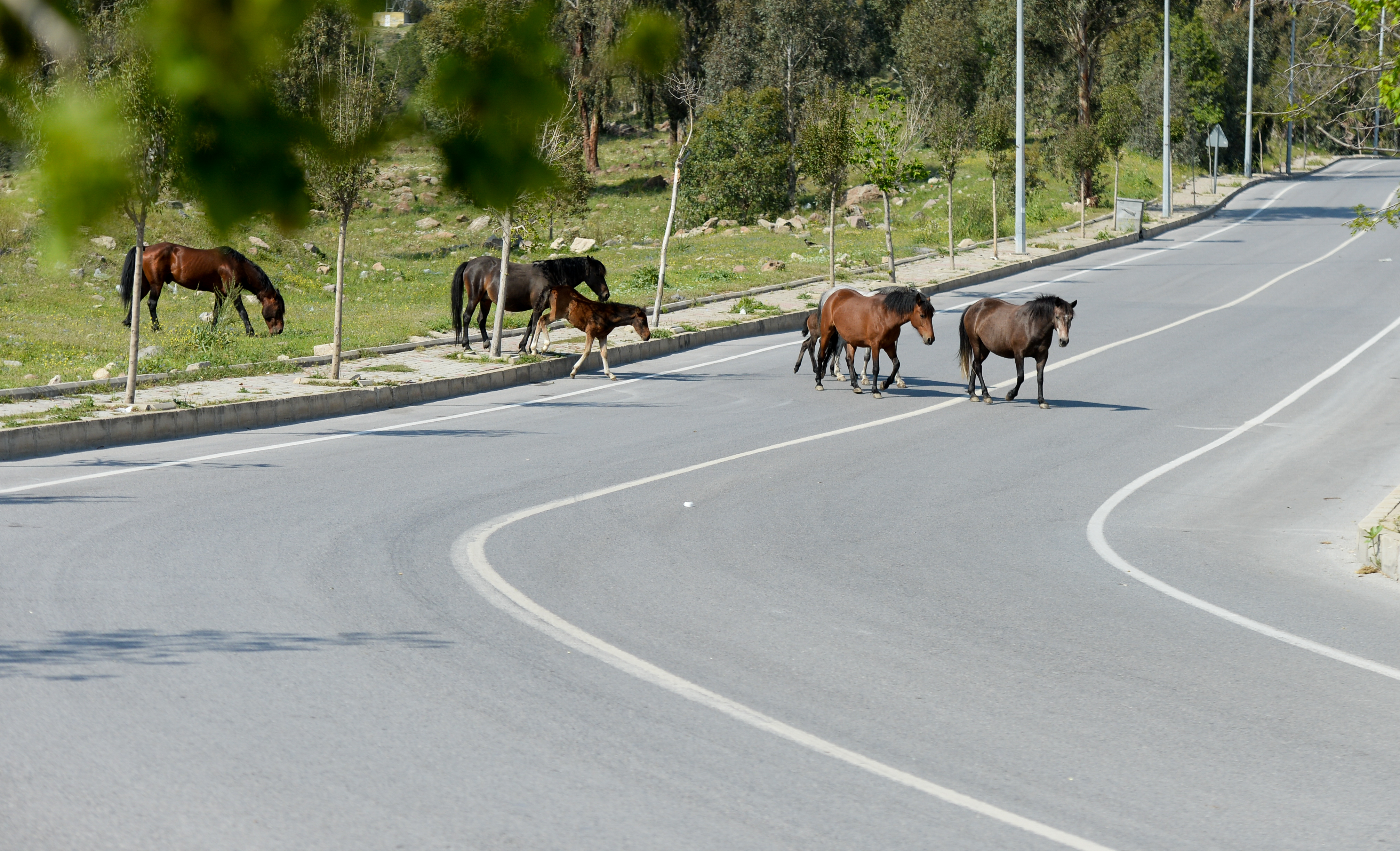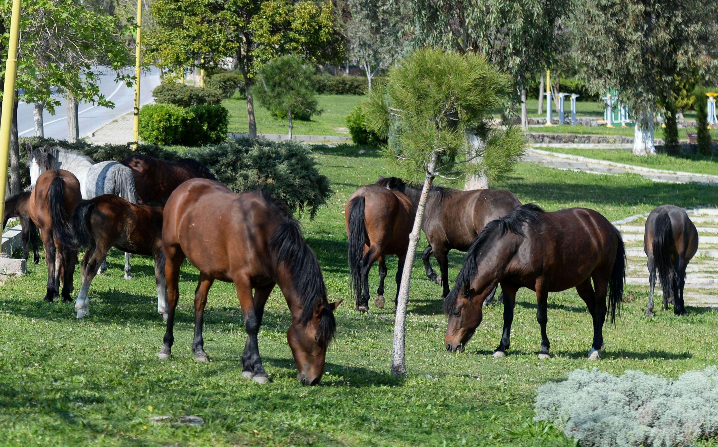 Mahalleyi çevreleyen kırsal bölgelerden geldiği değerlendirilen 2 tay ve 8 at, çim alanlarda yayıldı, boş yollarda ve kaldırımlarda yürüdü.
